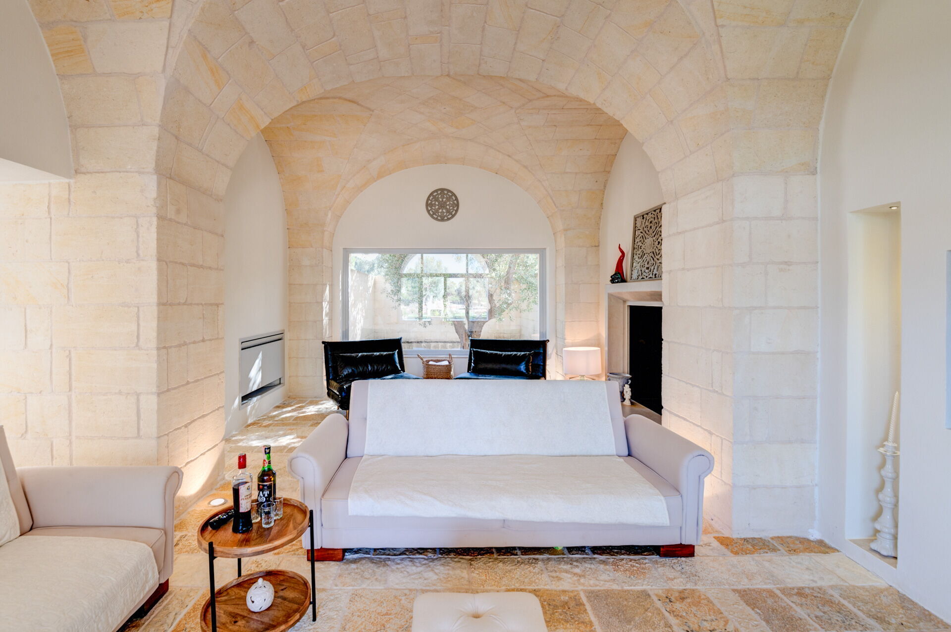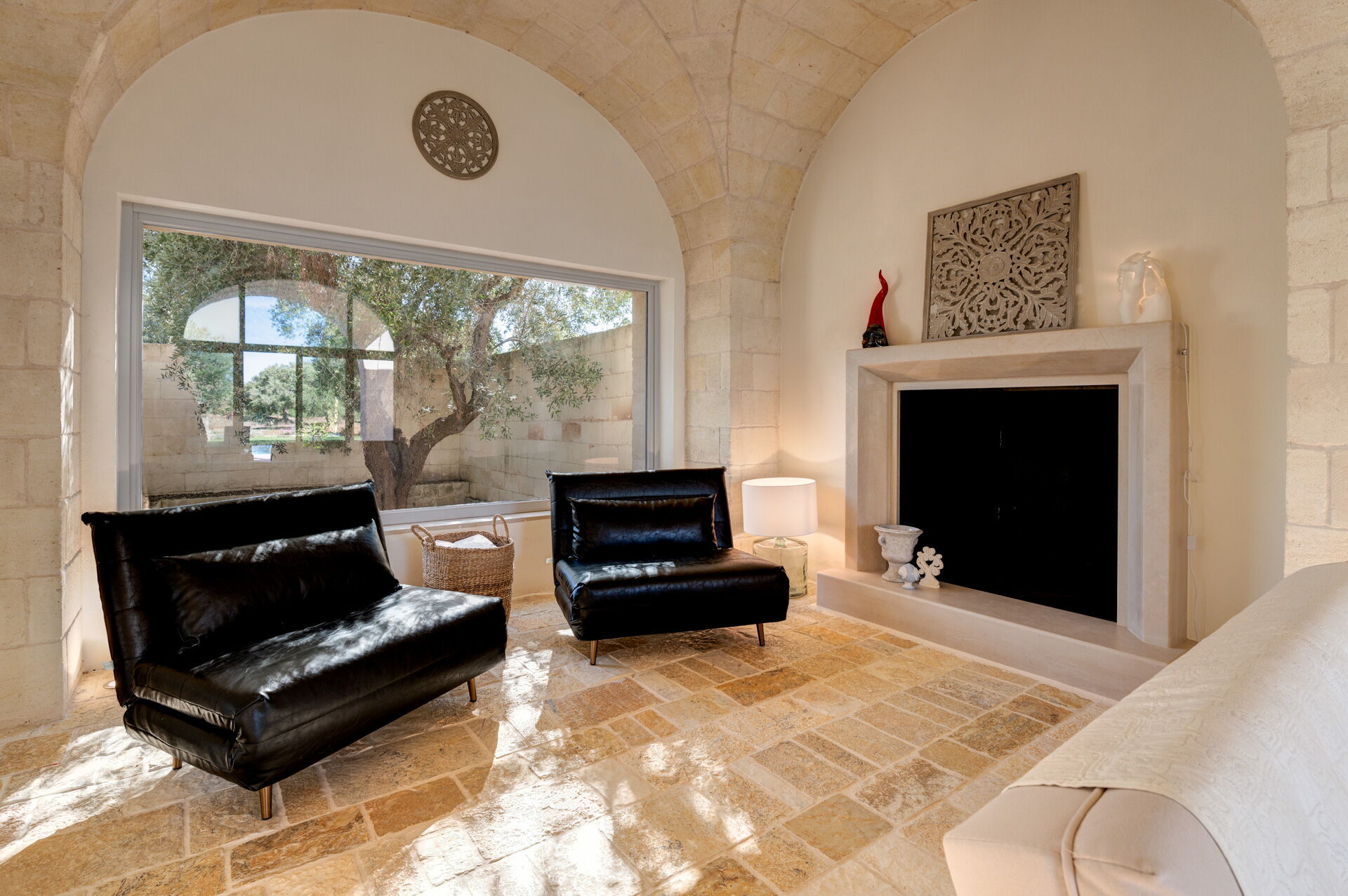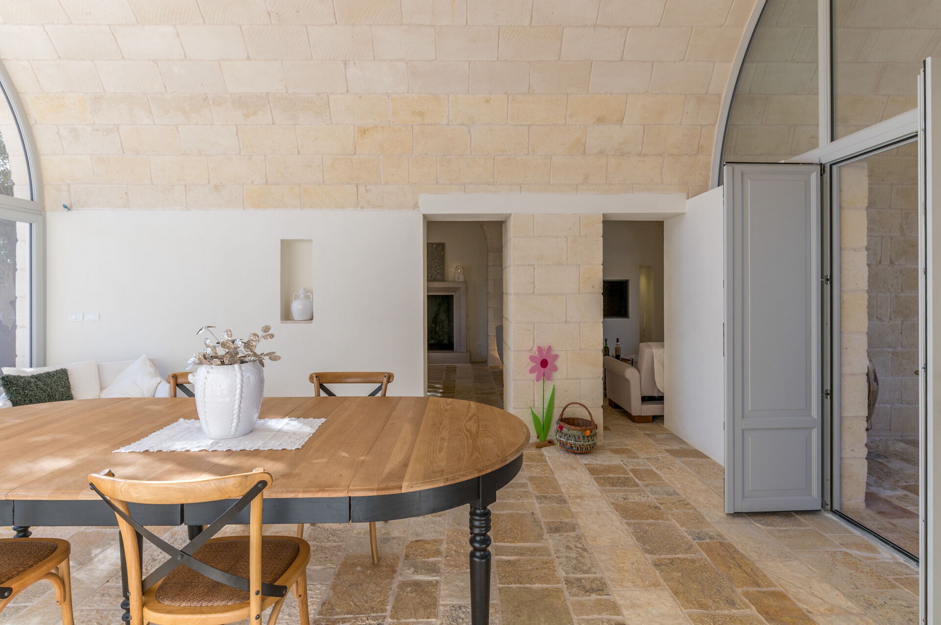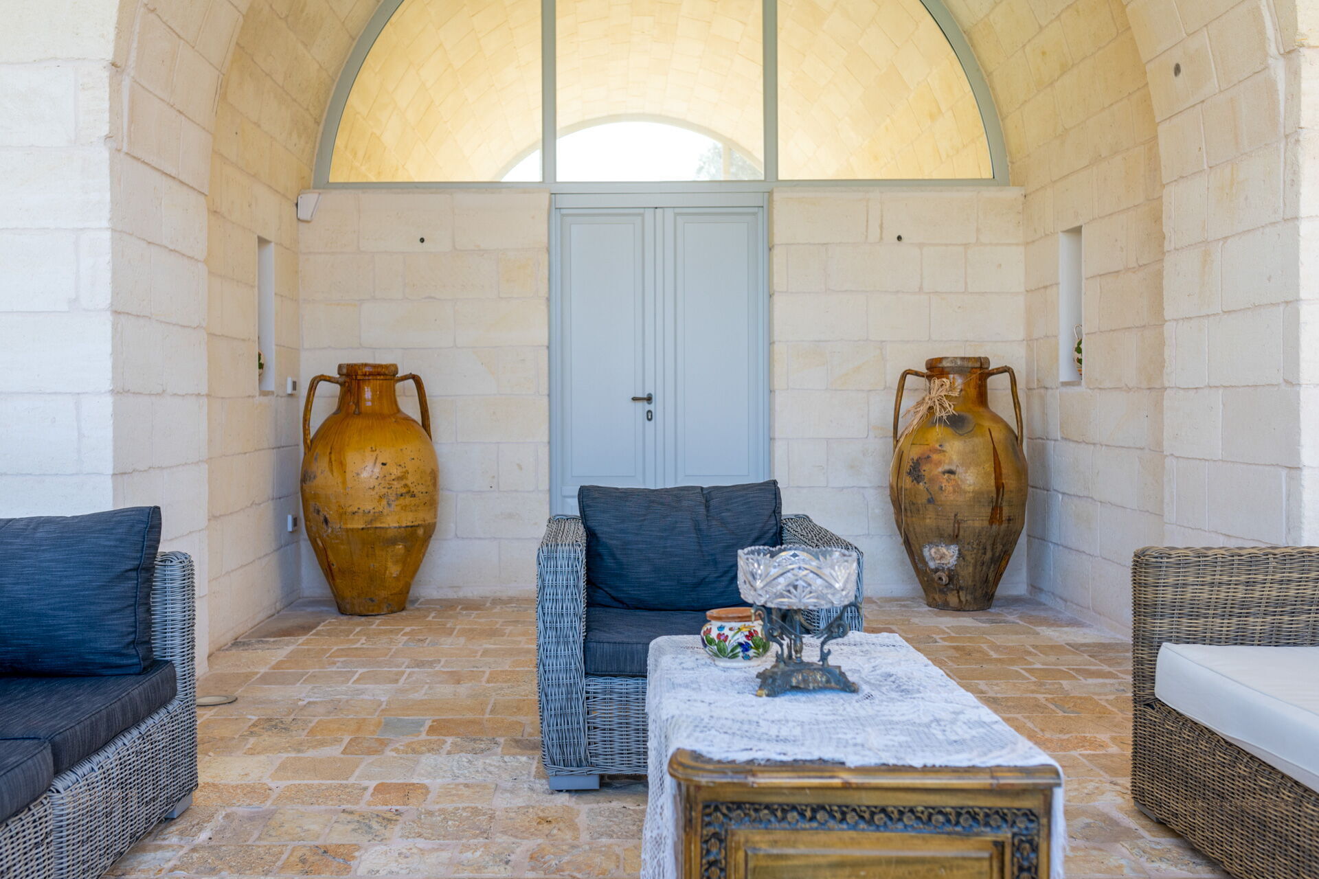 The distinguishing indoor features of this marvelous villa are its fine furnishings and light from large windows, which work perfectly with the traditional Salento architecture (vaulted ceilings, exposed stonework and white walls).