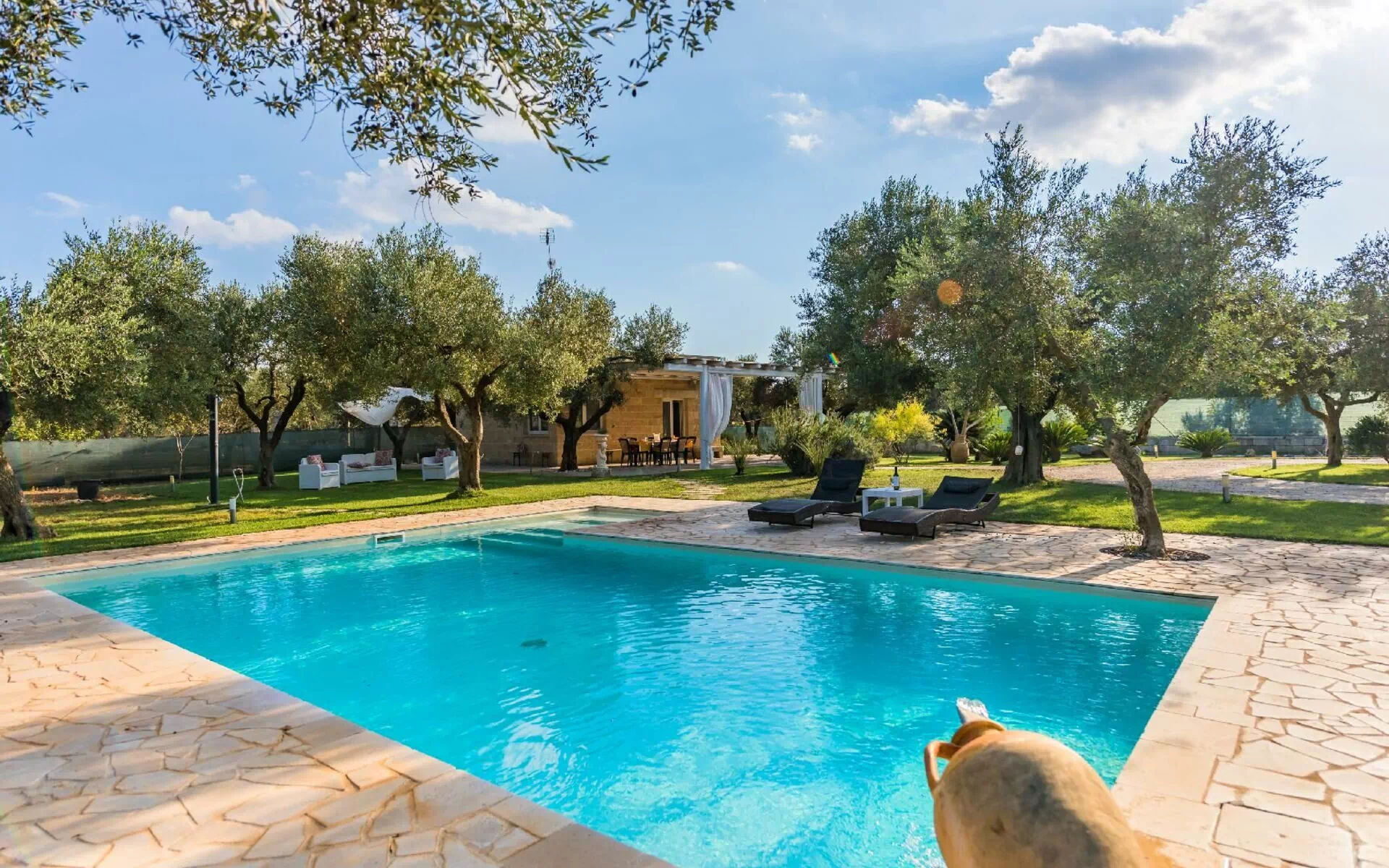 The pool is perfect for relaxing after a day of visiting the marvels of Salento. The nearby town of Carpignano Salentino is a perfect base for exploring both the Ionian and Adriatic coasts. Lecce, Otranto, Nardò and Gallipoli are all close by and make easy day trips.