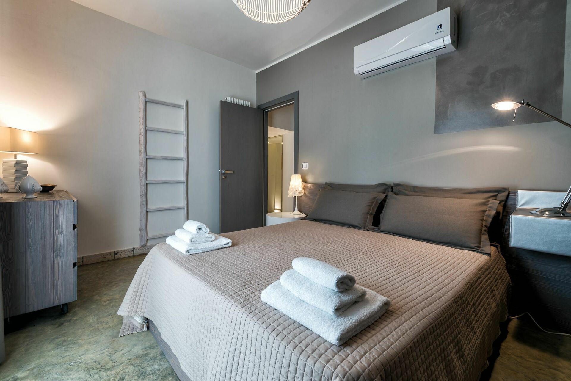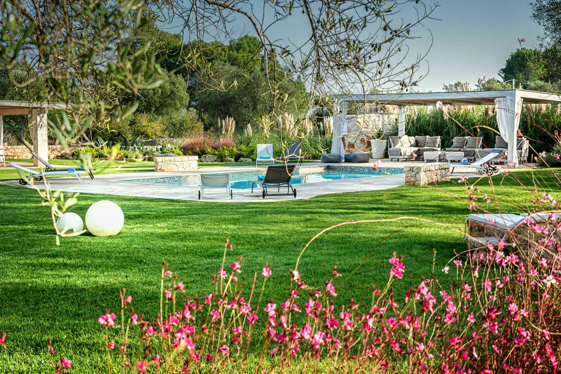 The private pool with outdoor shower is furnished with sun loungers and umbrellas for utmost relaxation and comfort.