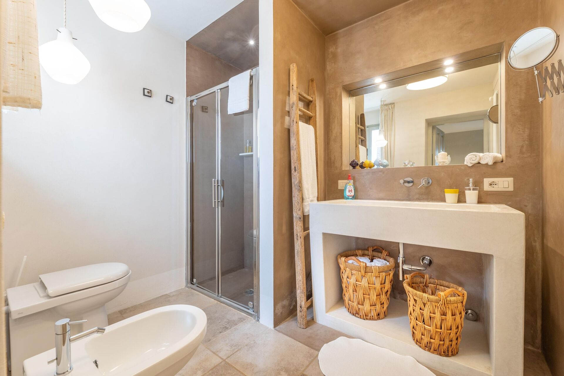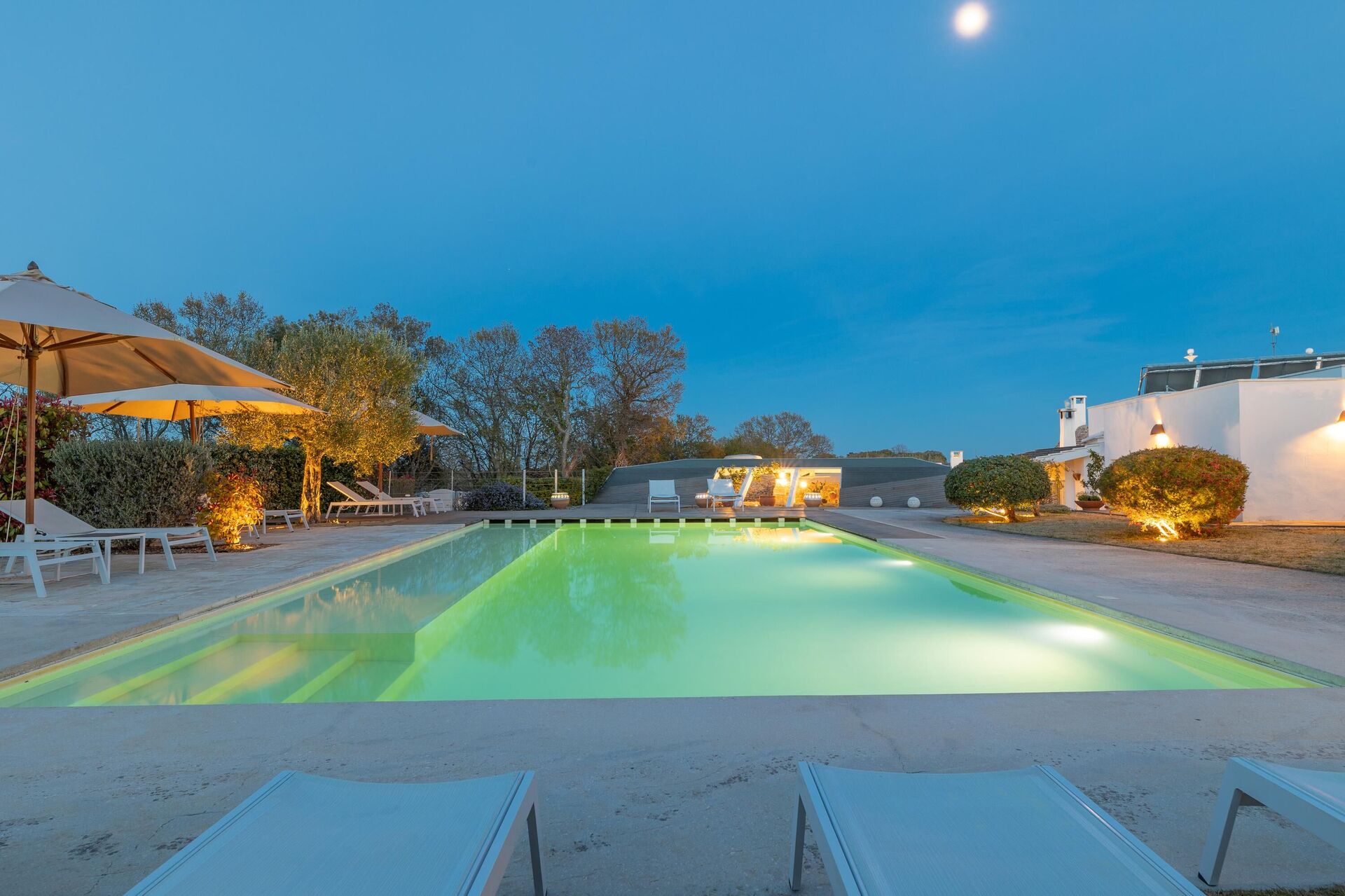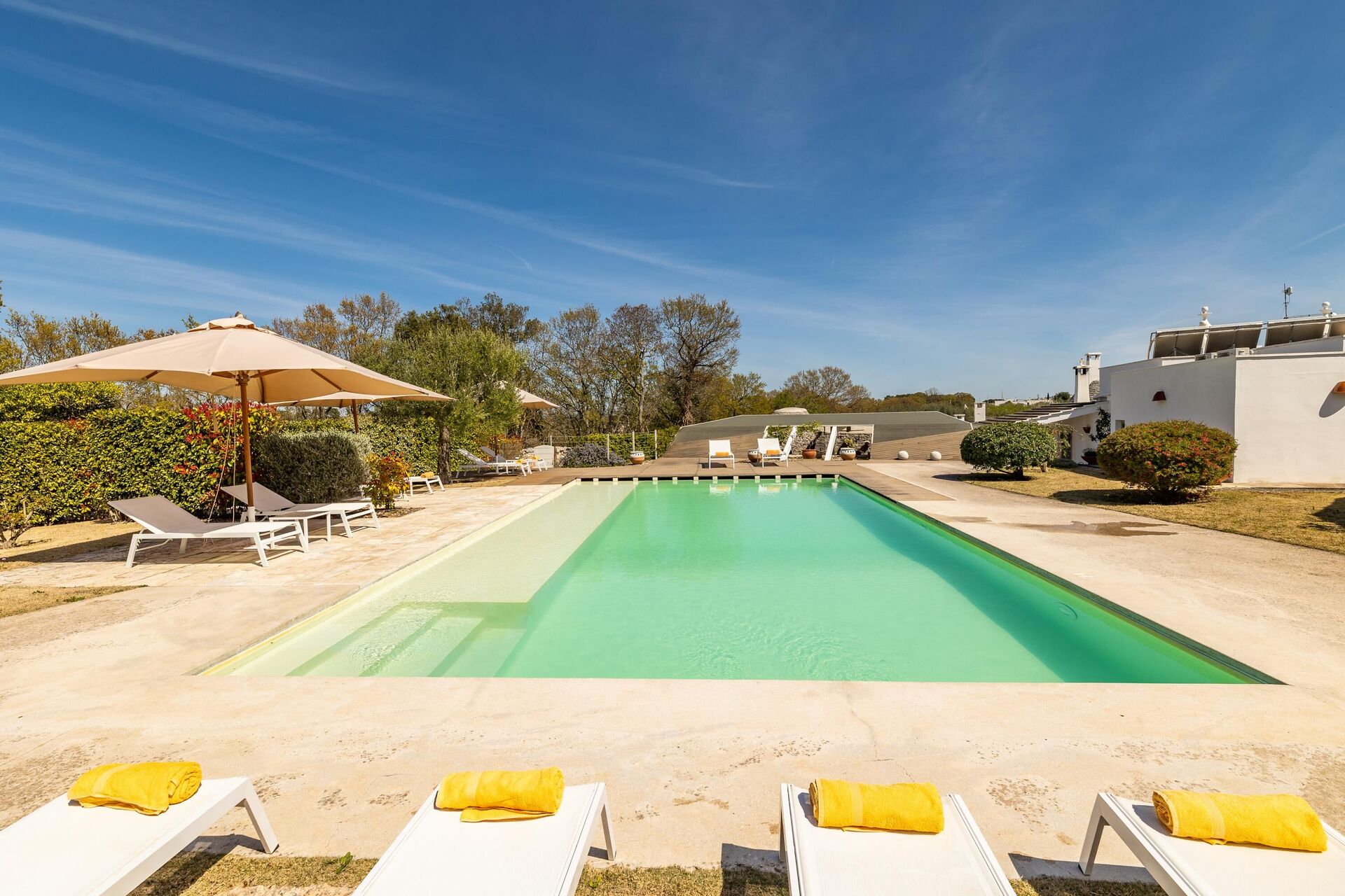 Outside, the unique villa rental is surrounded by a large garden, and also a small children’s play area. In addition to the private pool, the property offers spacious common areas for enjoying the fresh air: there is a large gazebo with a dining area; and an ultra modern pergola with a lovely relaxation area, a dining area, and a kitchen with barbecue.