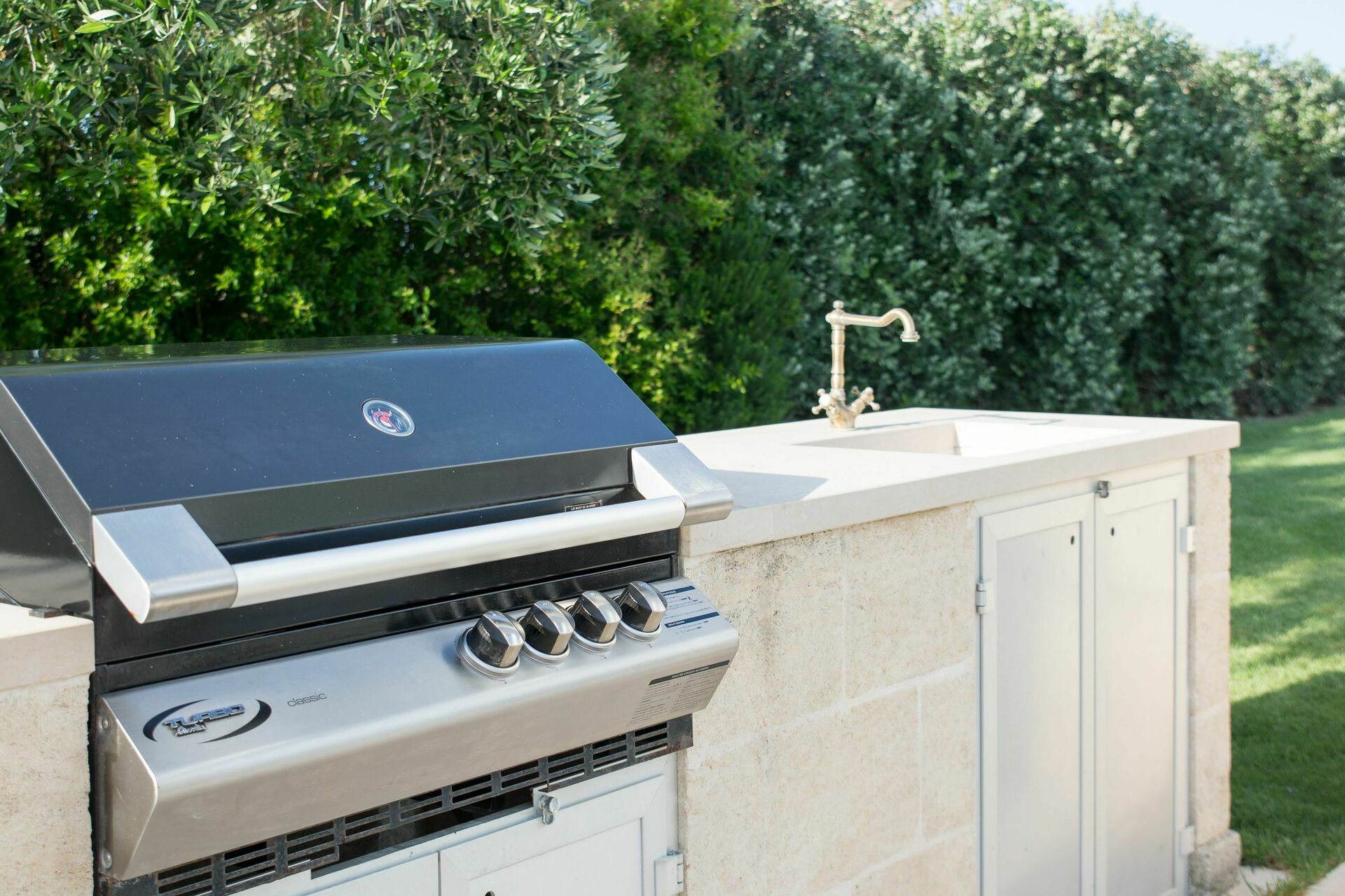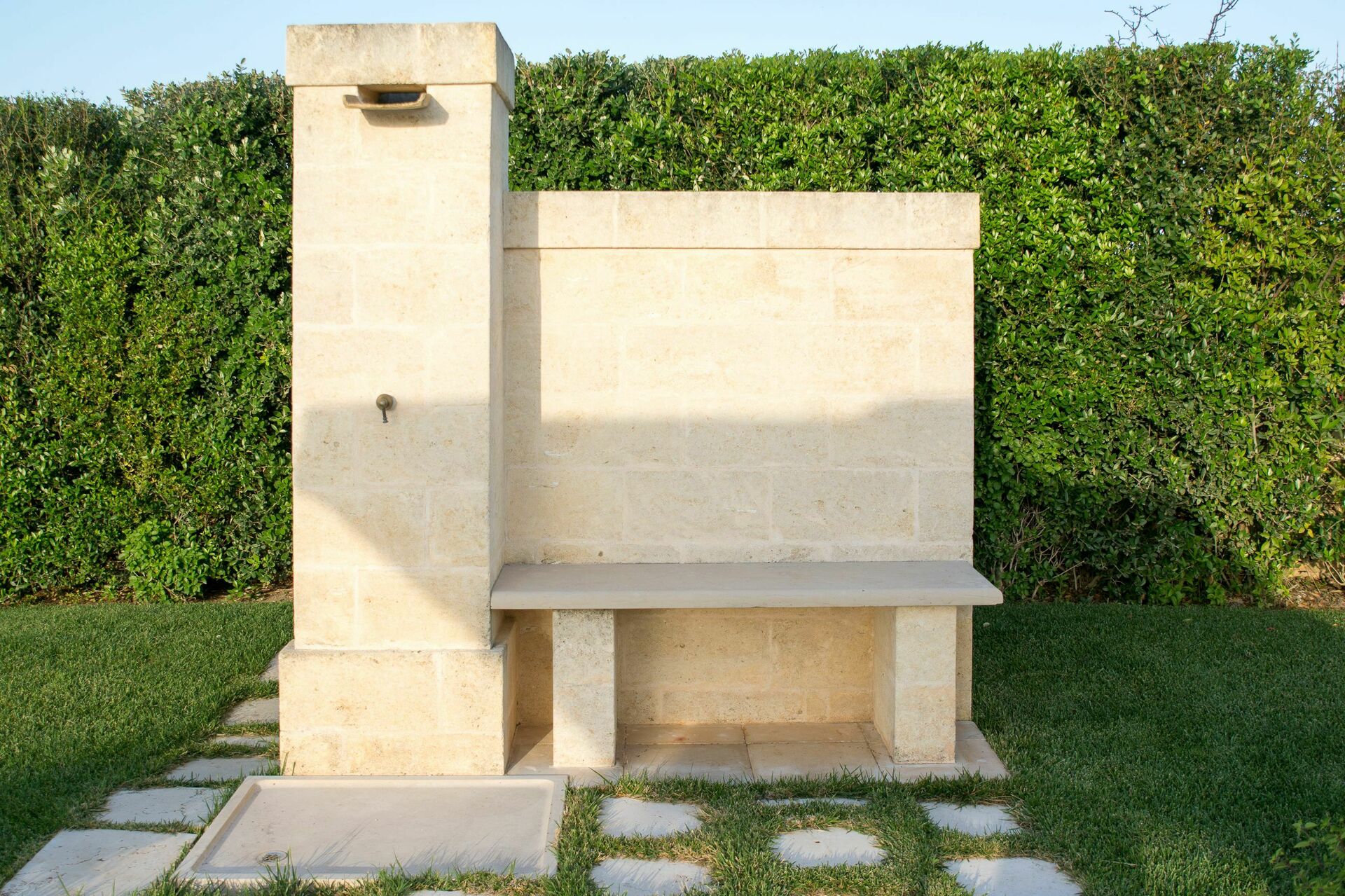 Masseria Villa il Frantoio also has marvelous exteriors. The large garden is lined by a beautiful hedge and offers an elegant private pool with a curved shallow section. The pool can be heated upon request for an extra charge. There are sun loungers and umbrellas by the pool for relaxing and taking in the scents and sun of Apulia. A well-tended green lawn surrounds the villa and pool, and has paths that connect the house to the various outdoor areas, as well as native Salento plants.