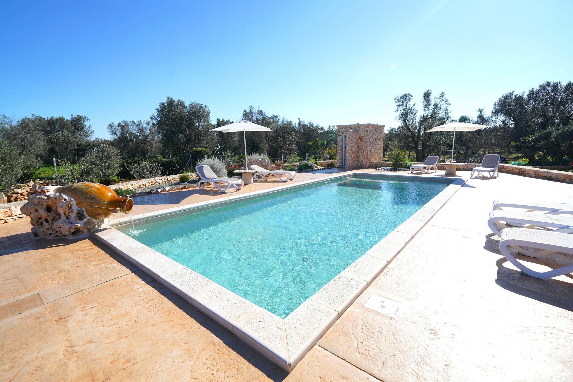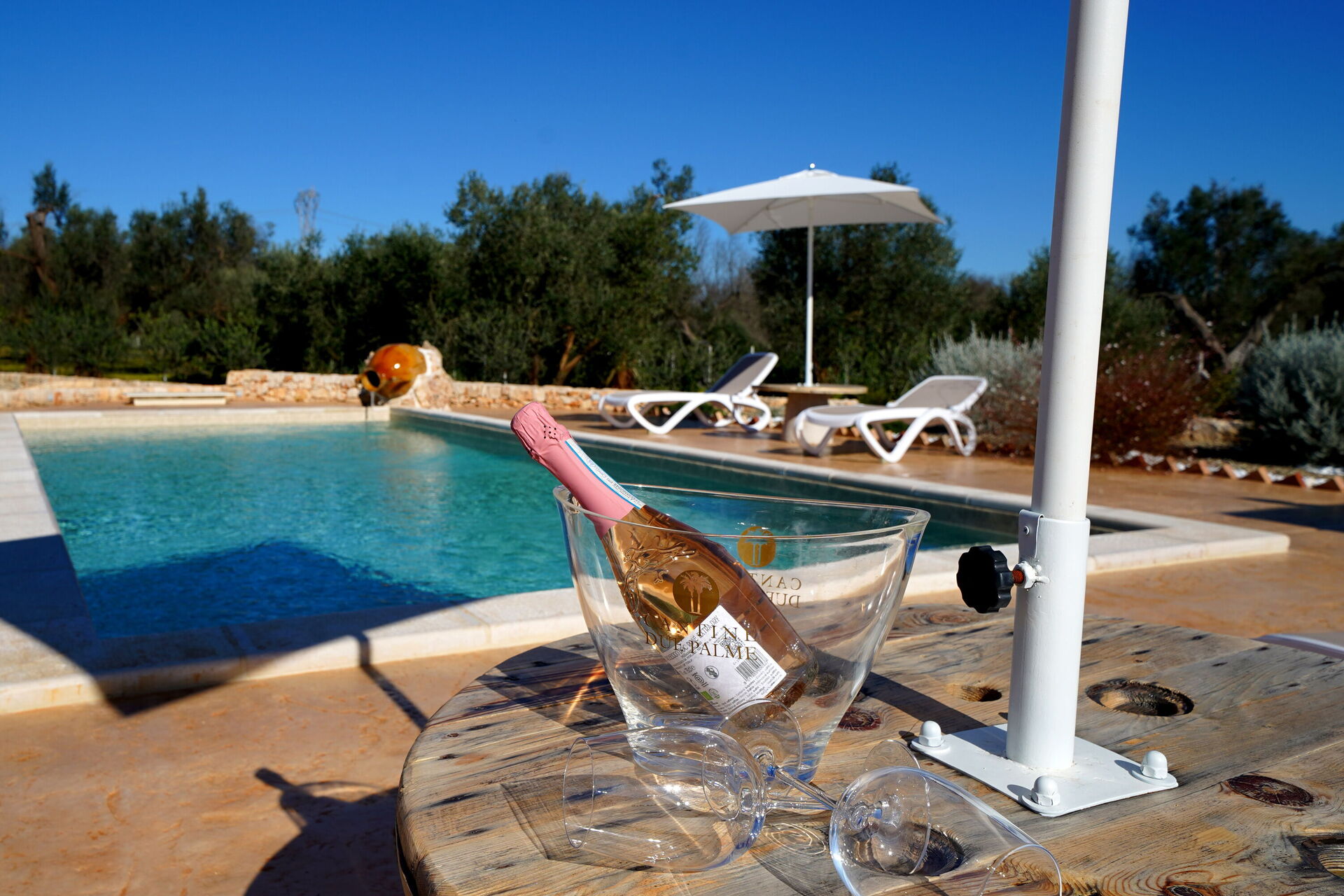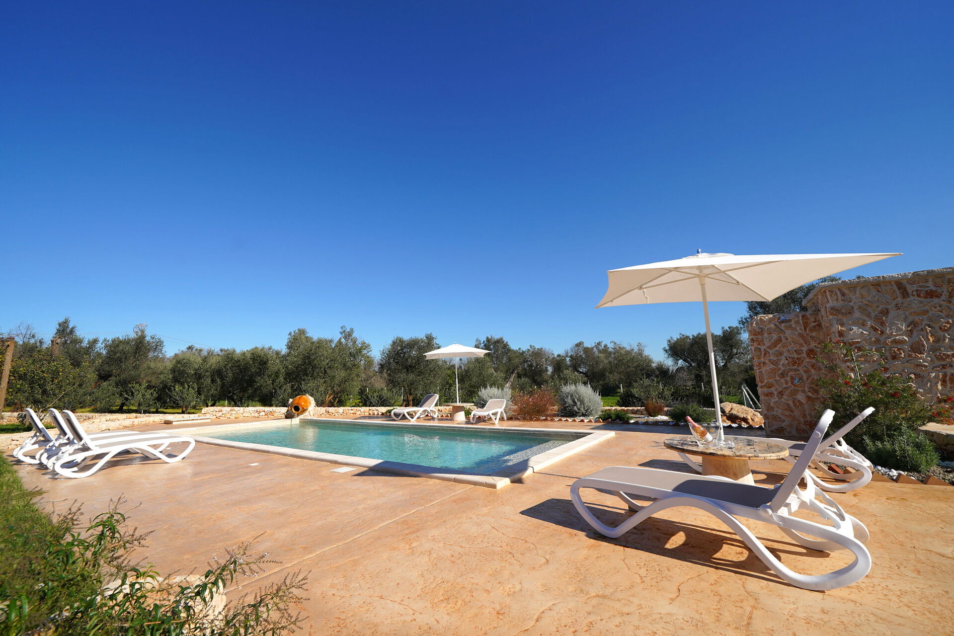 The large private pool is flanked by a sunbathing area with sun loungers: it is the perfect place to relax and cool off with friends and family under the Salento sun.