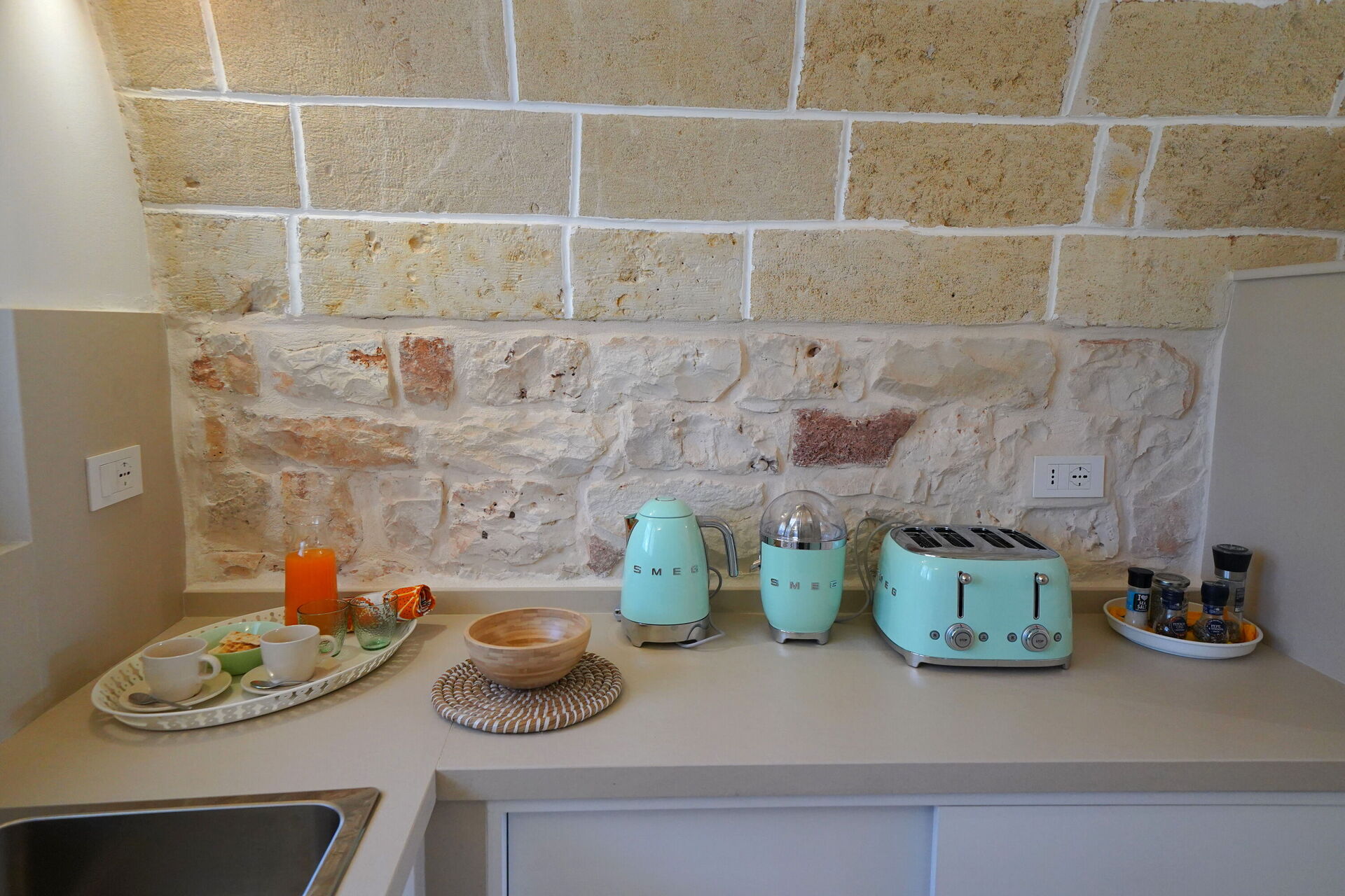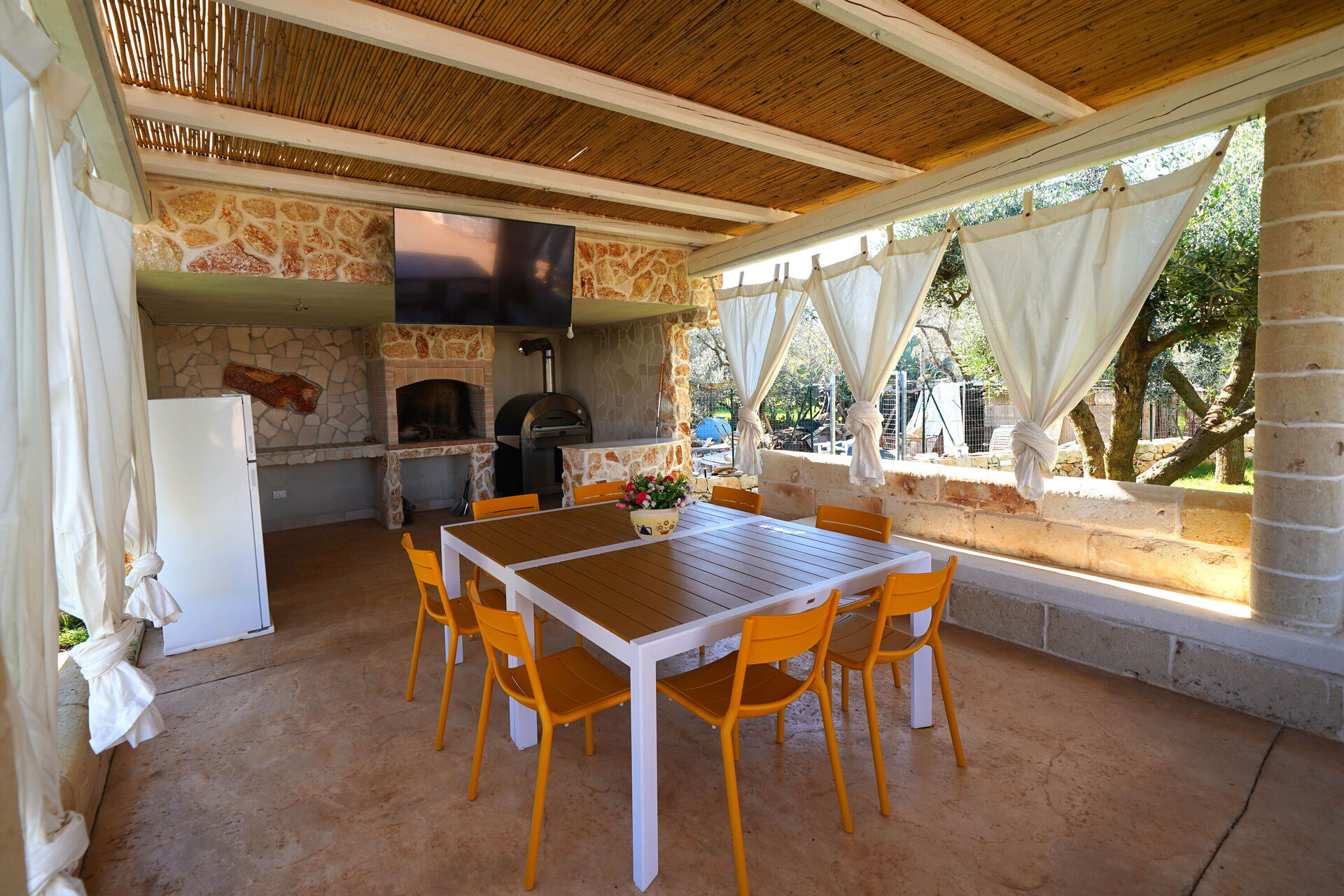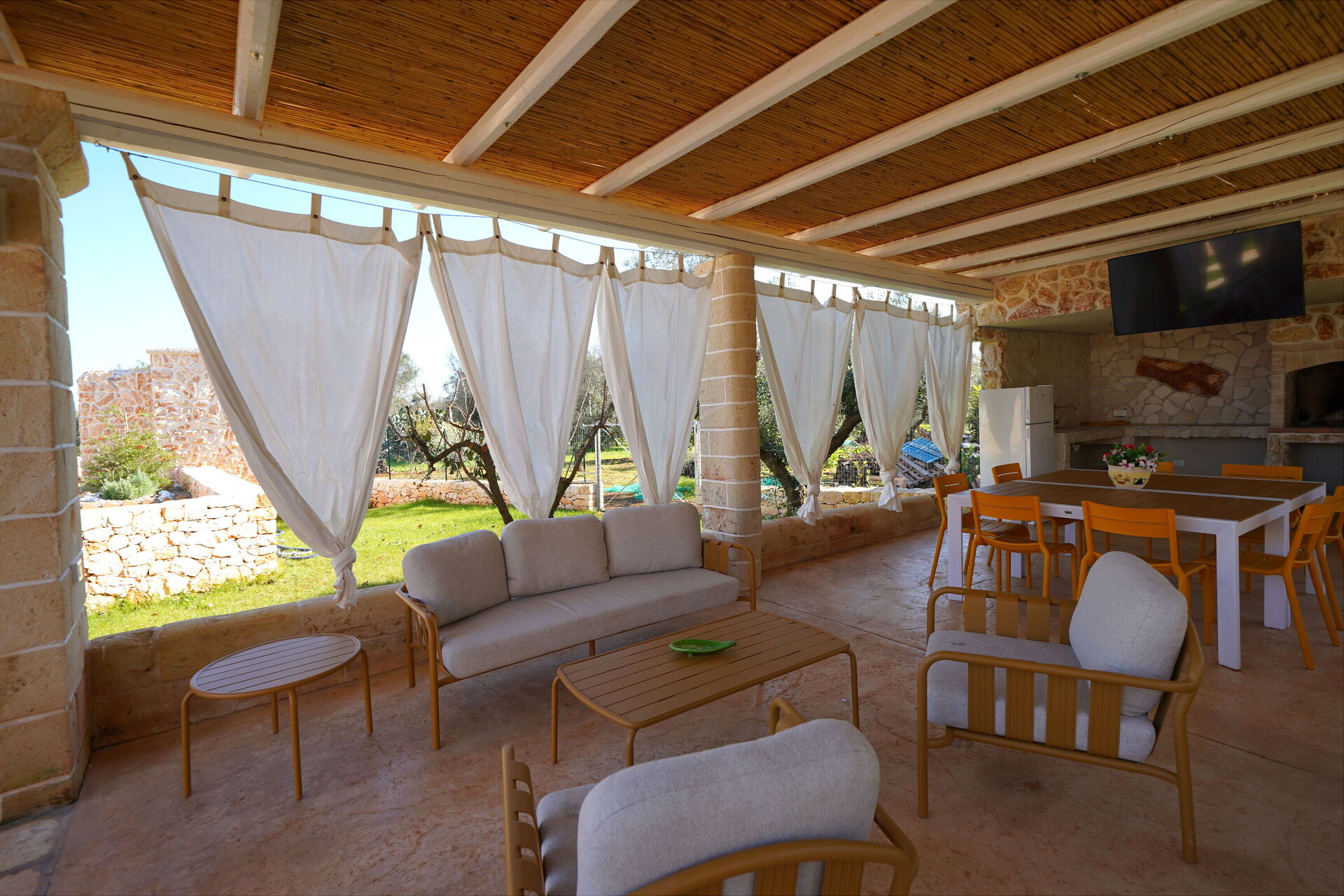 A beautiful veranda furnished with a table, chairs and barbecue is at guests’ disposal: here you can grill and dine outside while taking in the splendid rural landscape and enjoying panoramic views of the Apulian countryside.