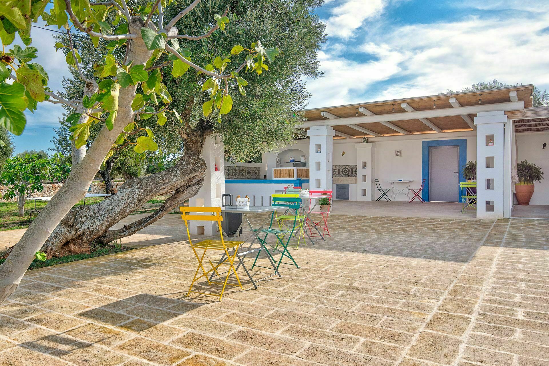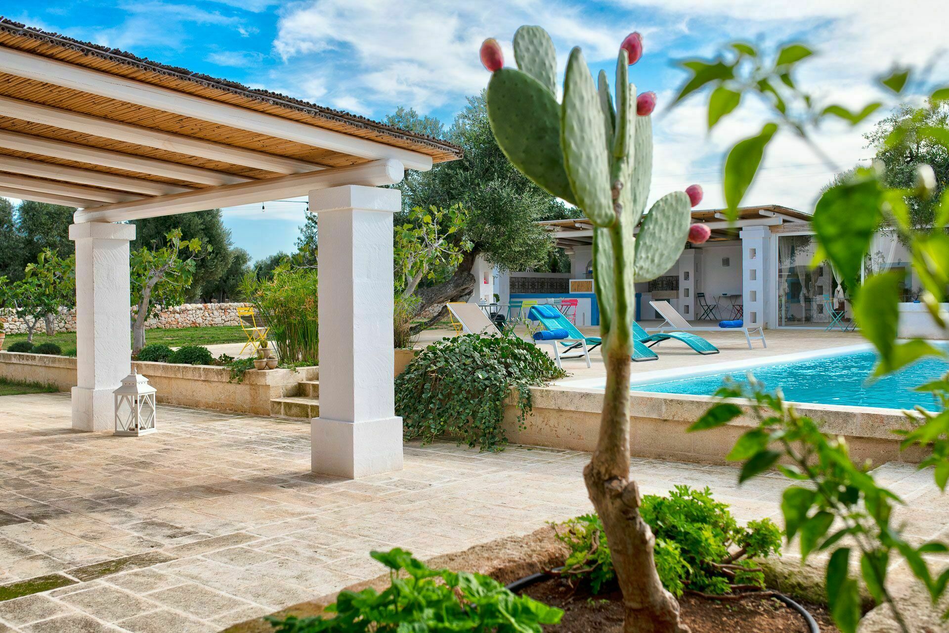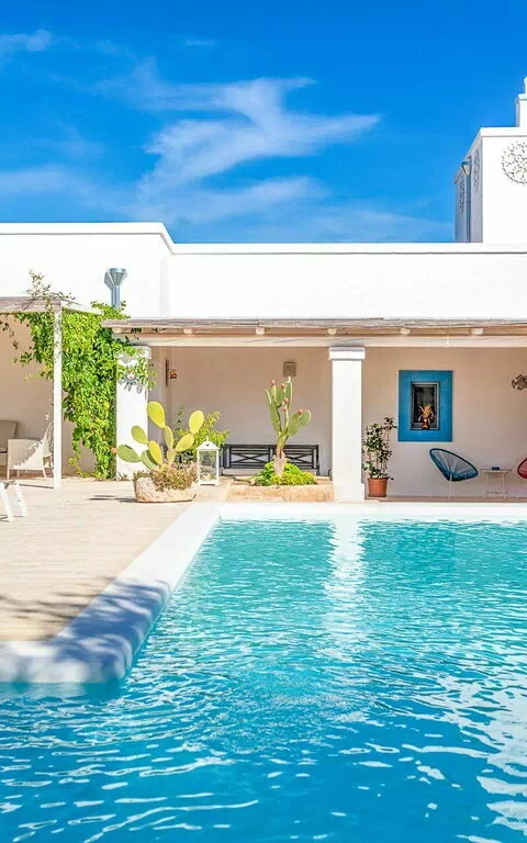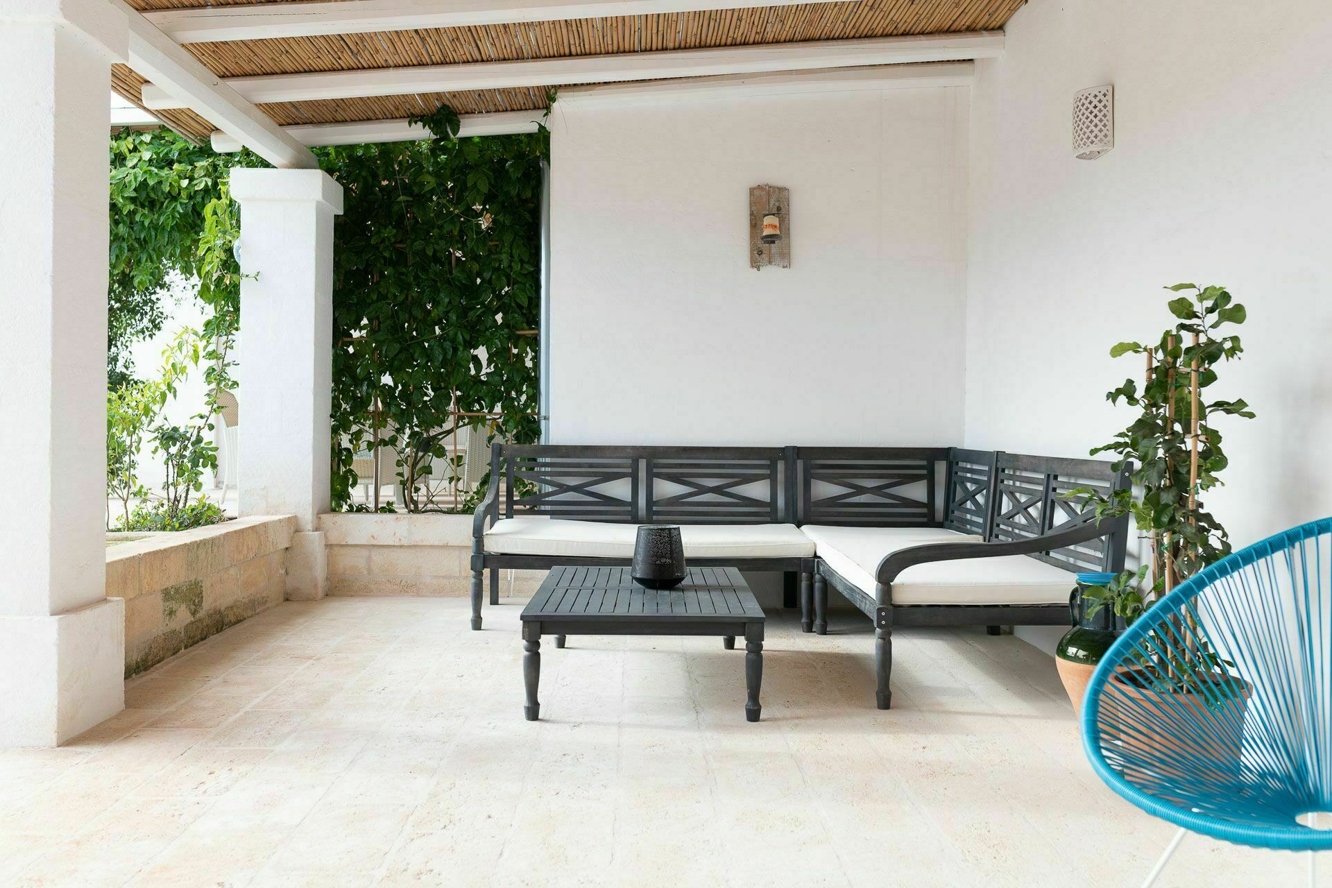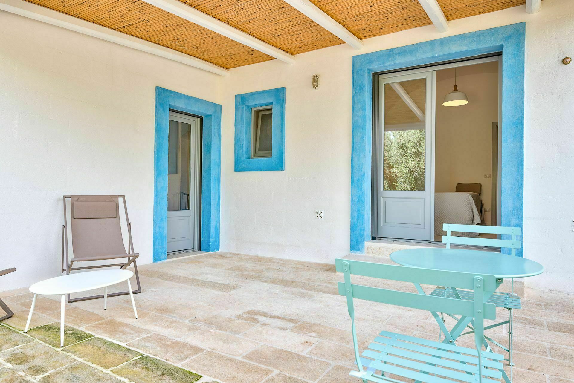 The outdoor spaces are also very inviting. In the large garden surrounding the rental, there is a beautiful private pool with Roman steps for easy access, a pool deck with sun loungers, and bathrooms with shower in the pool area. Masseria Tufo Bianco offers a large veranda with a traditional cane roof, table and chairs. There are also various outdoor relaxation areas with loveseats and chairs. In the villa rental’s fantastic orange grove, there is a quiet corner with umbrellas where you will be completely enveloped by the scents of Apulia. The villa’s crown jewel is a small courtyard by the pool with succulent plants and olive trees, where you can have breakfast at one of the various tables, read a book, or just relax.