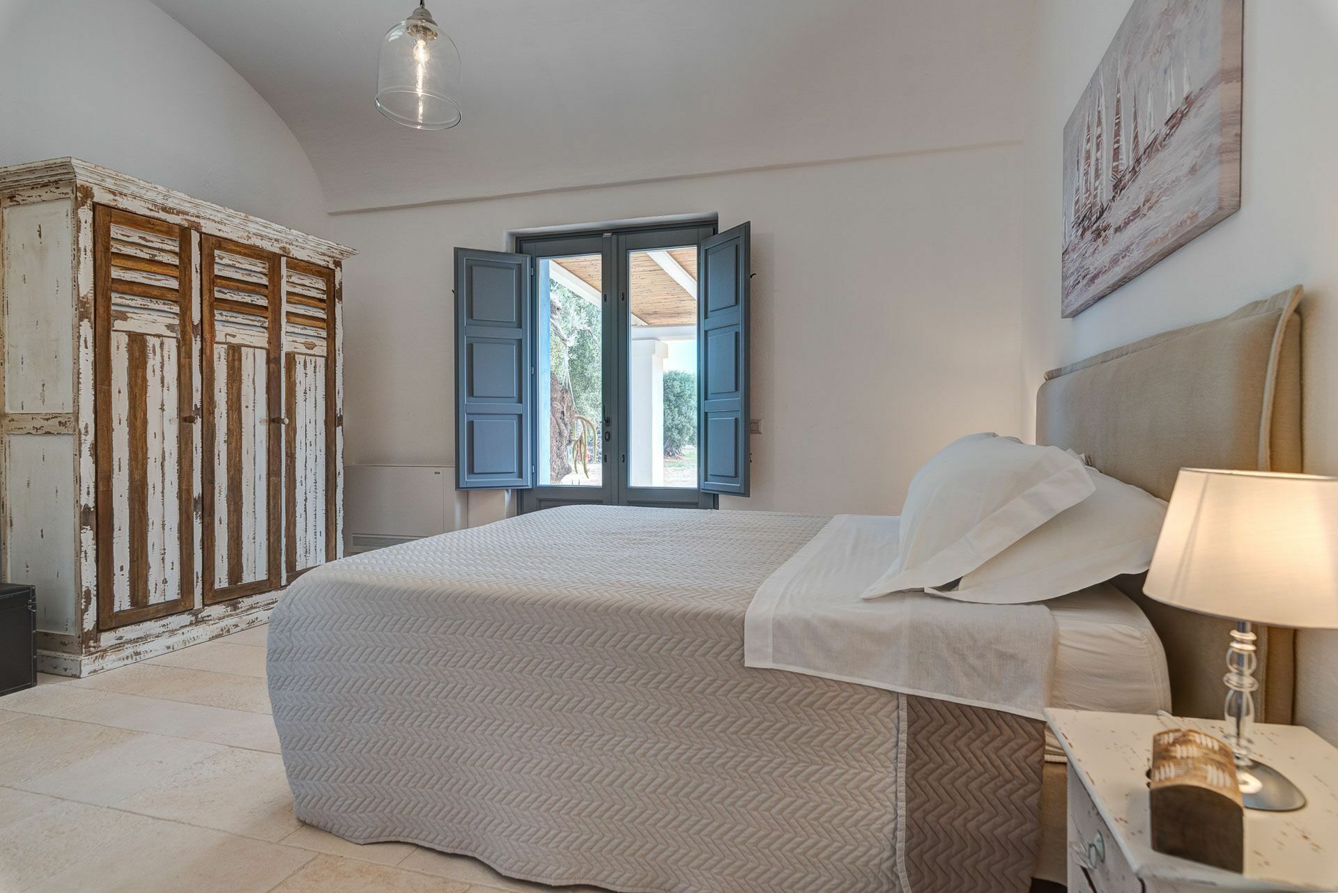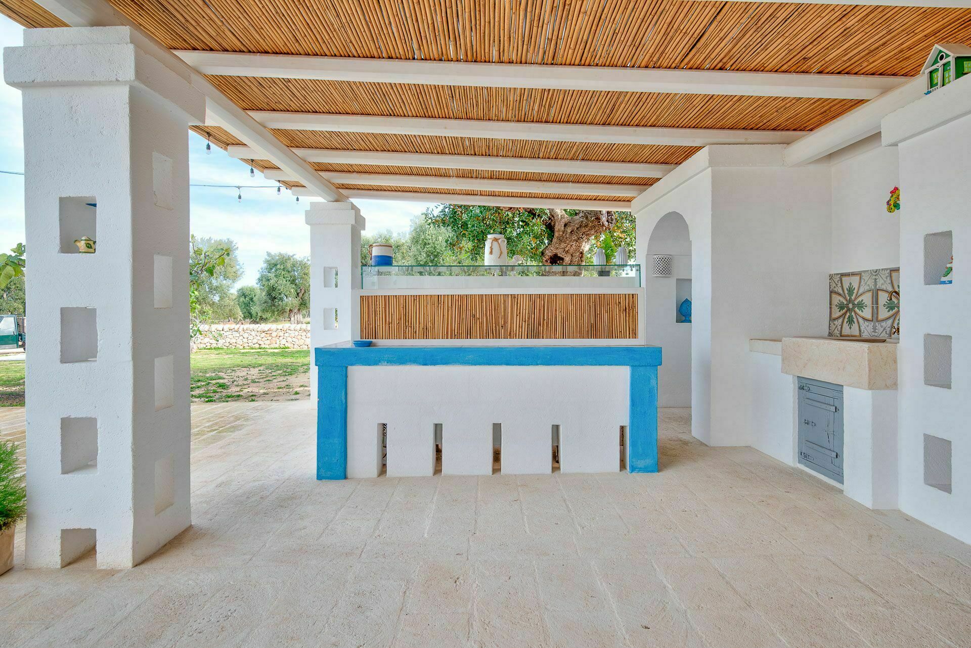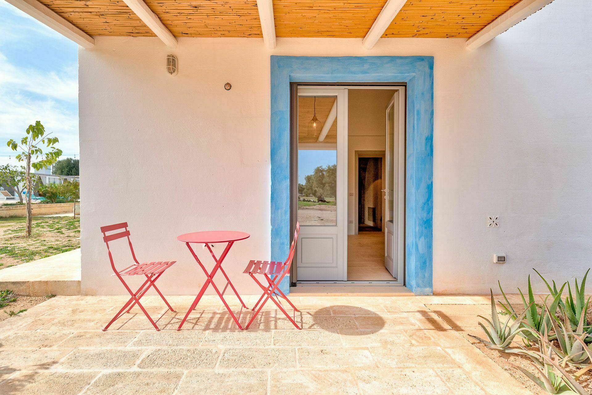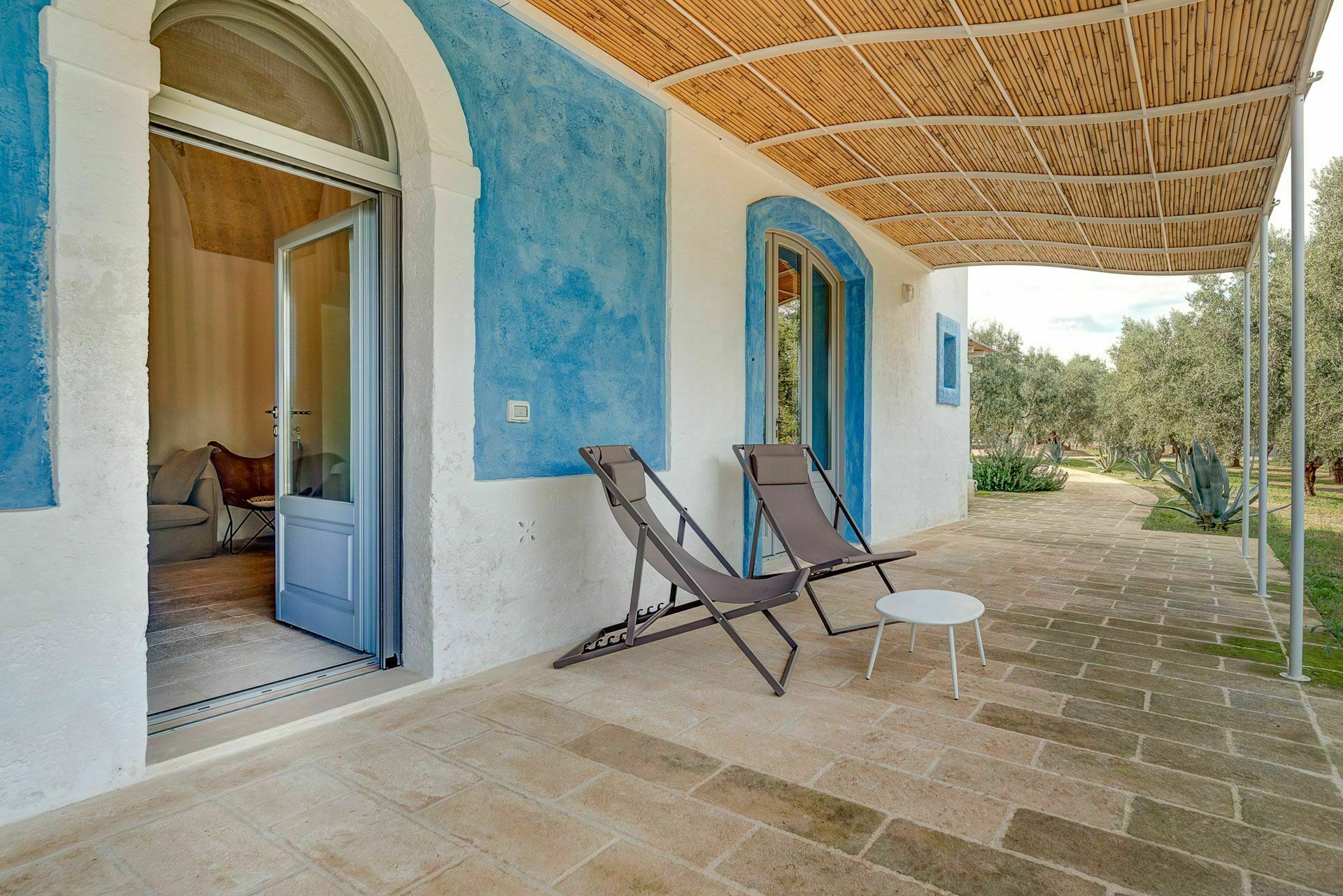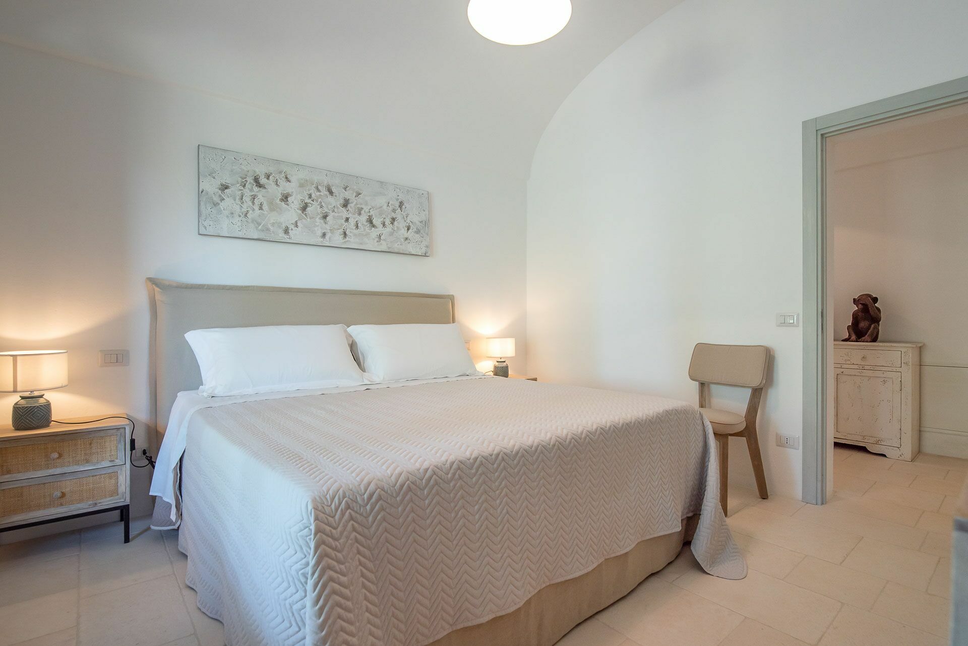 The outdoor spaces are also very inviting. In the large garden surrounding the rental, there is a beautiful private pool with Roman steps for easy access, a pool deck with sun loungers, and bathrooms with shower in the pool area. Masseria Tufo Bianco offers a large veranda with a traditional cane roof, table and chairs. There are also various outdoor relaxation areas with loveseats and chairs. In the villa rental’s fantastic orange grove, there is a quiet corner with umbrellas where you will be completely enveloped by the scents of Apulia. The villa’s crown jewel is a small courtyard by the pool with succulent plants and olive trees, where you can have breakfast at one of the various tables, read a book, or just relax.