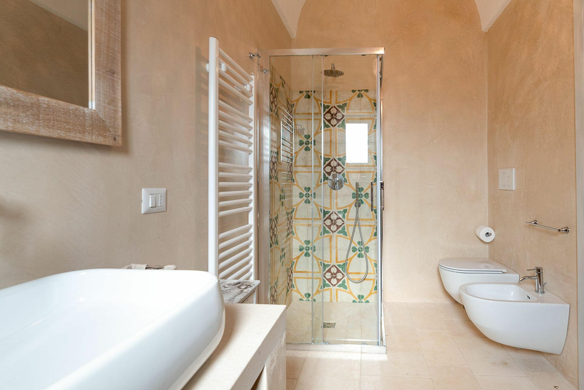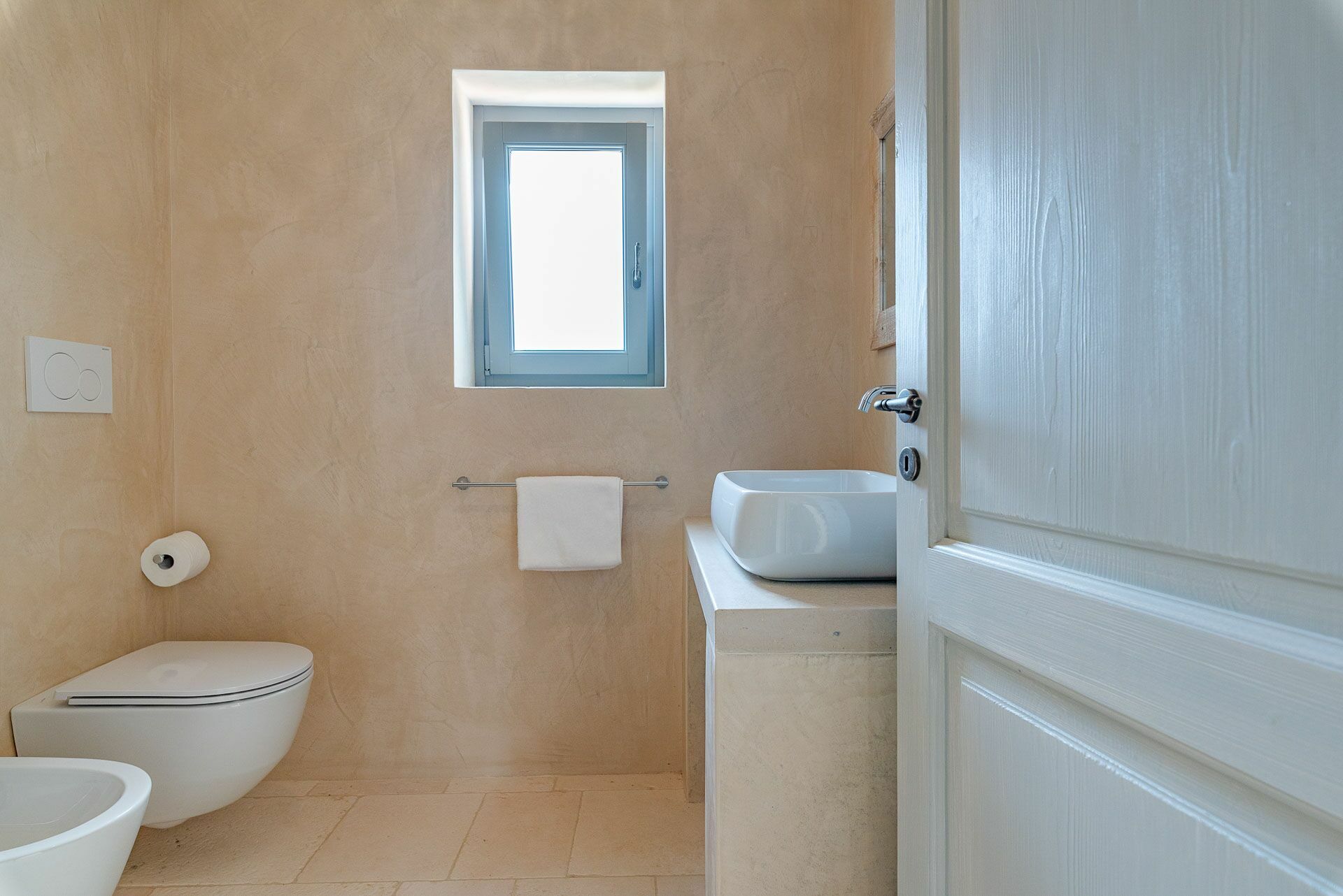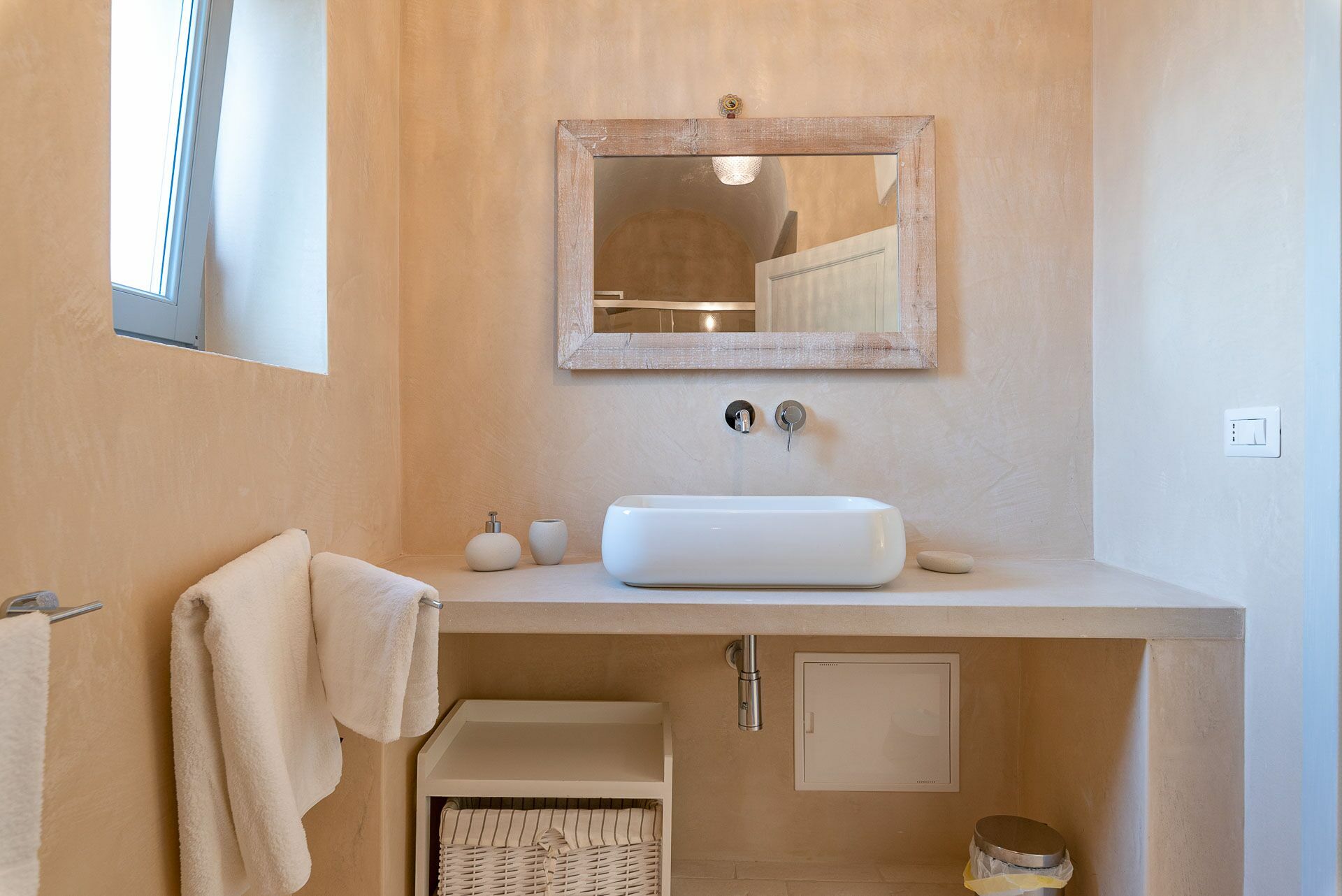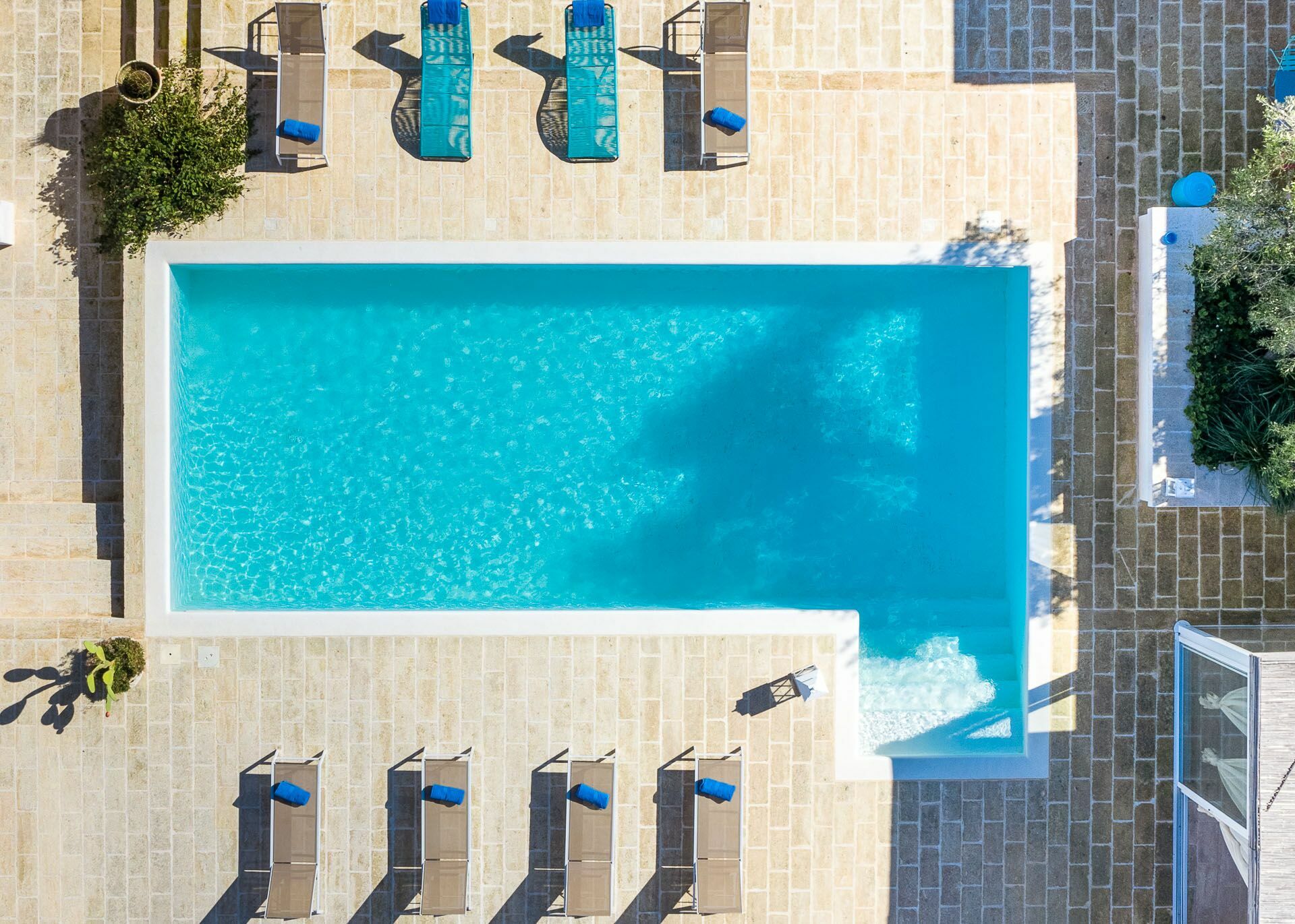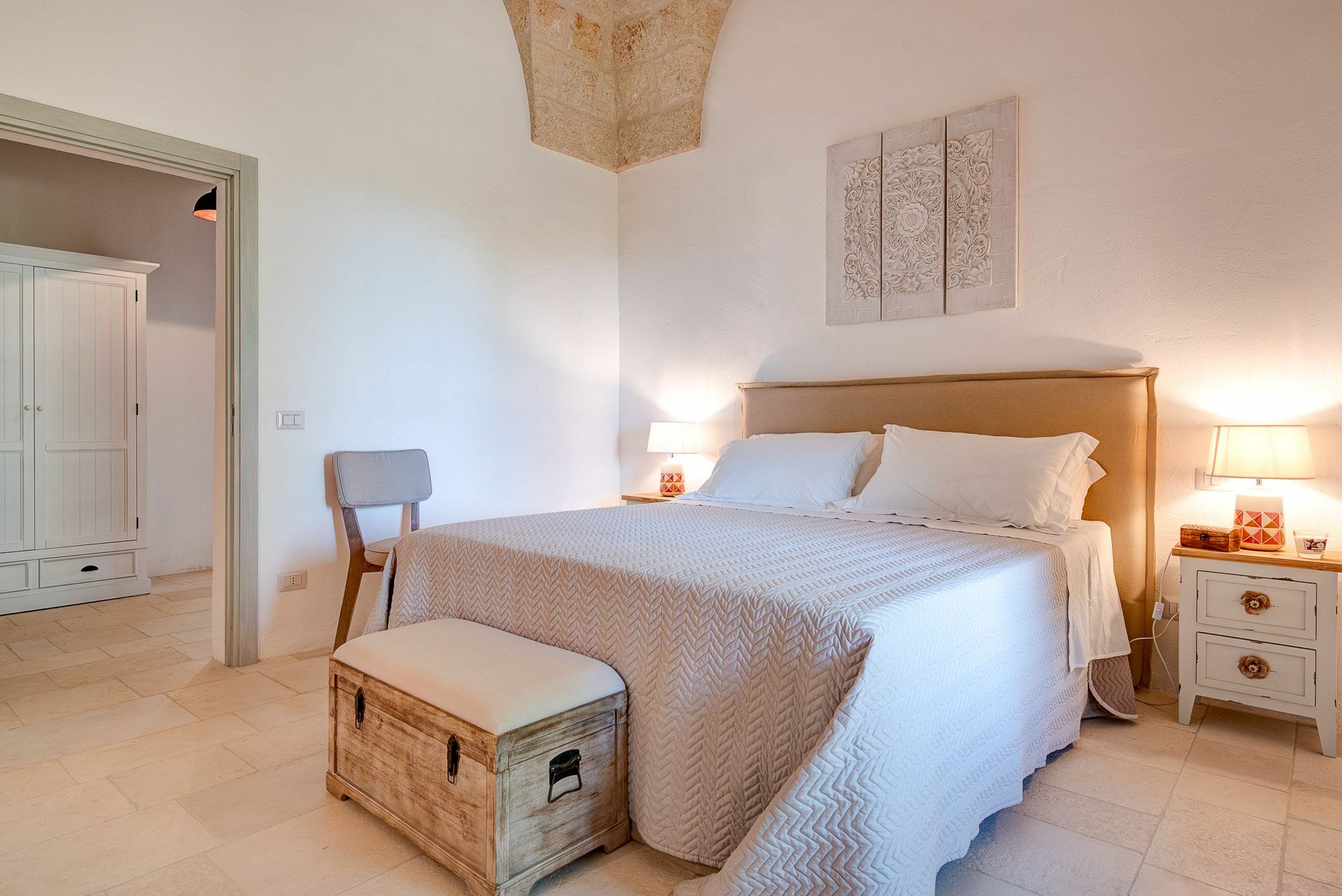 The outdoor spaces are also very inviting. In the large garden surrounding the rental, there is a beautiful private pool with Roman steps for easy access, a pool deck with sun loungers, and bathrooms with shower in the pool area. Masseria Tufo Bianco offers a large veranda with a traditional cane roof, table and chairs. There are also various outdoor relaxation areas with loveseats and chairs. In the villa rental’s fantastic orange grove, there is a quiet corner with umbrellas where you will be completely enveloped by the scents of Apulia. The villa’s crown jewel is a small courtyard by the pool with succulent plants and olive trees, where you can have breakfast at one of the various tables, read a book, or just relax.