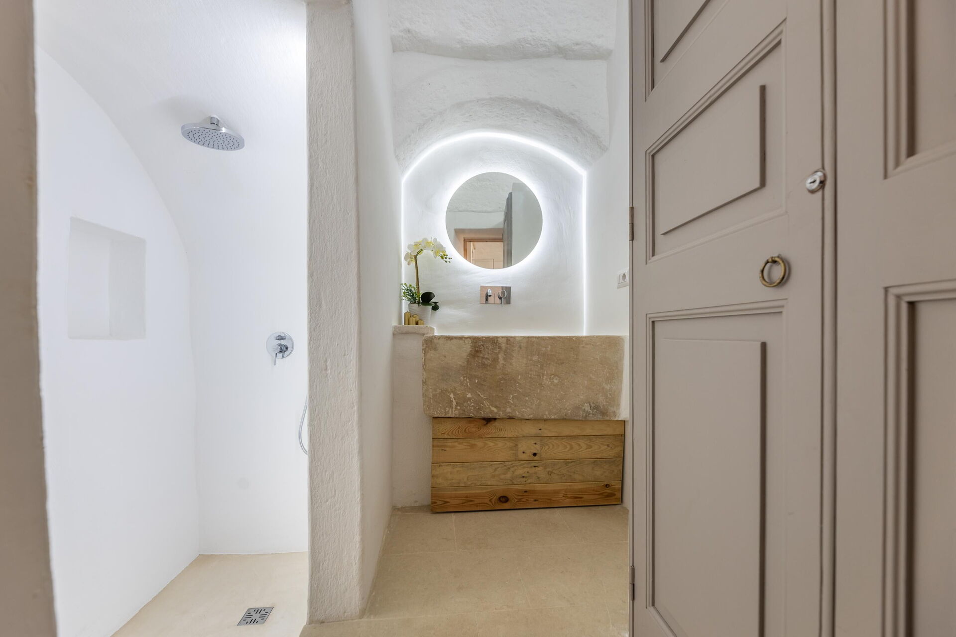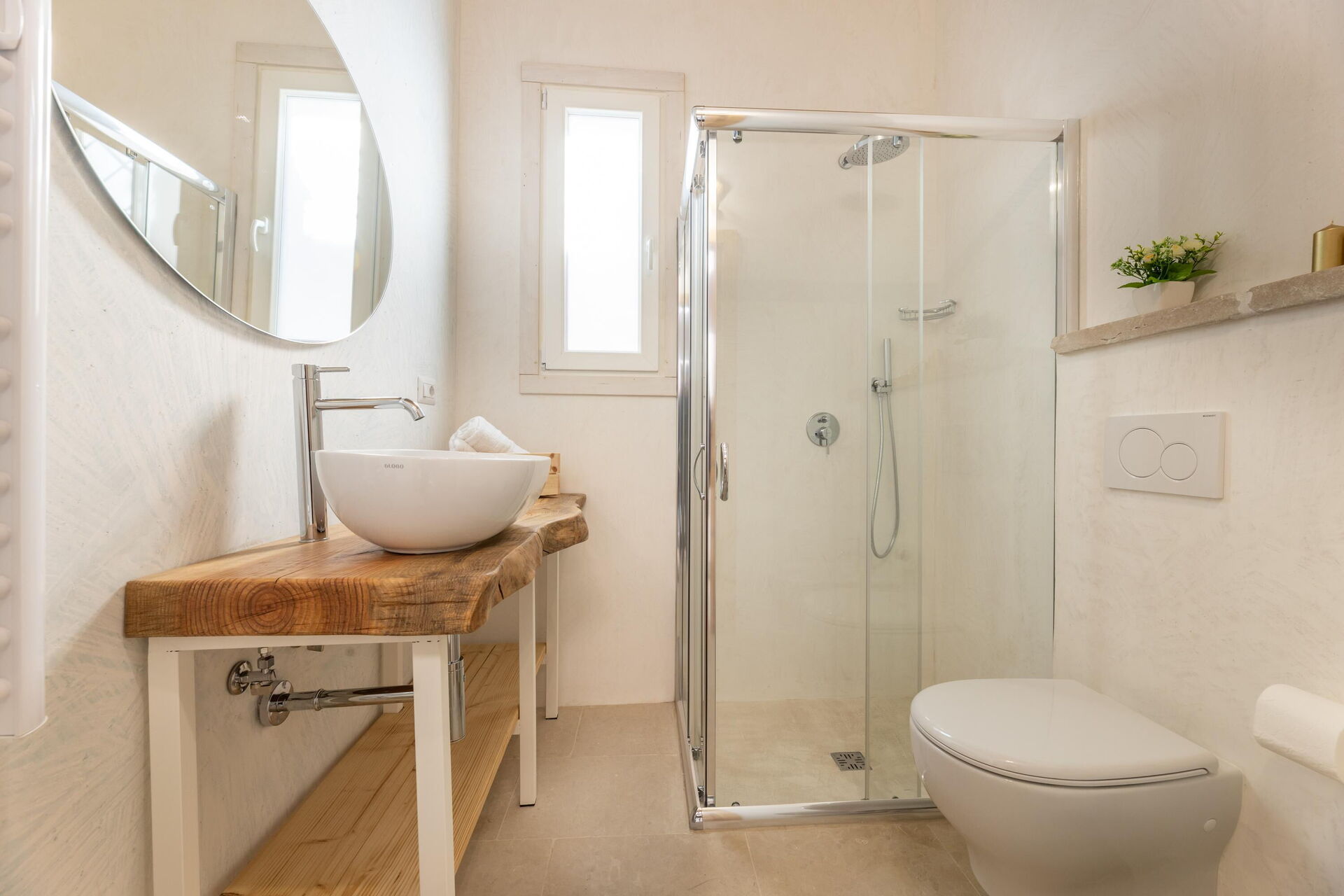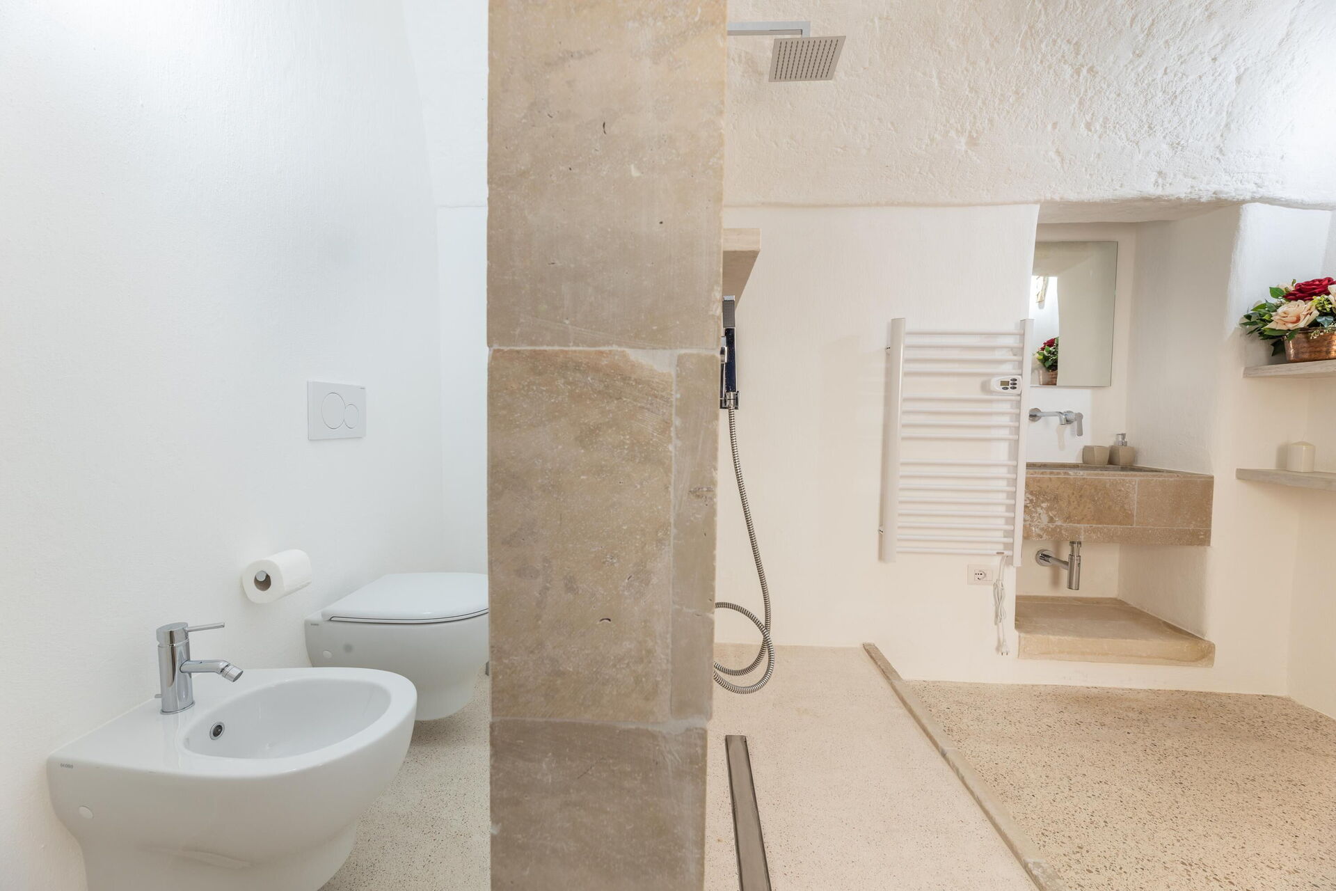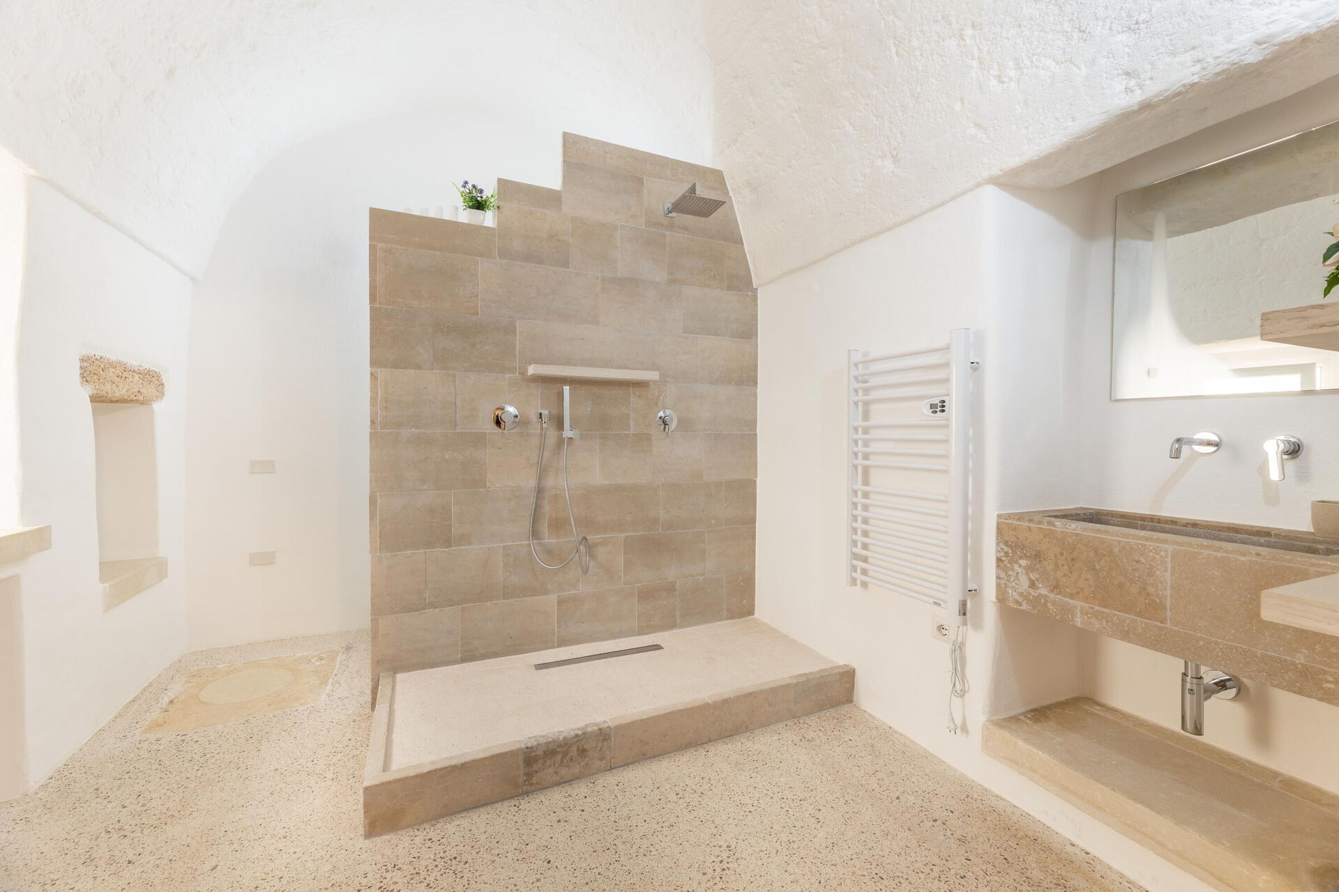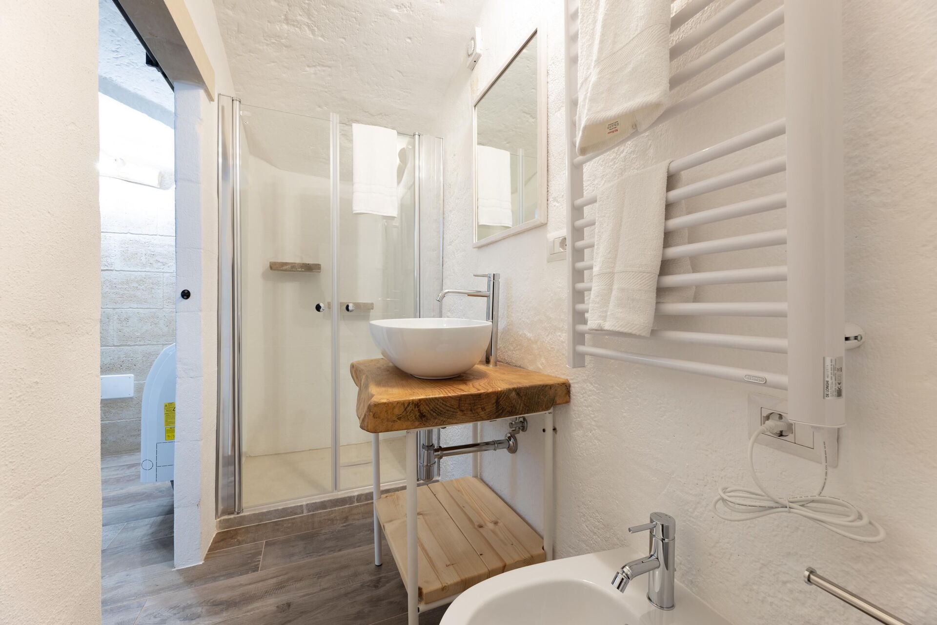 Ground floor: entrance leading into the kitchen (refrigerator, freezer, microwave, induction cooktop, coffee maker) and living room (air conditioning); double bedroom (air conditioned bedroom) with private bathroom with shower; bathroom with shower; sauna relaxation room. From the relaxation room there is access to the roof terrace via an indoor staircase.