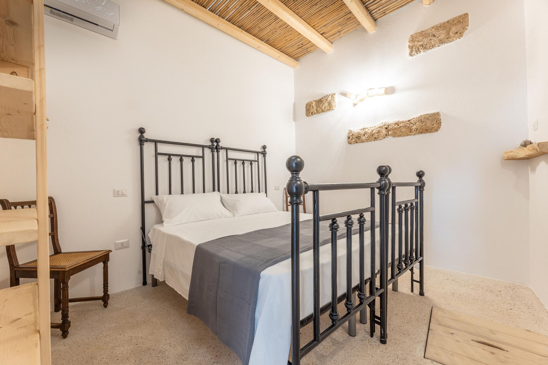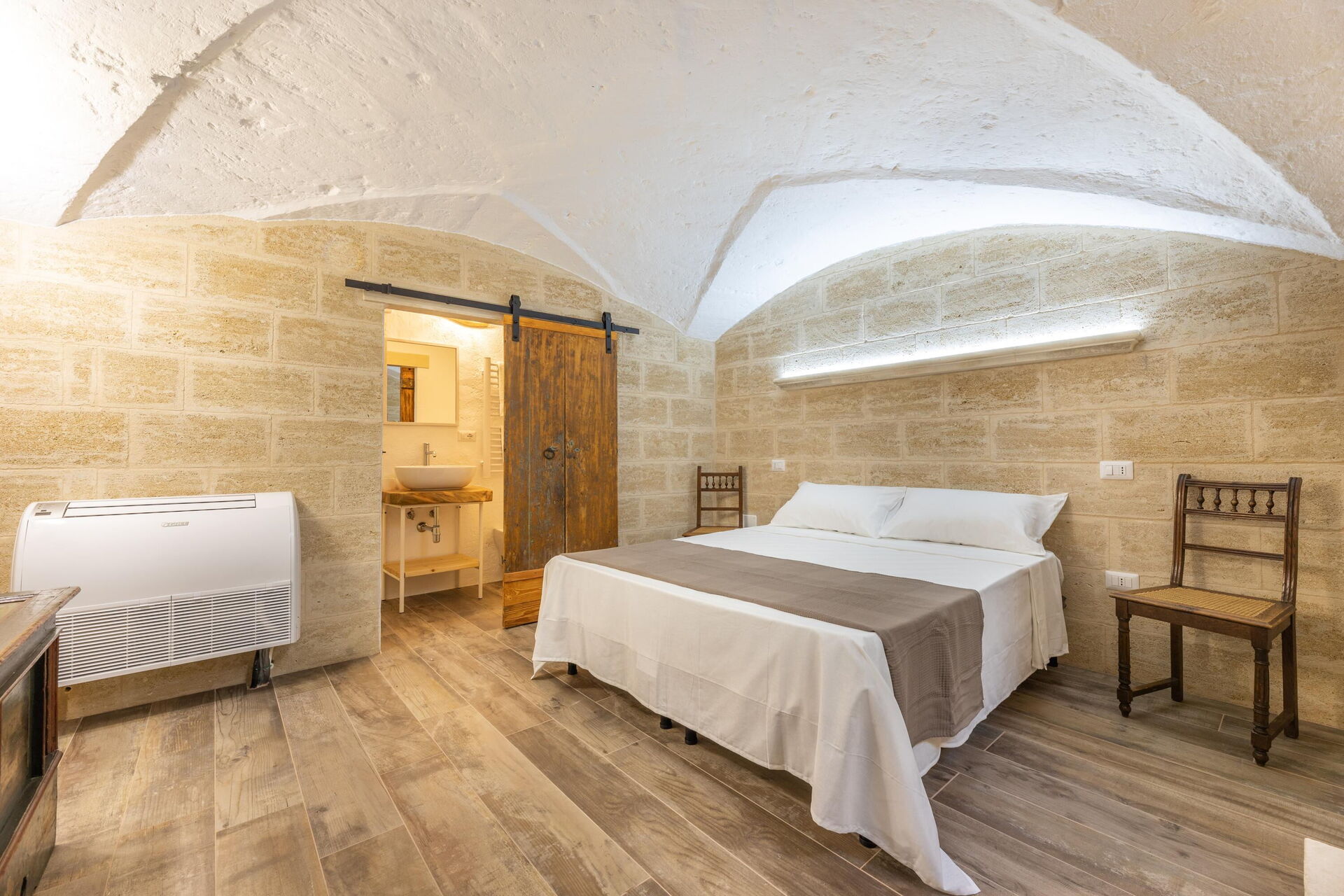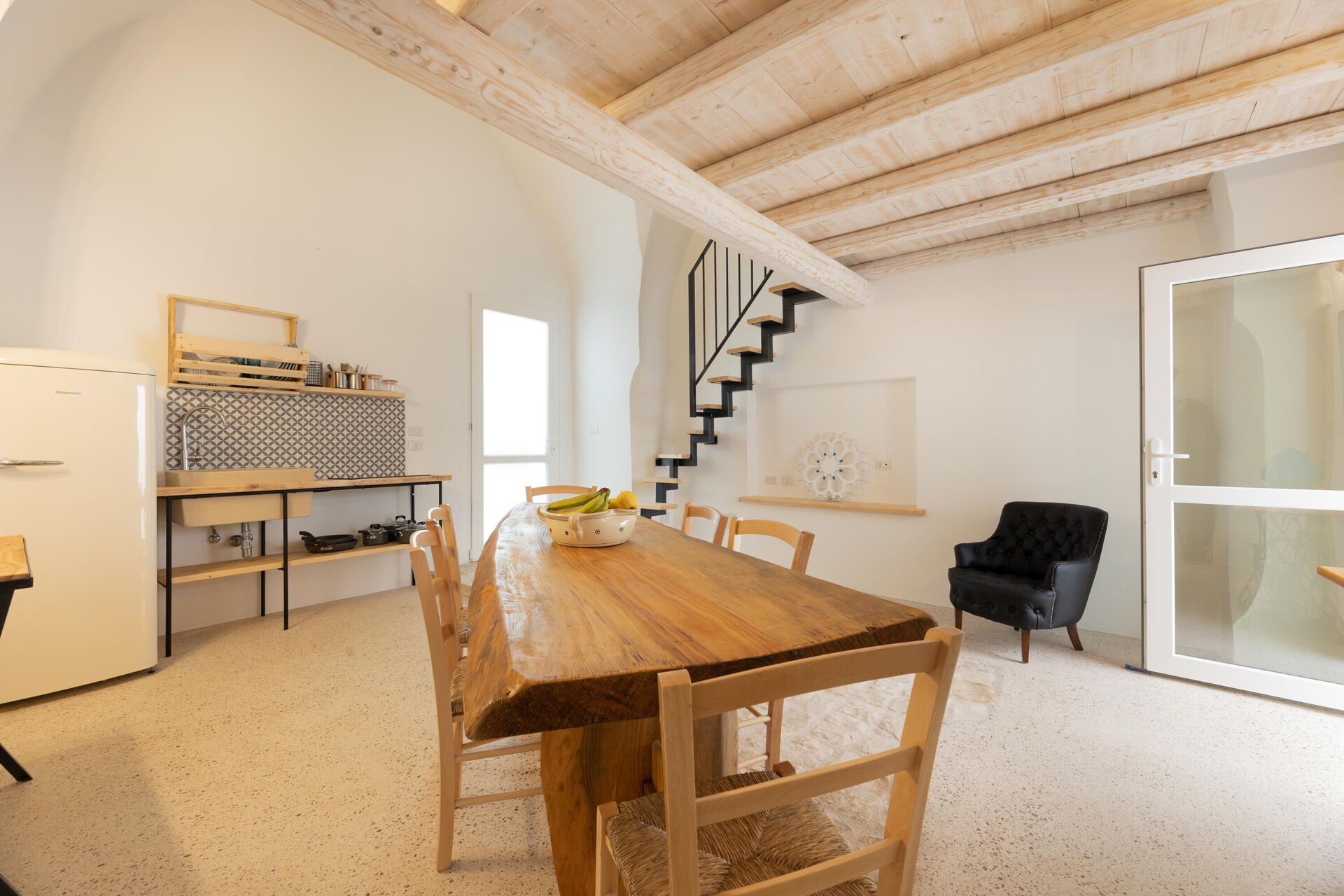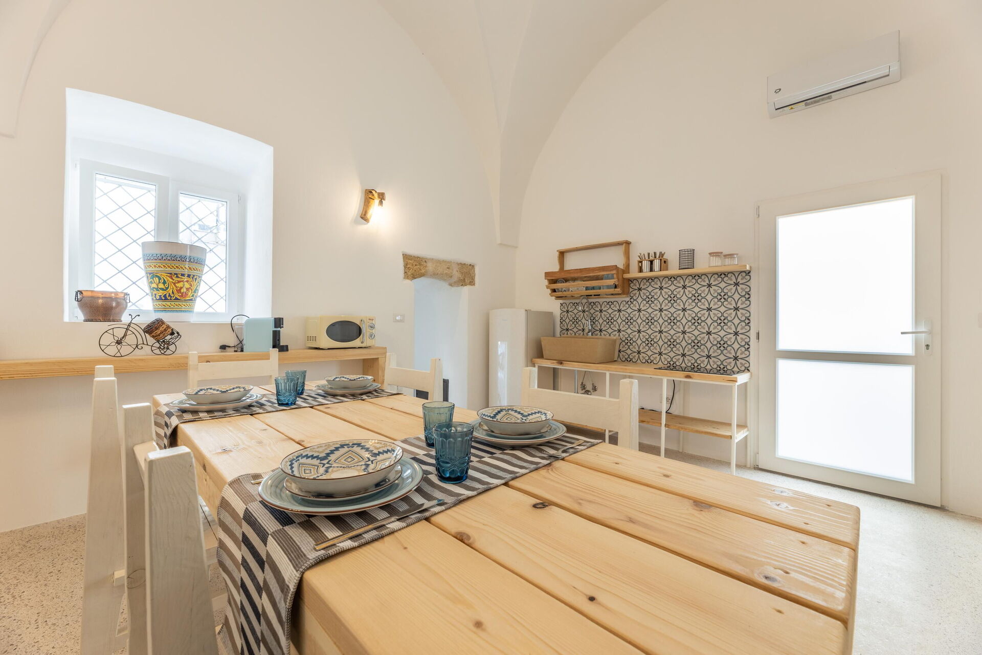 This special, recently renovated vacation property can accommodate up to 6 people in 3 elegantly furnished double bedrooms. The interiors of this vacation rental in Puglia feature wood and stone, traditional Salento materials. The white color, vaulted ceilings, and stones on the wall will make you feel like you’re in a traditional country house, even though you’re right in the town center.