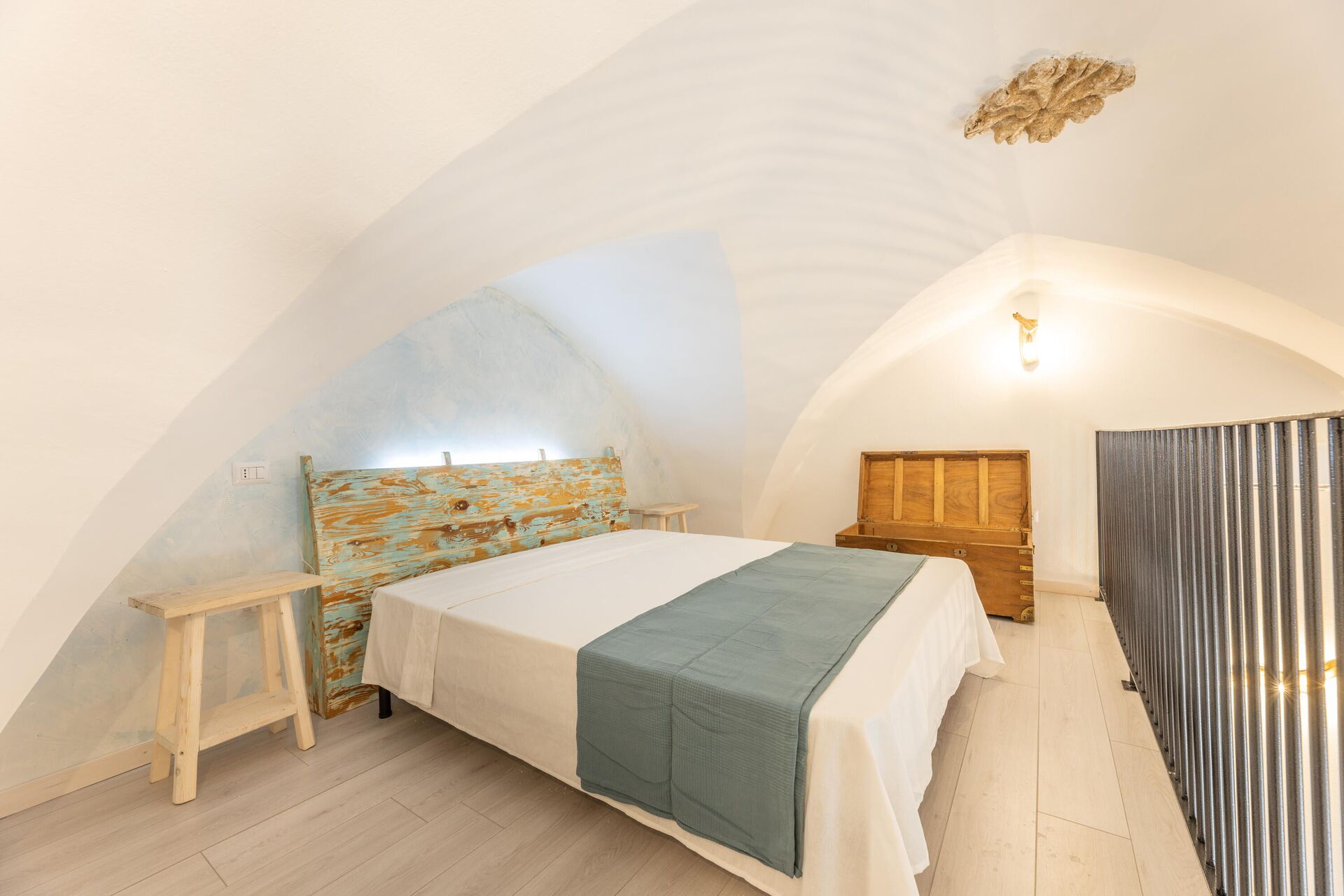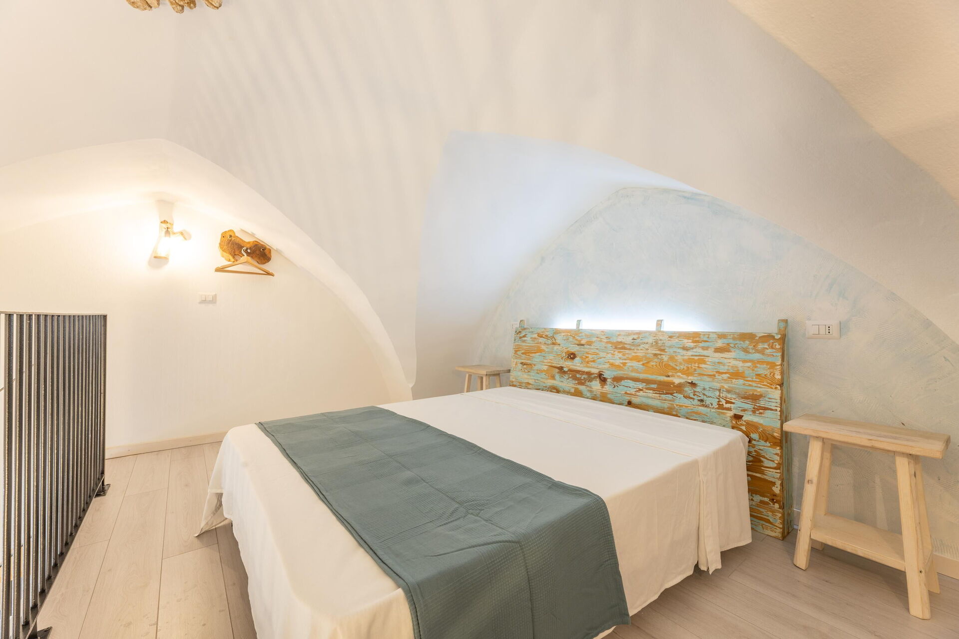 Loft: double bed (air conditioning) accessible from the living room, looking out over the living room below.