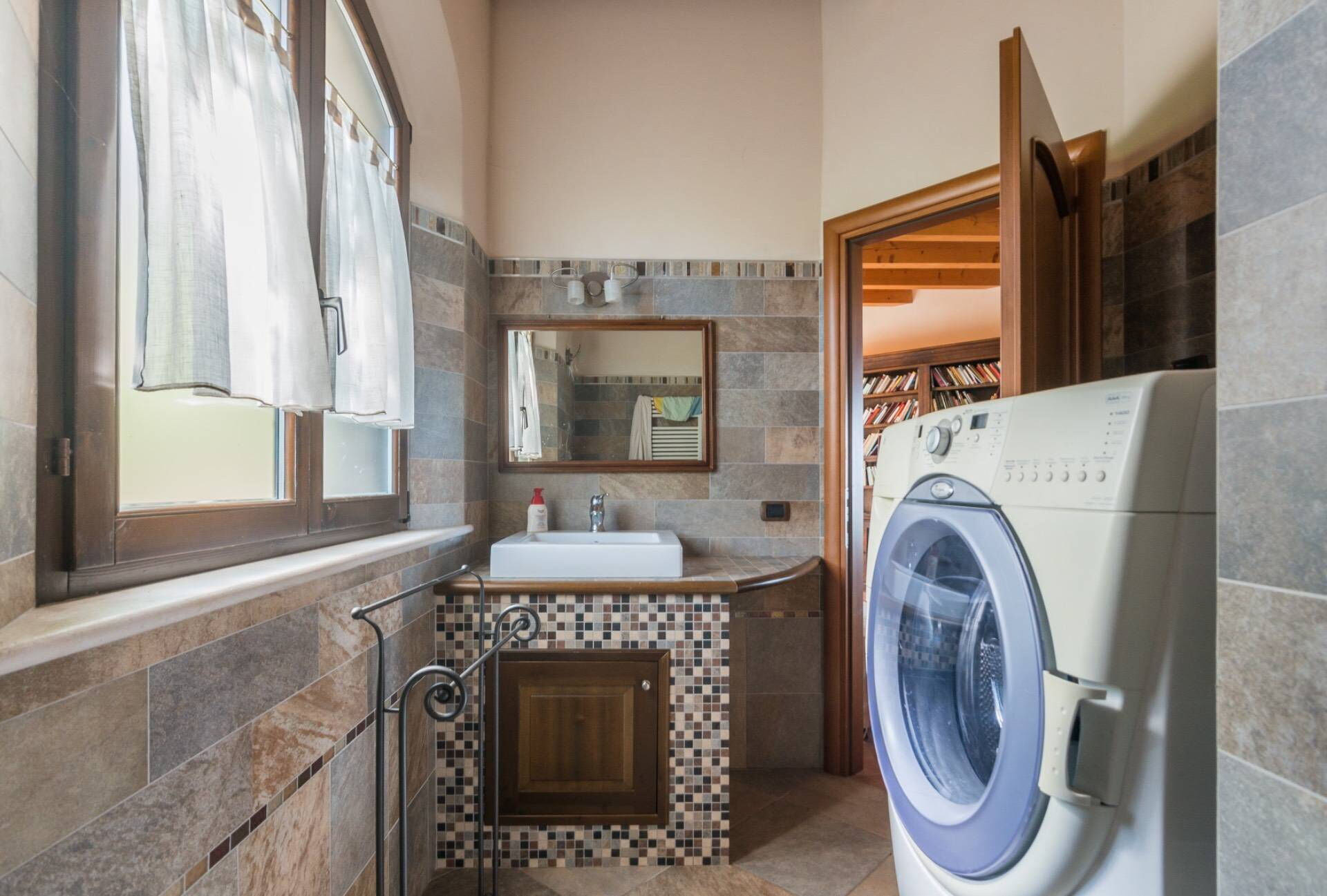 Lower floor: Spa area equipped with private indoor pool (9 x 7 meters; minimum depth: 1.20 meters; maximum depth: 2 meters; hydromassage corner integrated into the main pool (3 x 2 meters, depth: 0.90 meters); sauna; bathroom with toilet and shower, laundry room with washing machine.