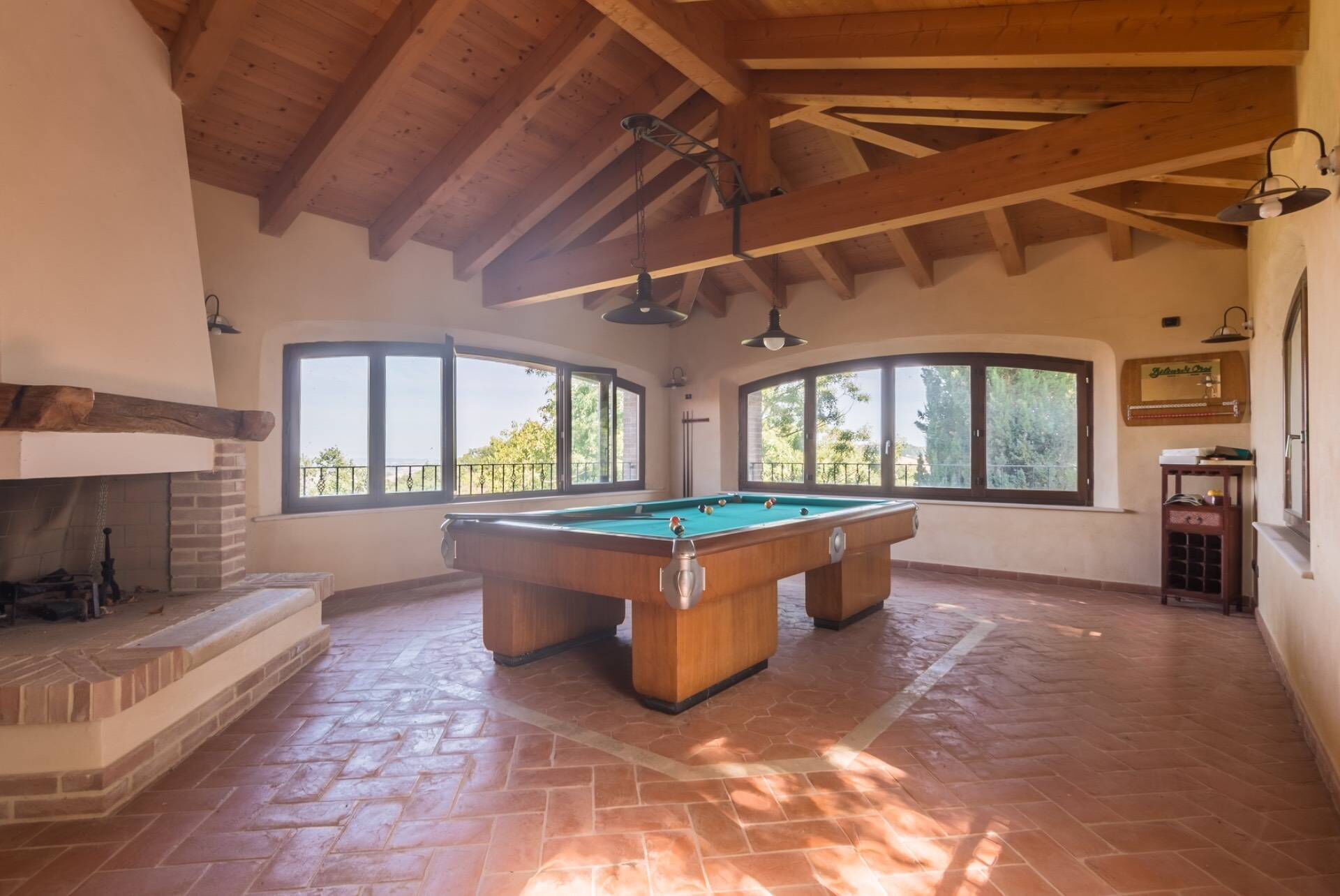 First floor: 2 double bedrooms, bathroom with hydromassage tub and shower, bedroom with French bed, bedroom with 2 single beds, bathroom with shower, large and panoramic lounge with fireplace and billiard table.