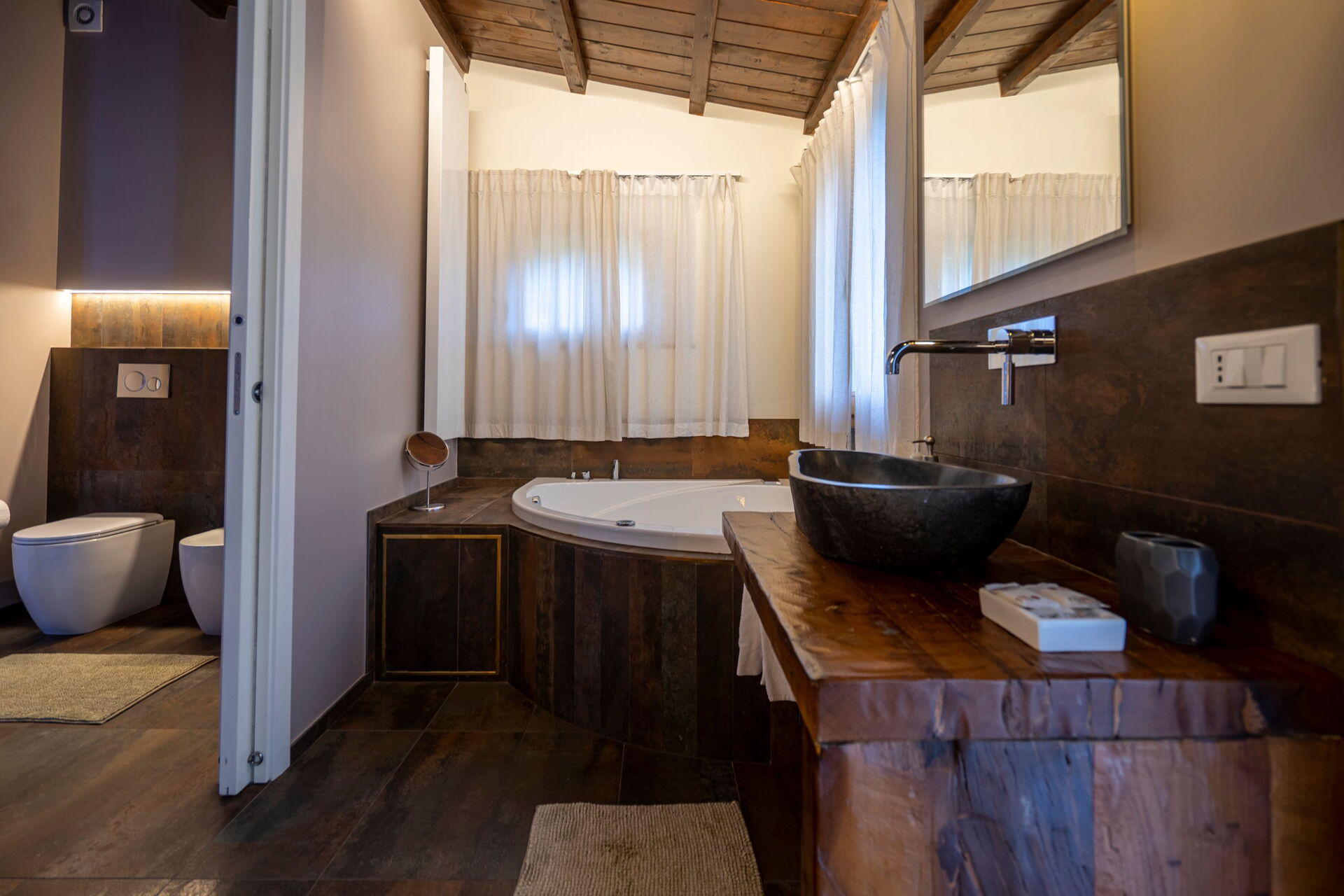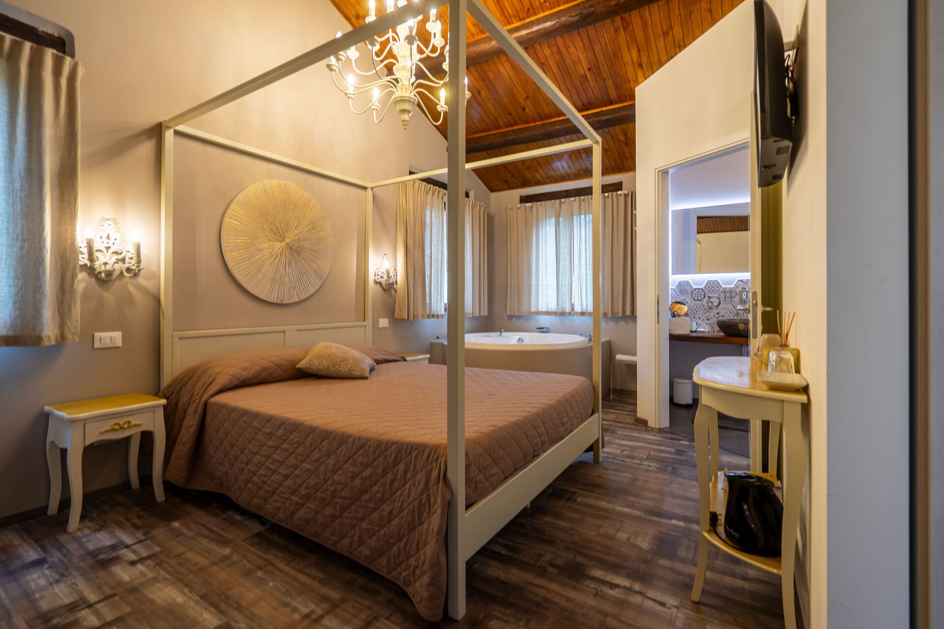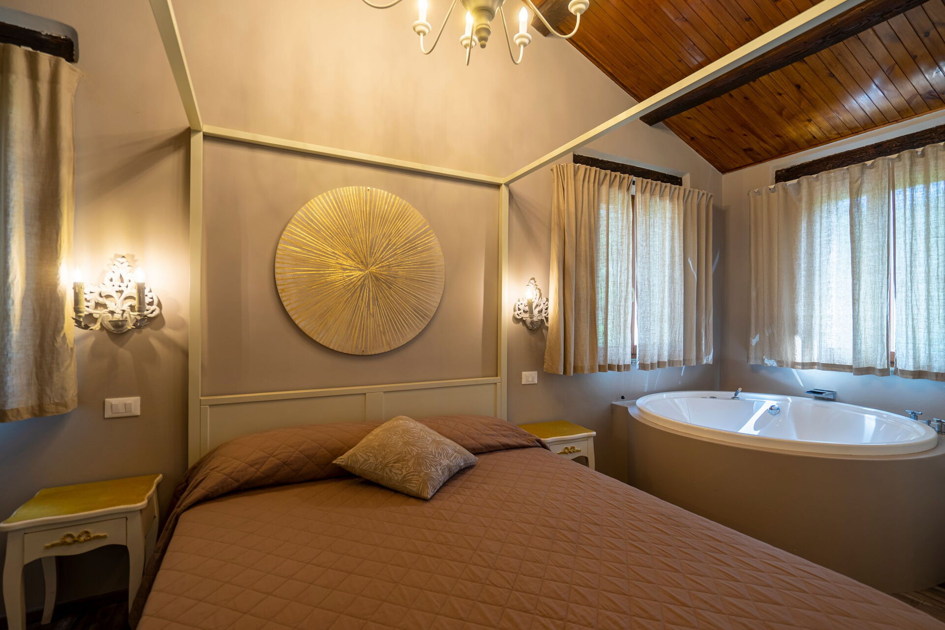 Ground floor: living room (air conditioning and TV) with dining area and kitchen (hotplate, oven, freezer, fridge, dishwasher and coffee machine); suite with living room with fireplace, double sofa bed, TV, double bedroom (air conditioning, TV, mini bar) with Jacuzzi and corner colour therapy , with private bathroom and floor level shower (ideal for guests with reduced mobility), access to private patio with views over the park; suite with living room and fireplace, kitchenette (hotplate, fridge), single sofa bed, TV, double bedroom (air conditioning, TV, mini bar) with Jacuzzi and corner colour therapy unit and private bathroom