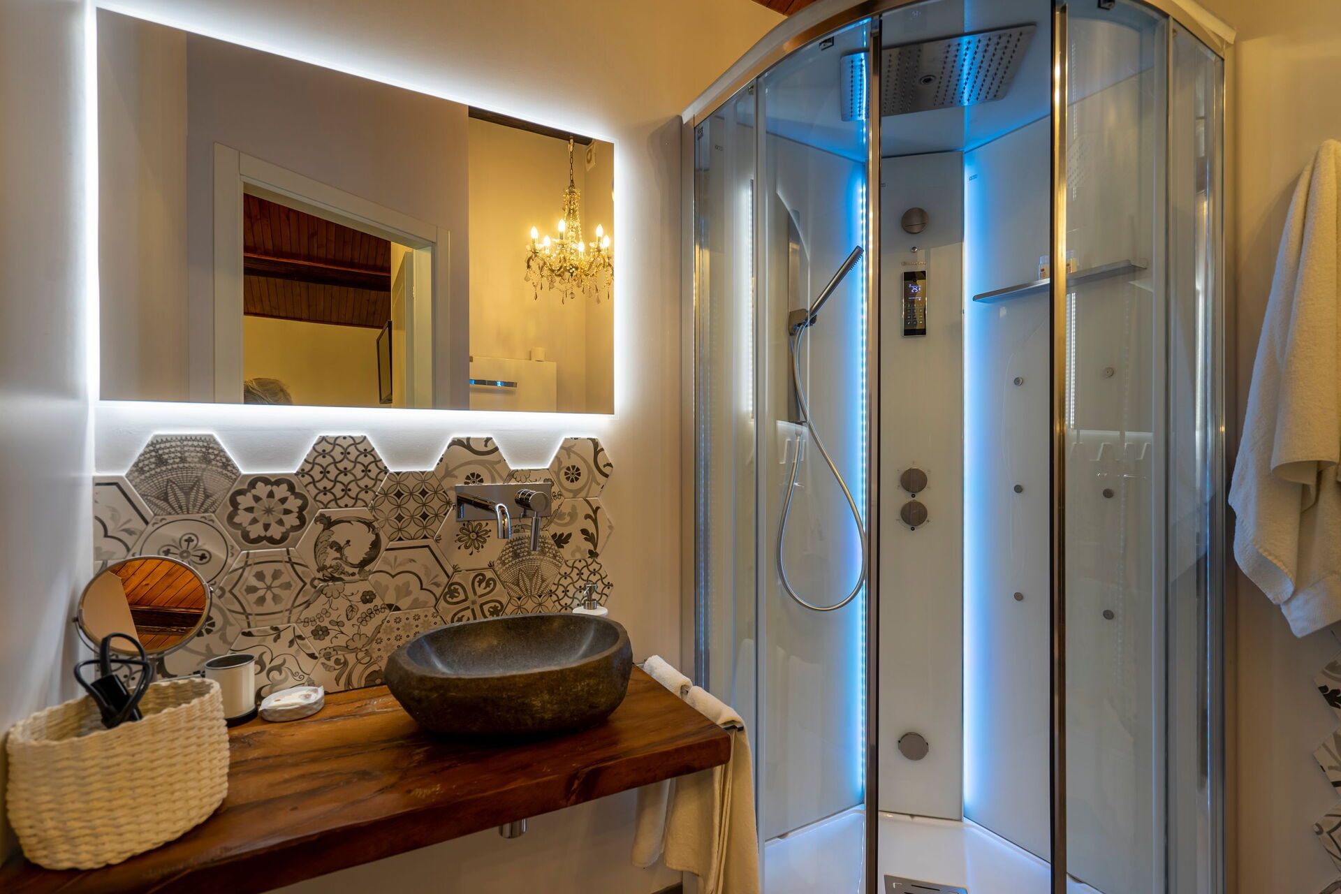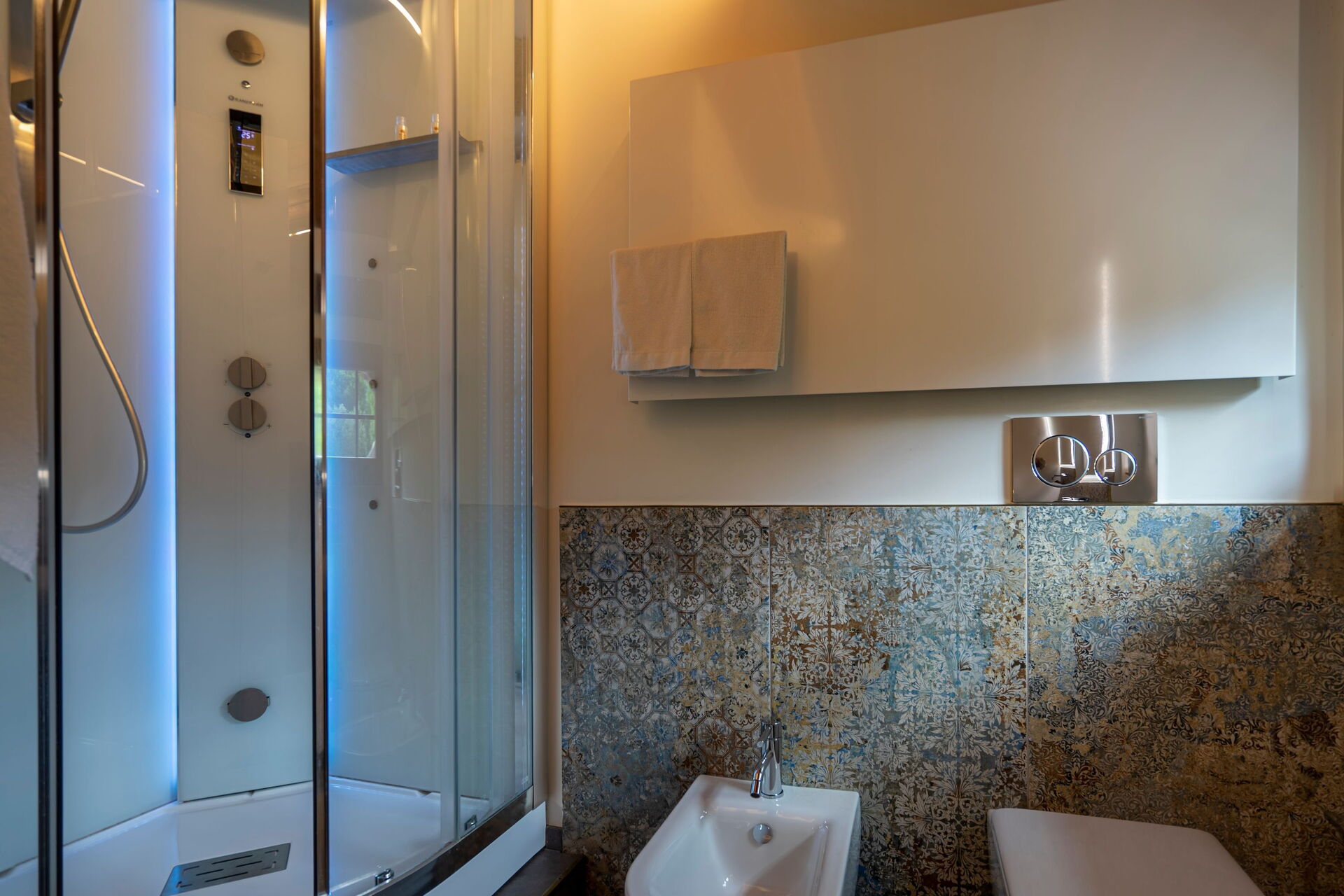 First floor: double bedroom (air conditioning. TV, mini bar) with private bathroom with multifunctional shower with colour therapy and a Turkish bath; double bedroom (air conditioning, TV, mini bar) with single sofa bed, Jacuzzi/colour therapy and private bathroom private bathroom with multifunctional shower with colour therapy and a Turkish bath.