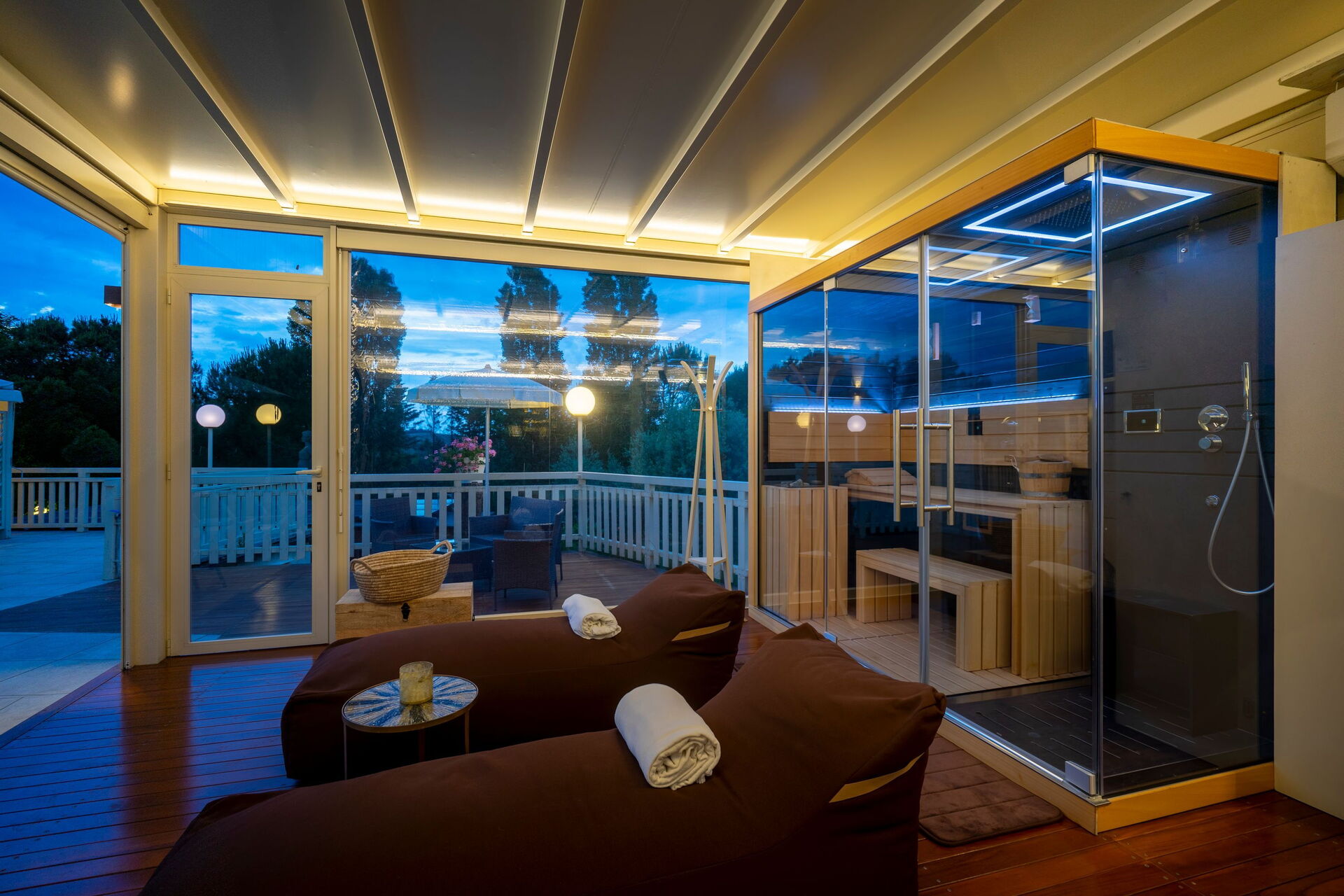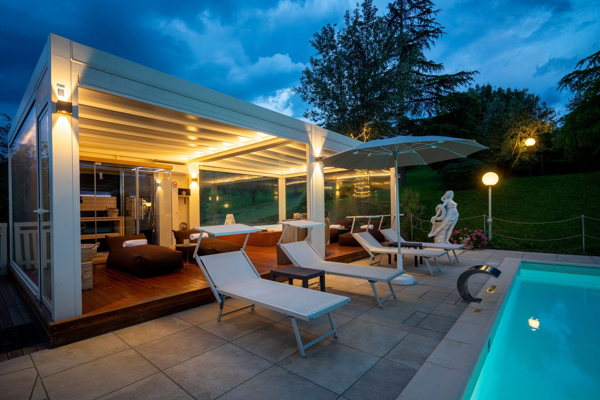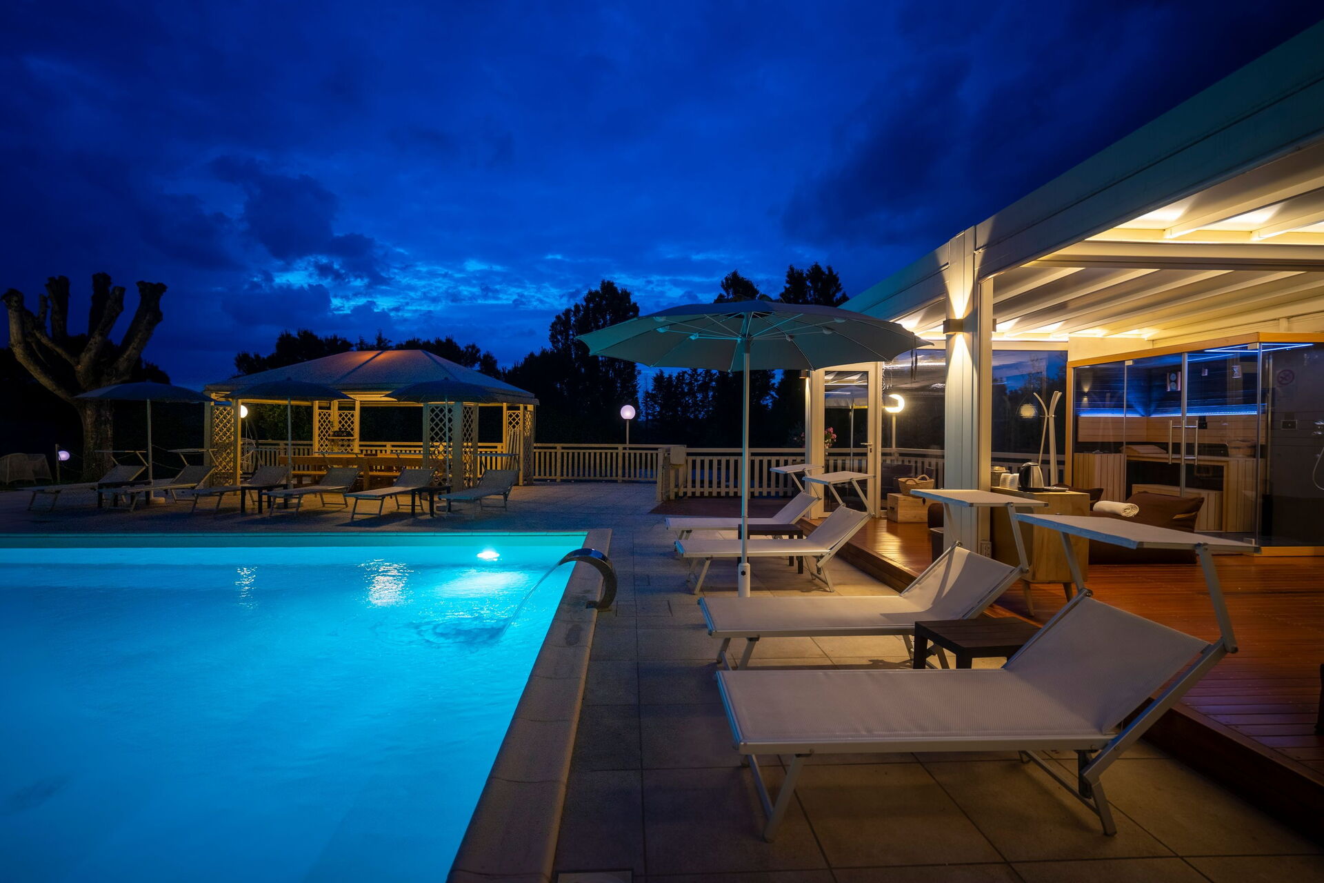 The panoramic outside spaces offer numerous communal areas and allow guests the chance to relax by the poolside where, along with a sun terrace, you will find a gazebo, an outdoor spa with sauna and Turkish bath available from 2 pm until midnight as well as a hot tub available 24 hours a day.