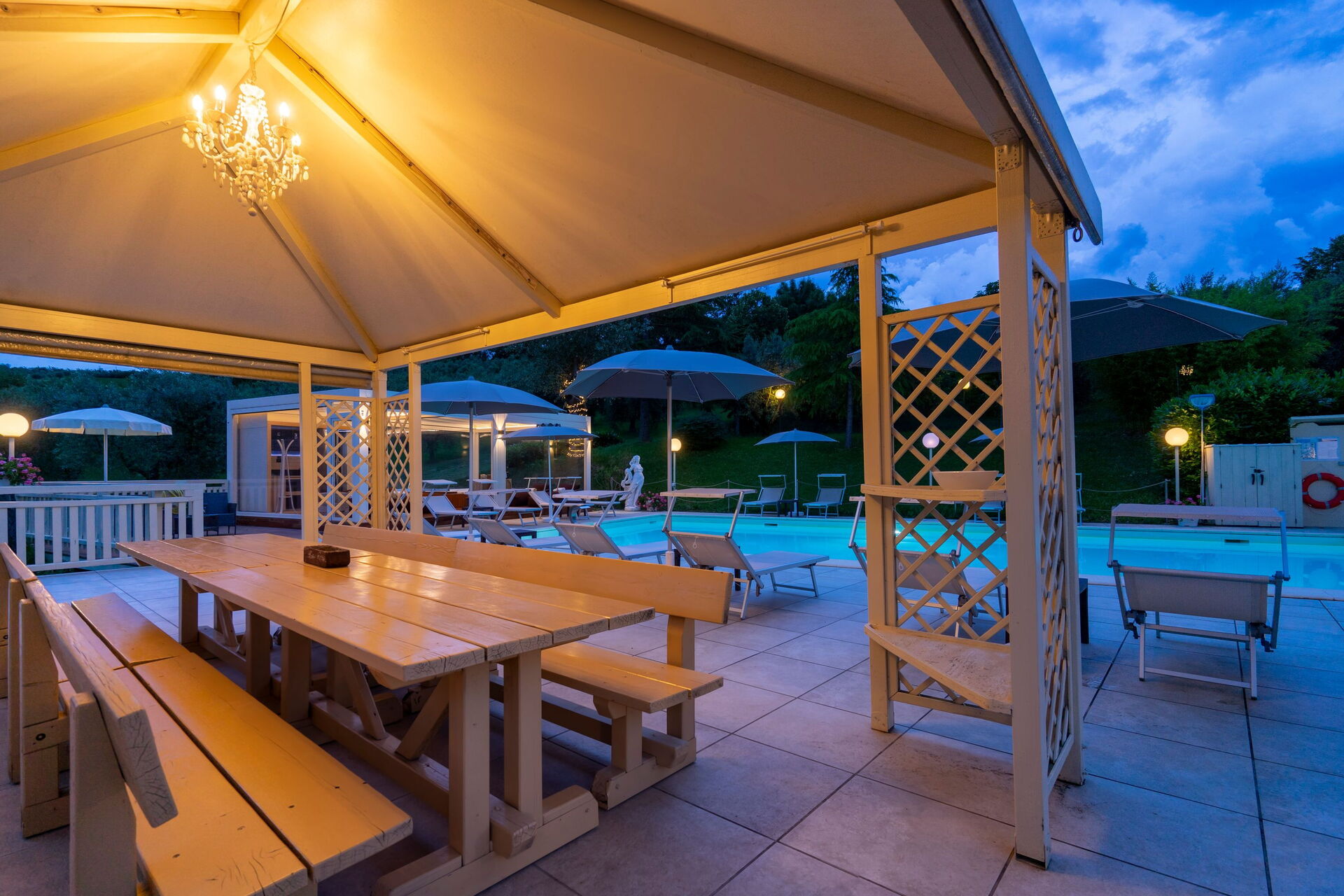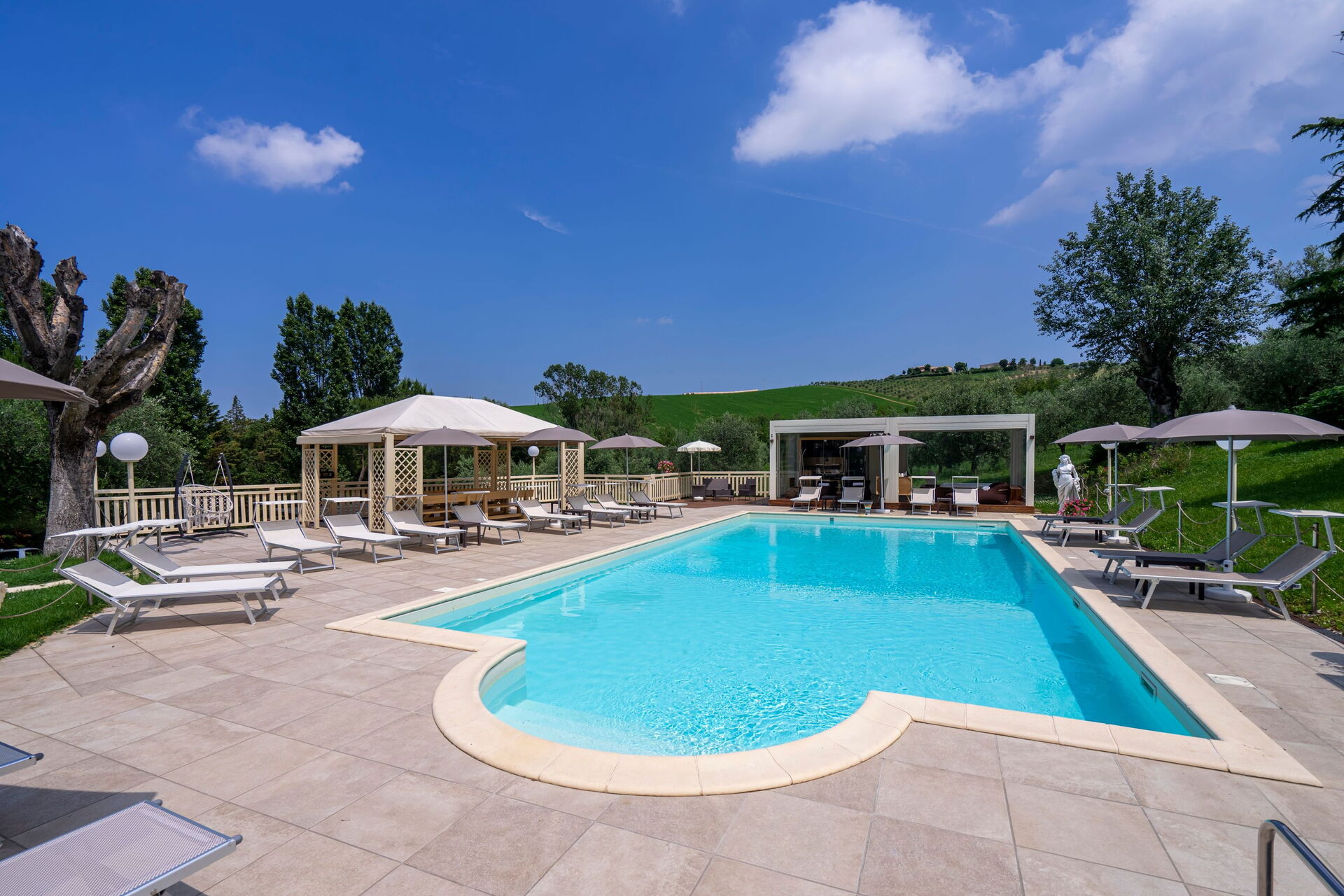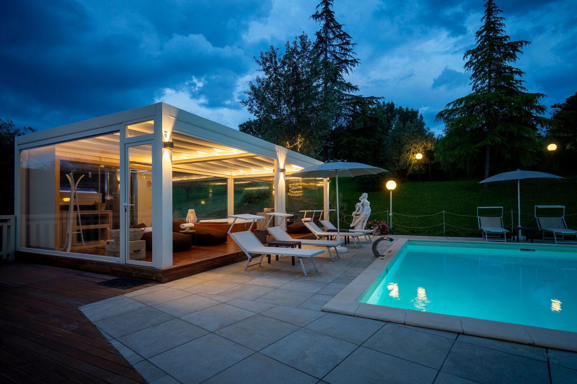 The panoramic outside spaces offer numerous communal areas and allow guests the chance to relax by the poolside where, along with a sun terrace, you will find a gazebo, an outdoor spa with sauna and Turkish bath available from 2 pm until midnight as well as a hot tub available 24 hours a day.