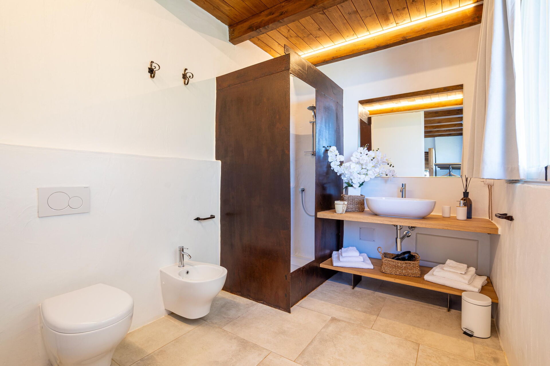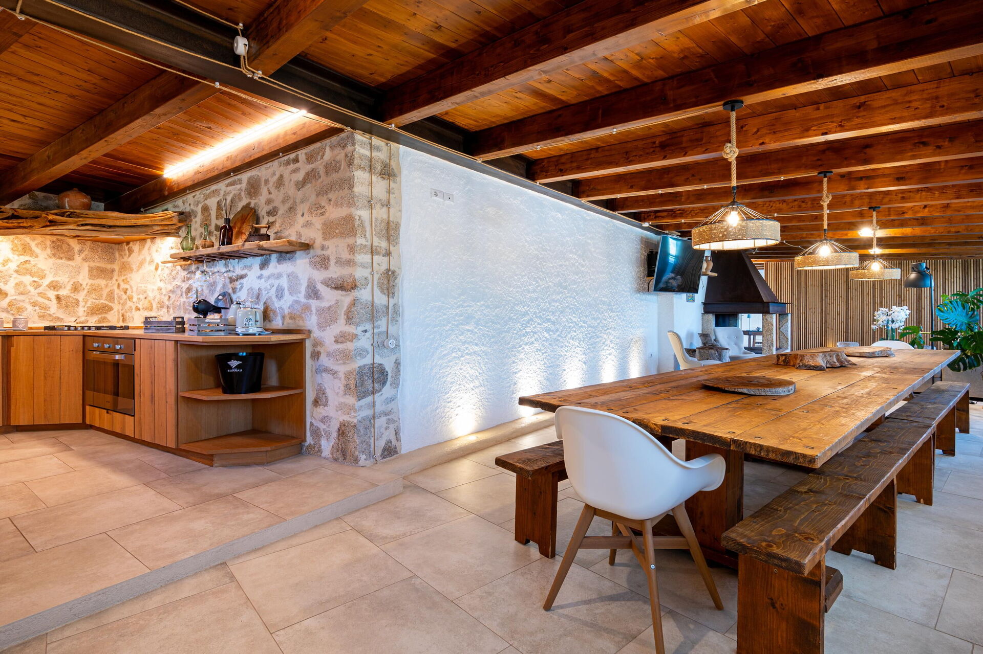 Ground floor: living room with fireplace and dining area, kitchen (cooktop, oven, refrigerator, freezer, dishwasher, microwave, espresso coffee maker), double bedroom (air conditioning) with private bathroom with shower, double bedroom (air conditioning), 2 bathrooms with shower.