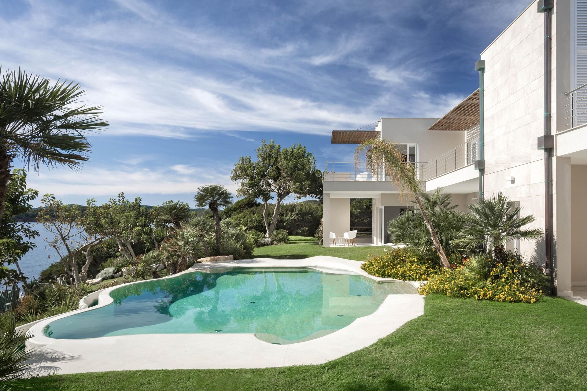 The stunning 2-floor villa rental offers 8 bedrooms to accommodate up to 16 people. The modern interiors offer all amenities. There is an elegant terrace running along an entire side of the first floor that features a large pergola with an outdoor dining area. In the large garden that surrounds the entire property there is a private pool facing the sea where you can enjoy fantastic sunsets. Various relaxation areas are scattered around the pool and the rest of the property. Just a stone’s throw away from the sea, it is great for exploring the entire Alghero bay and Maddalenetta island.