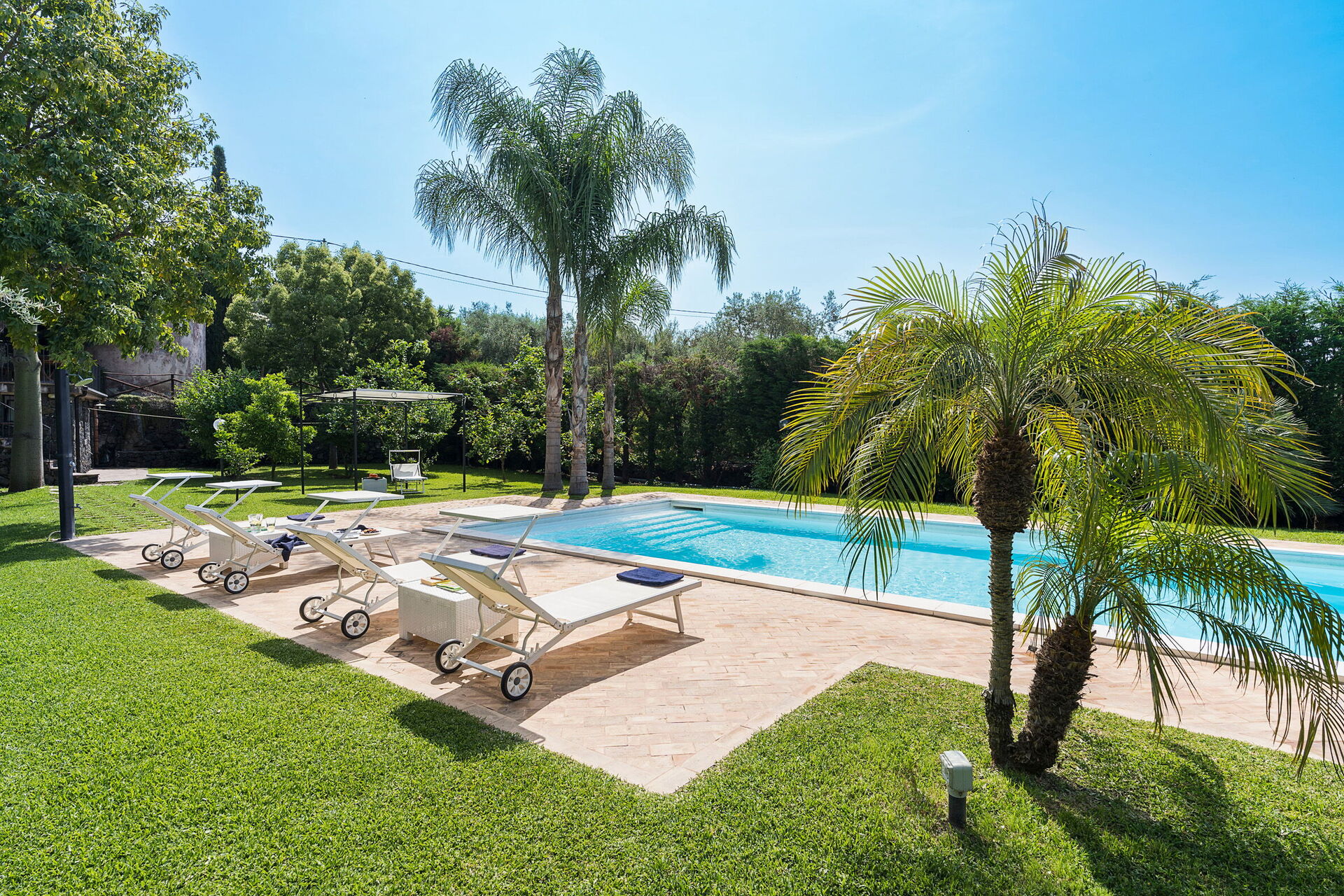 This marvelous villa looks out onto a well tended garden with a lawn and a beautiful saltwater pool; there are large furnished terraces where guests can spend unforgettable moments under the Sicilian sun.