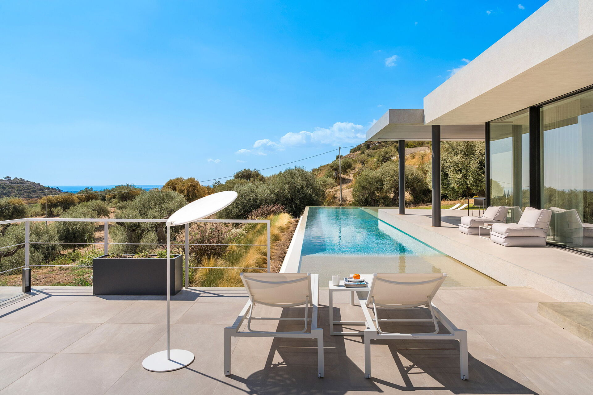 Modern and luxurious, this exclusive villa sits in a scenic spot with breathtaking panoramic sea views from the pool, large terraces and garden.