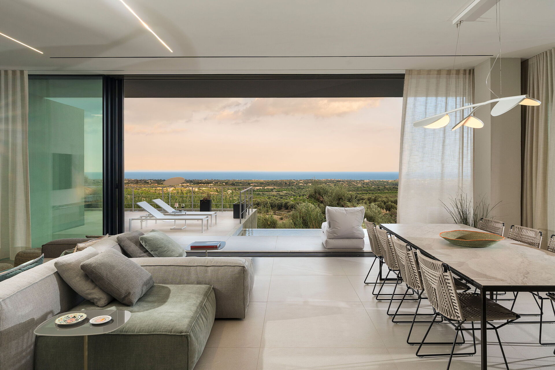 Villa Calypso has two floors of welcoming, tastefully furnished, elegant interiors designed for contemporary living. With 4 bedrooms (each with a private bathrooms), and a large living space that looks out onto the pool area and surrounding landscape, this gorgeous villa rental can comfortably accommodate up to 8 people.