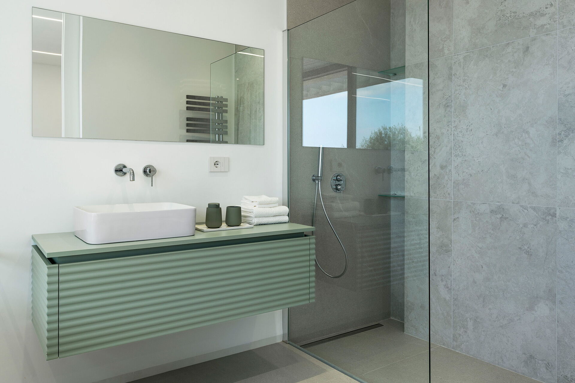Lower floor: 2 double bedrooms (bed dimensions: 180 x 200 cm) with walk-in closet and private bathroom with bathtub and with shower, 1 bedroom with two single beds (bed dimensions: 120 x 200 cm) with walk-in closet and private bathroom with shower.