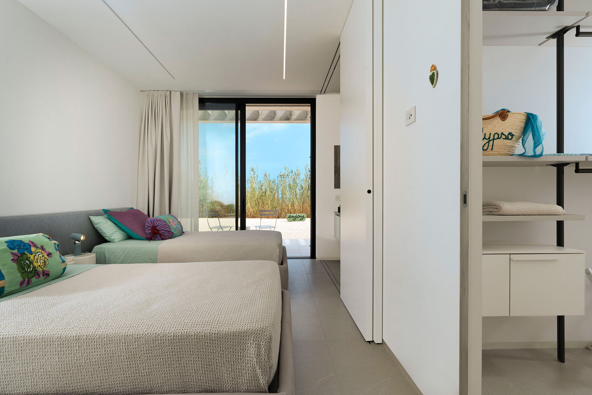 Outside, there is a large pool with a sunbathing area with sun loungers and small tables: it is the perfect place to relax and cool off with friends and family under the Sicilian sun, enjoying beautiful views of the sea and surrounding countryside.