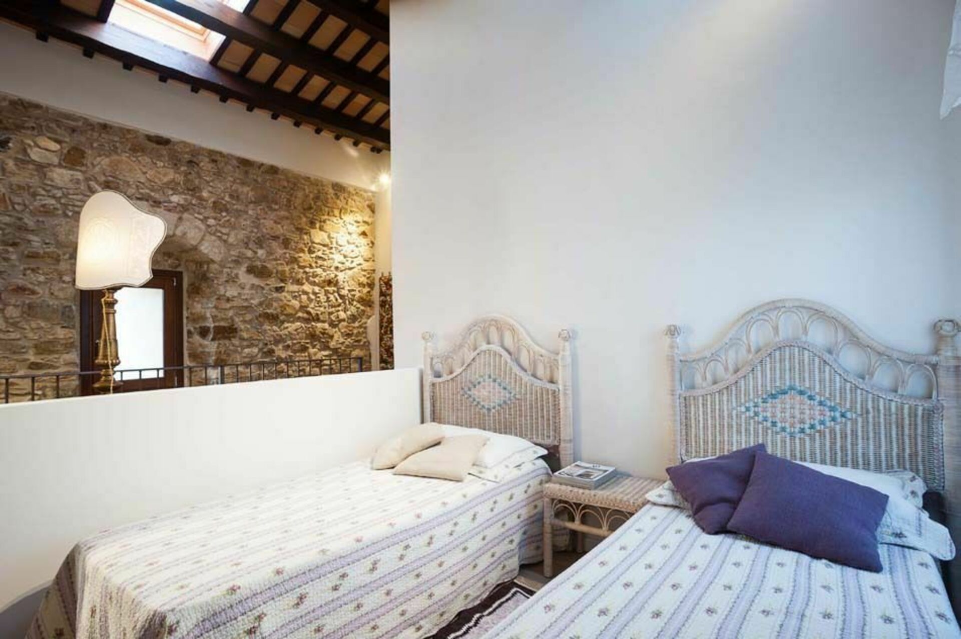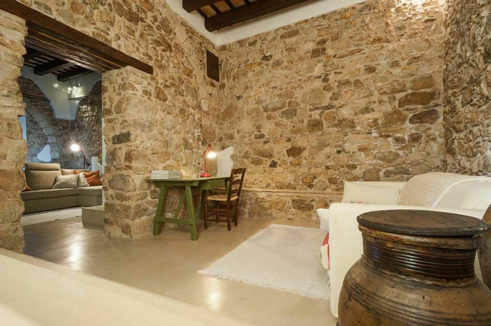 Wood beamed ceilings and thick stone walls characterize a welcoming living room with a fireplace, a well-equipped kitchen that opens onto the terrace, two comfortable double bedrooms, a walk-through bedroom with two single beds and two bathrooms.
