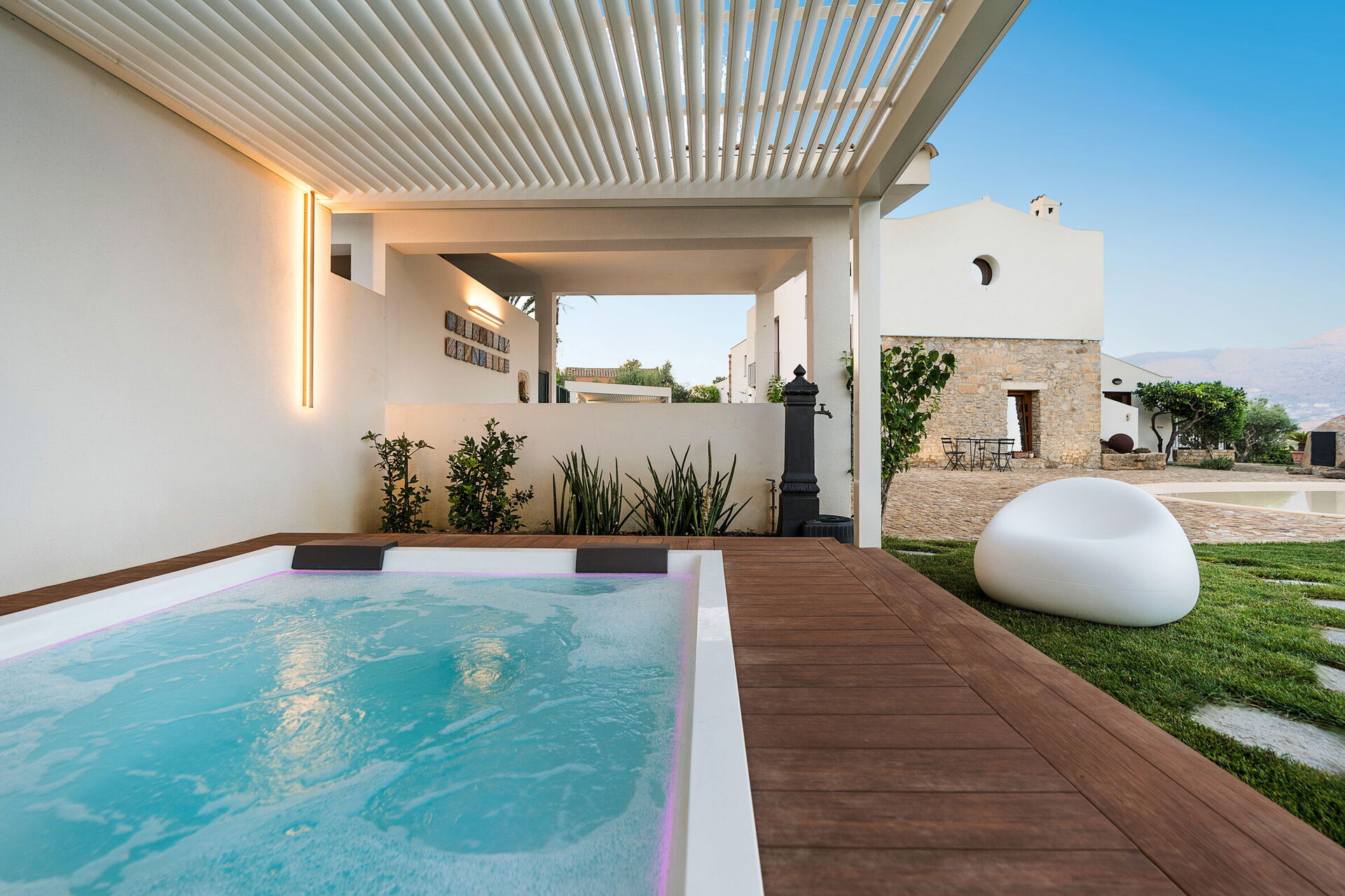 In the vicinity one can visit the most charming towns, archaeological sites and landscapes of the western part of Sicily, such as the medieval old town centre of Erice, the impressive temple of Segesta, the island of Mozia, the Zingaro’s natural reserve, the Egadi Islands, Marsala’s salt pans and the beautiful Trapani. This exclusive dwelling is located in a sunny, quiet but not secluded place and has a stunning countryside view. Its wide terraces and the wonderful swimming pool are the ideal spots to enjoy this lovely landscape.