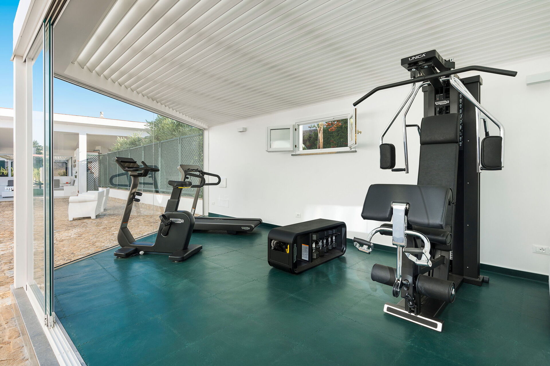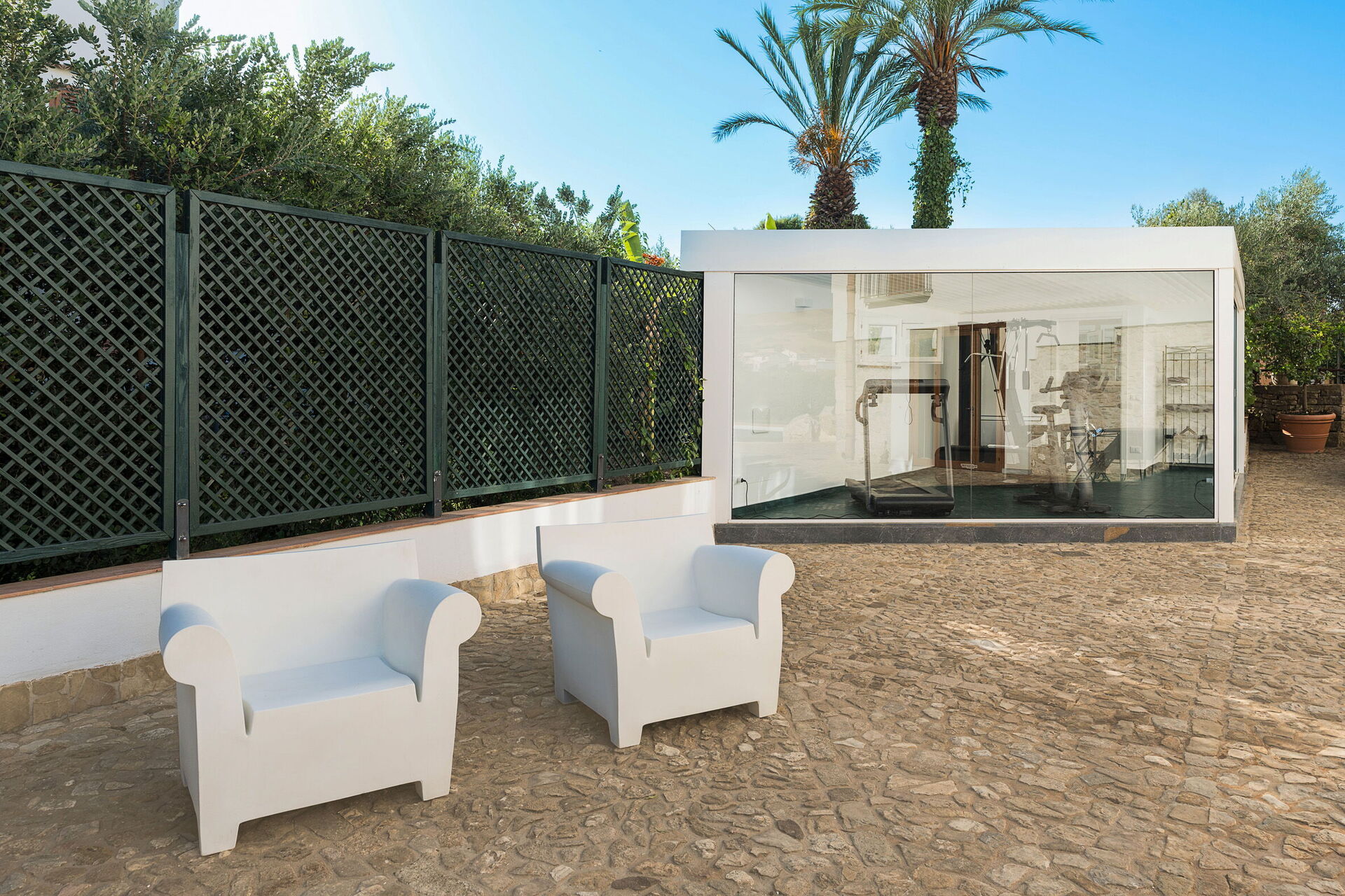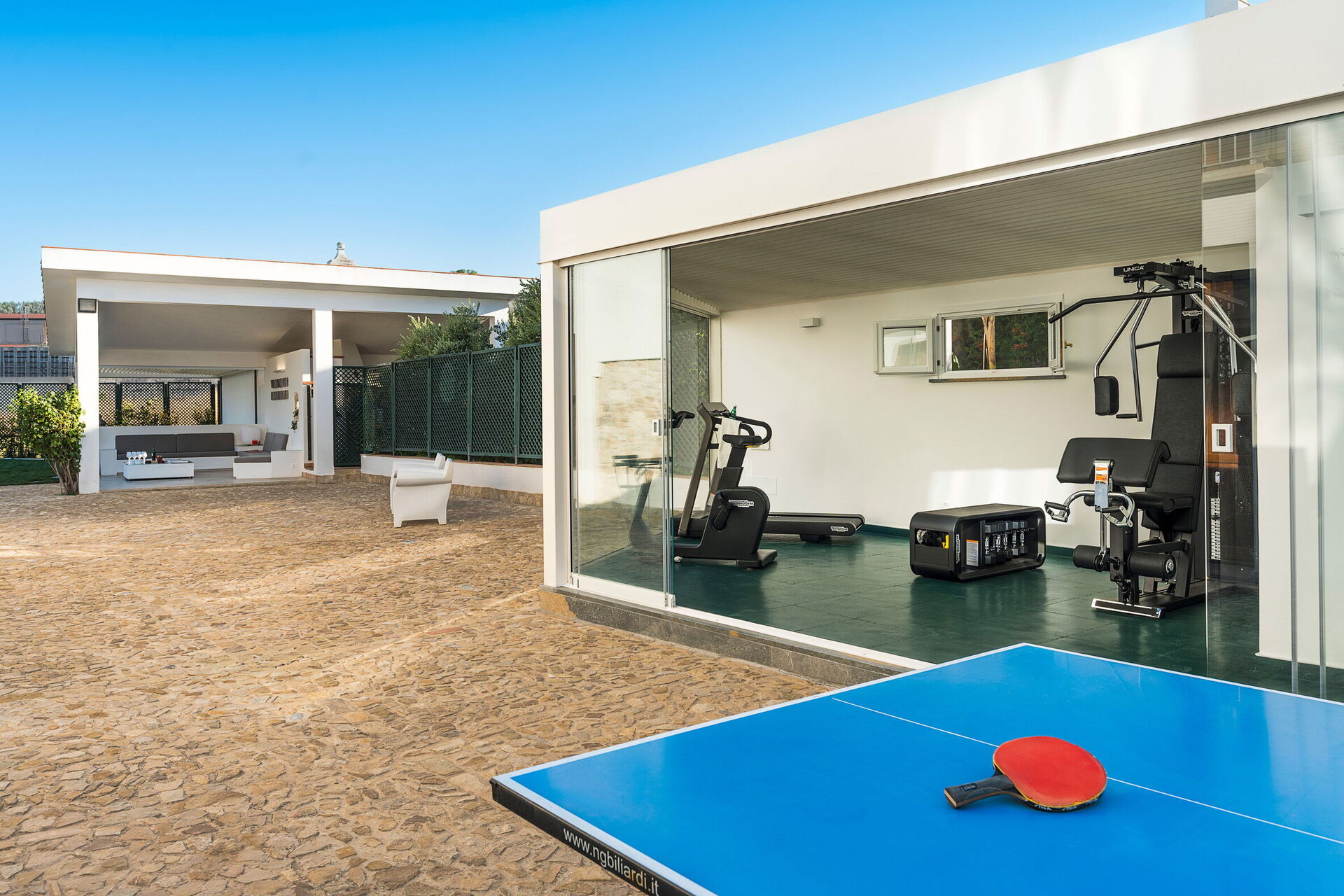 Exterior: Loggia, dining area, terraces, garden, swimming pool, solarium, fitness area with bathroom-shower.