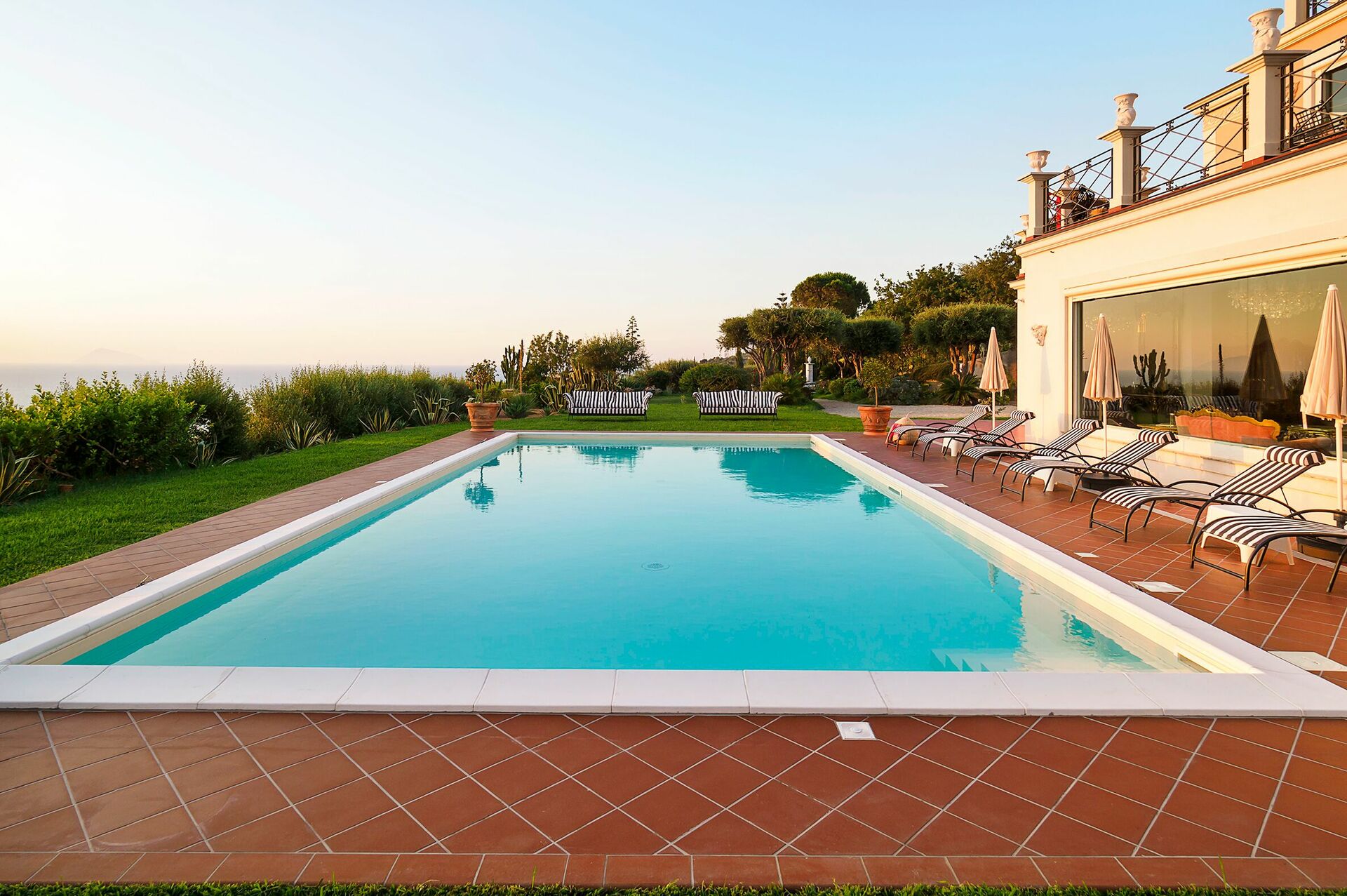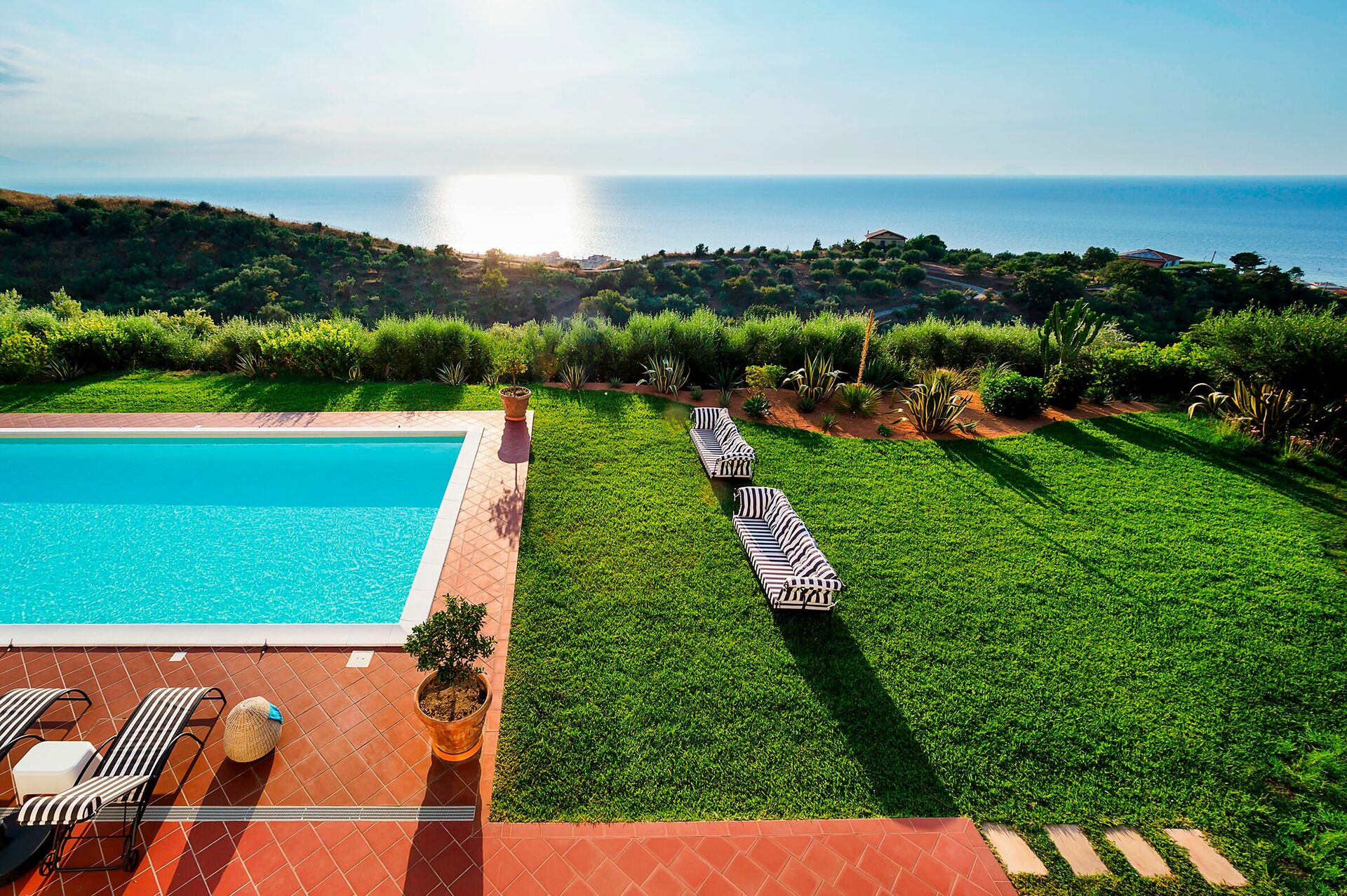 Villa Estella sits in a peaceful, sunny location with panoramic views. From the lush garden, spacious terraces, and exclusive swimming pool, you can enjoy enchanting views of the sea and Aeolian Islands, especially at sunset.