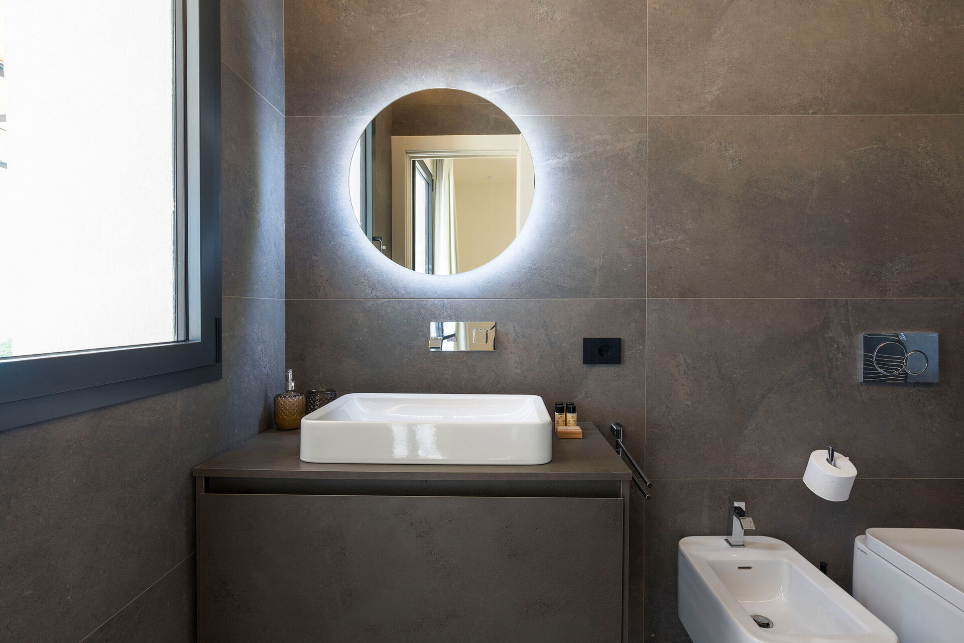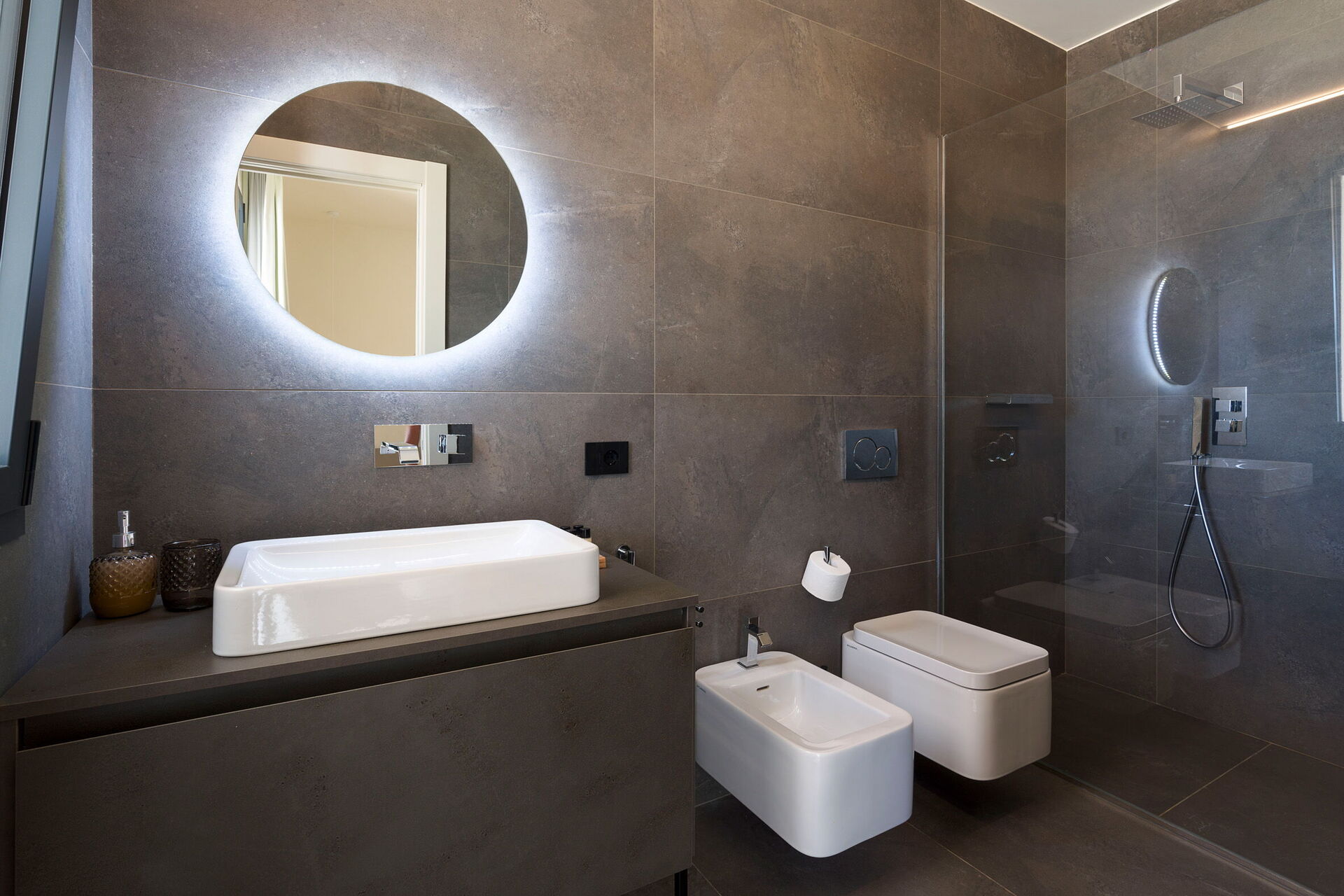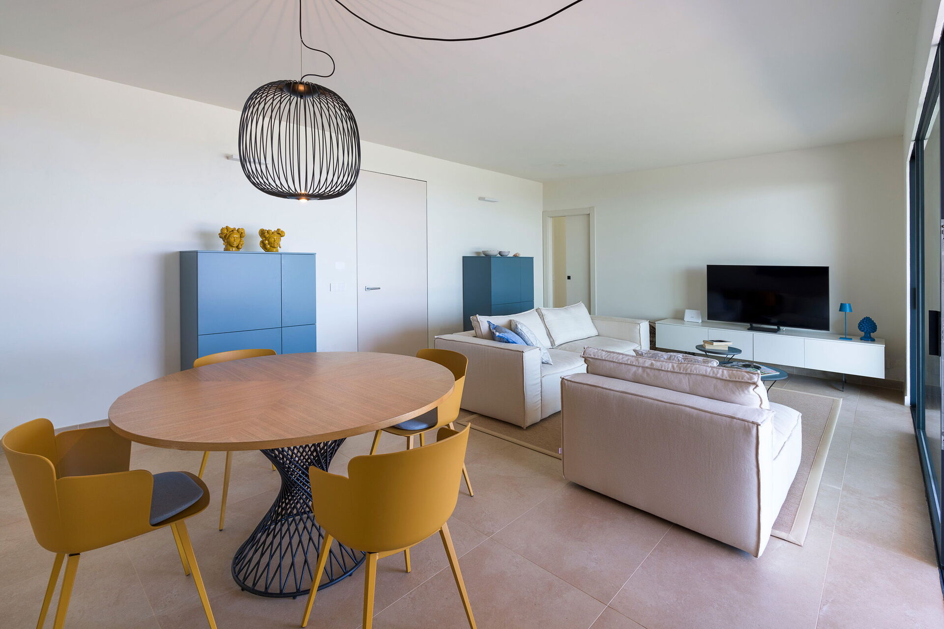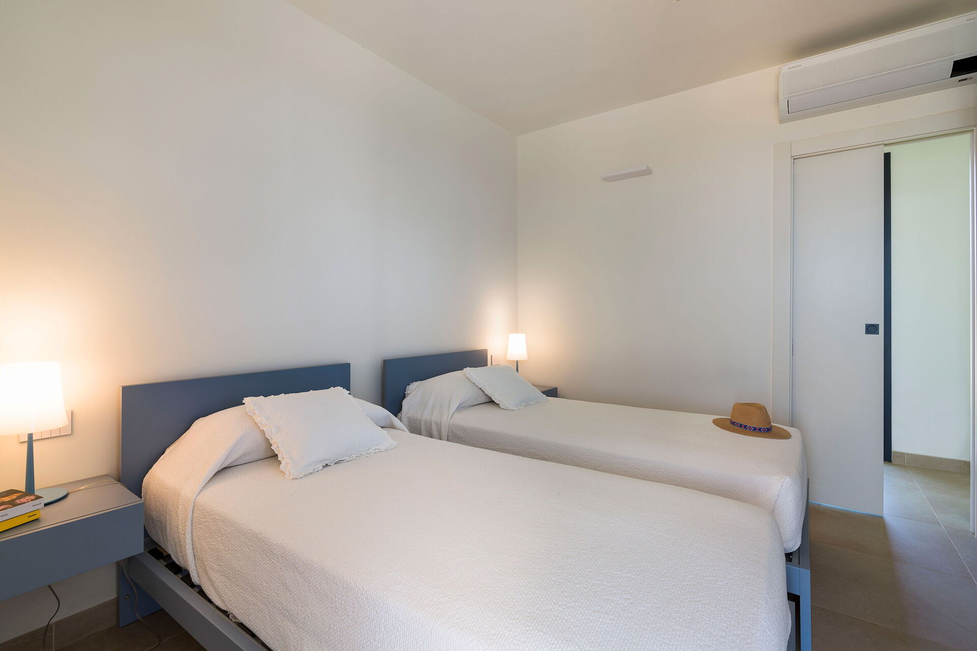 Ground floor: living room with panoramic views (TV) with dining room, kitchen (cooktop, oven, freezer, refrigerator, dishwasher, coffee maker, toaster), bedroom with 2 single beds (air conditioning), bathroom with shower, 2 double bedrooms (air conditioning) each with a private bathroom with shower.