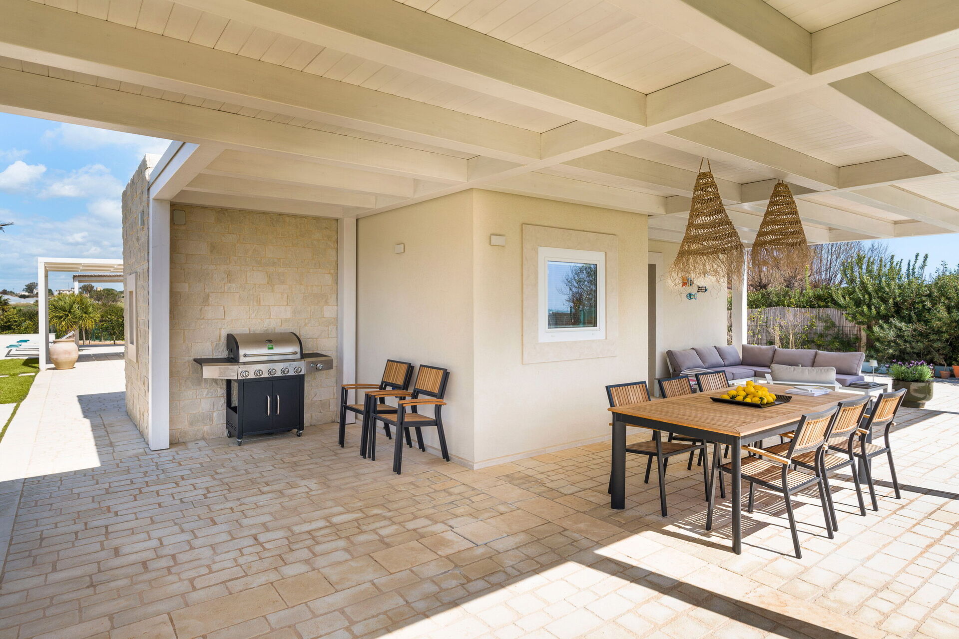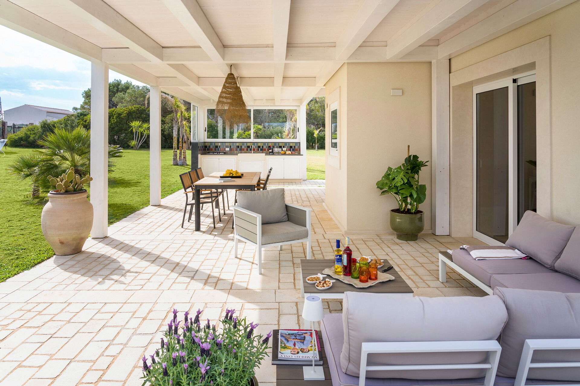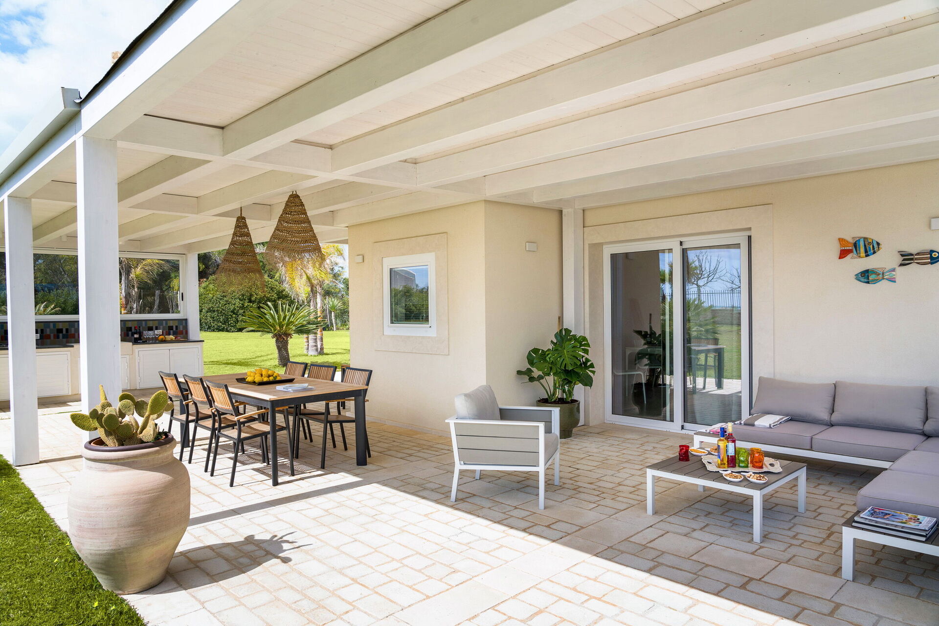 The panoramic outdoor areas offer numerous spaces that permit guests to enjoy a pleasant stay with family or friends, relaxing on the veranda equipped for al fresco dining or in the large pool area with a sun terrace, ideal for spending a pleasant time under the Sicilian sun.