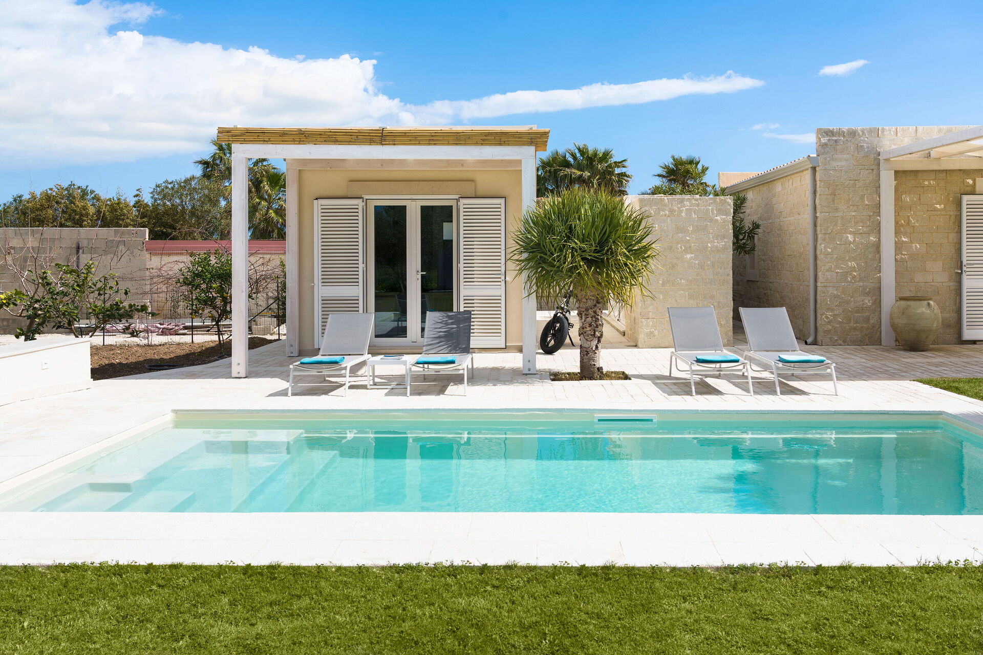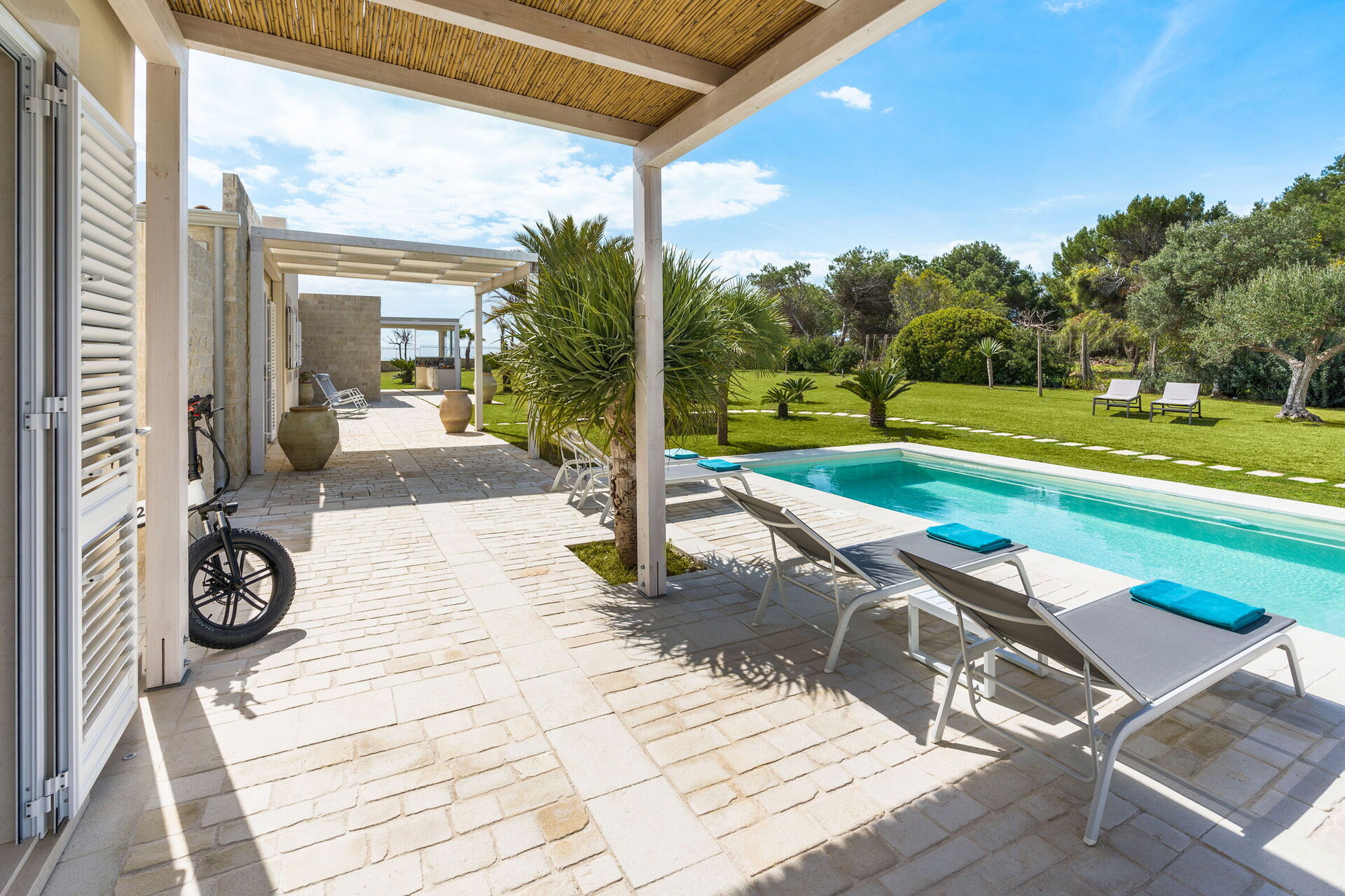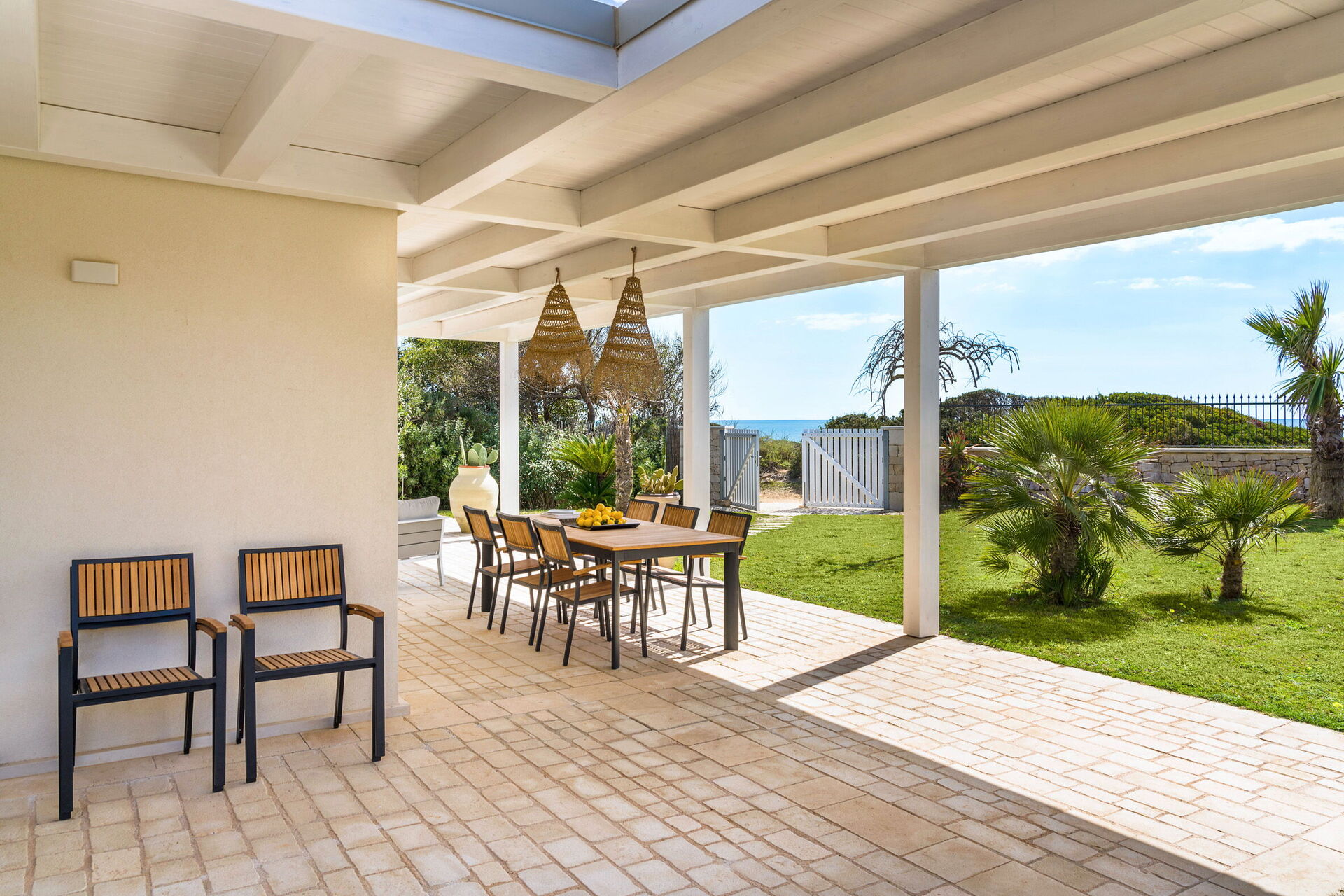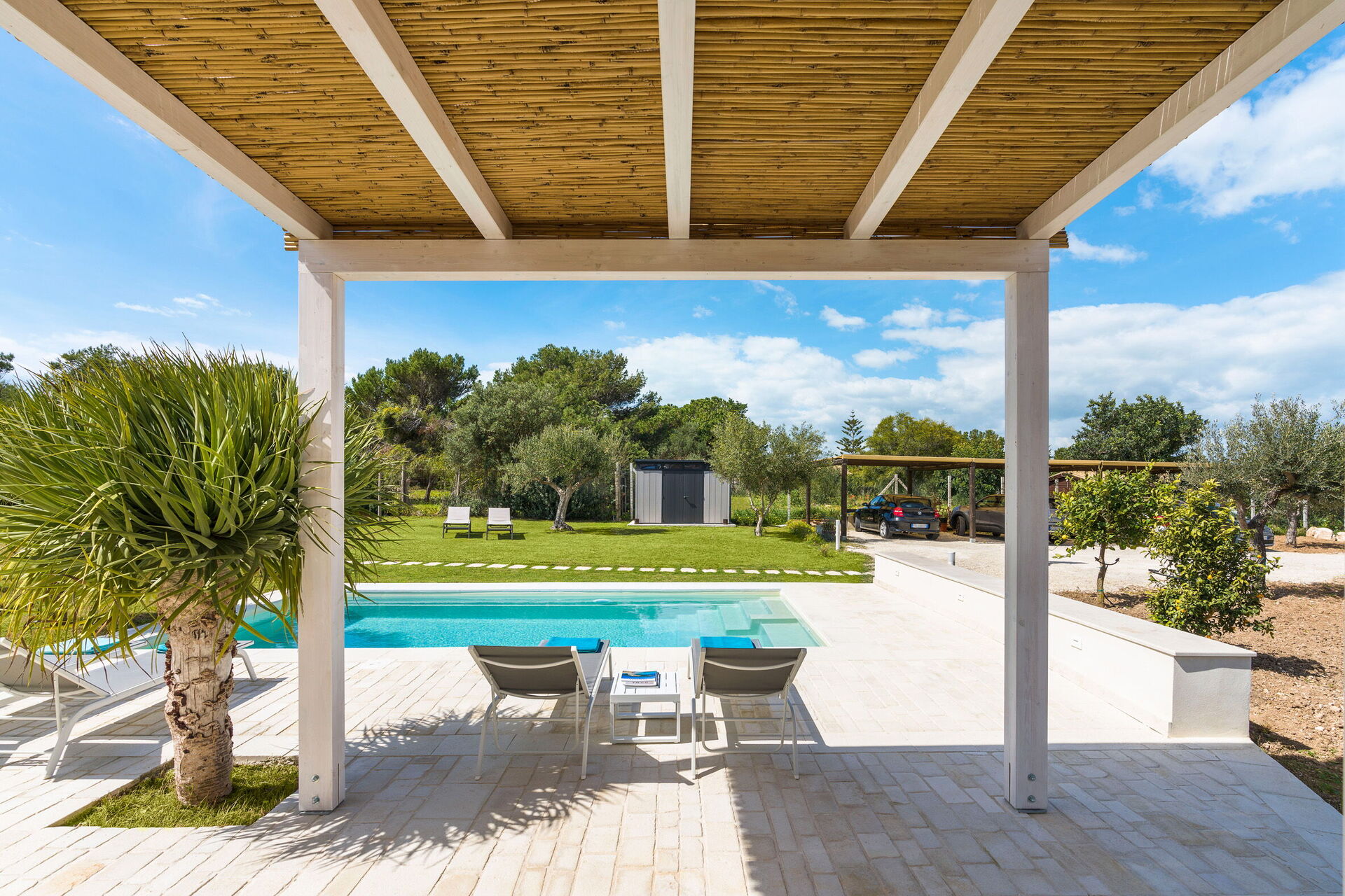 The panoramic outdoor areas offer numerous spaces that permit guests to enjoy a pleasant stay with family or friends, relaxing on the veranda equipped for al fresco dining or in the large pool area with a sun terrace, ideal for spending a pleasant time under the Sicilian sun.