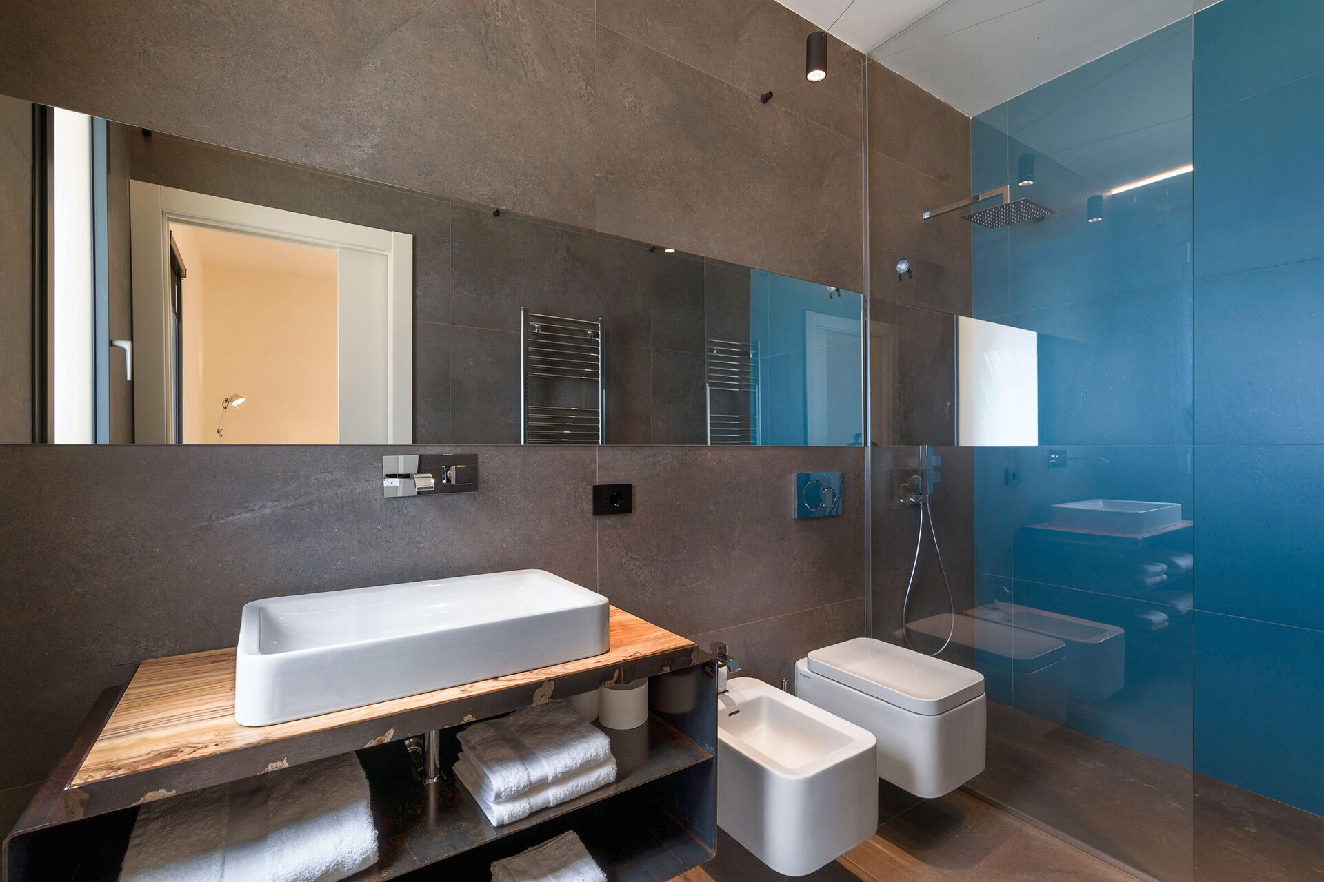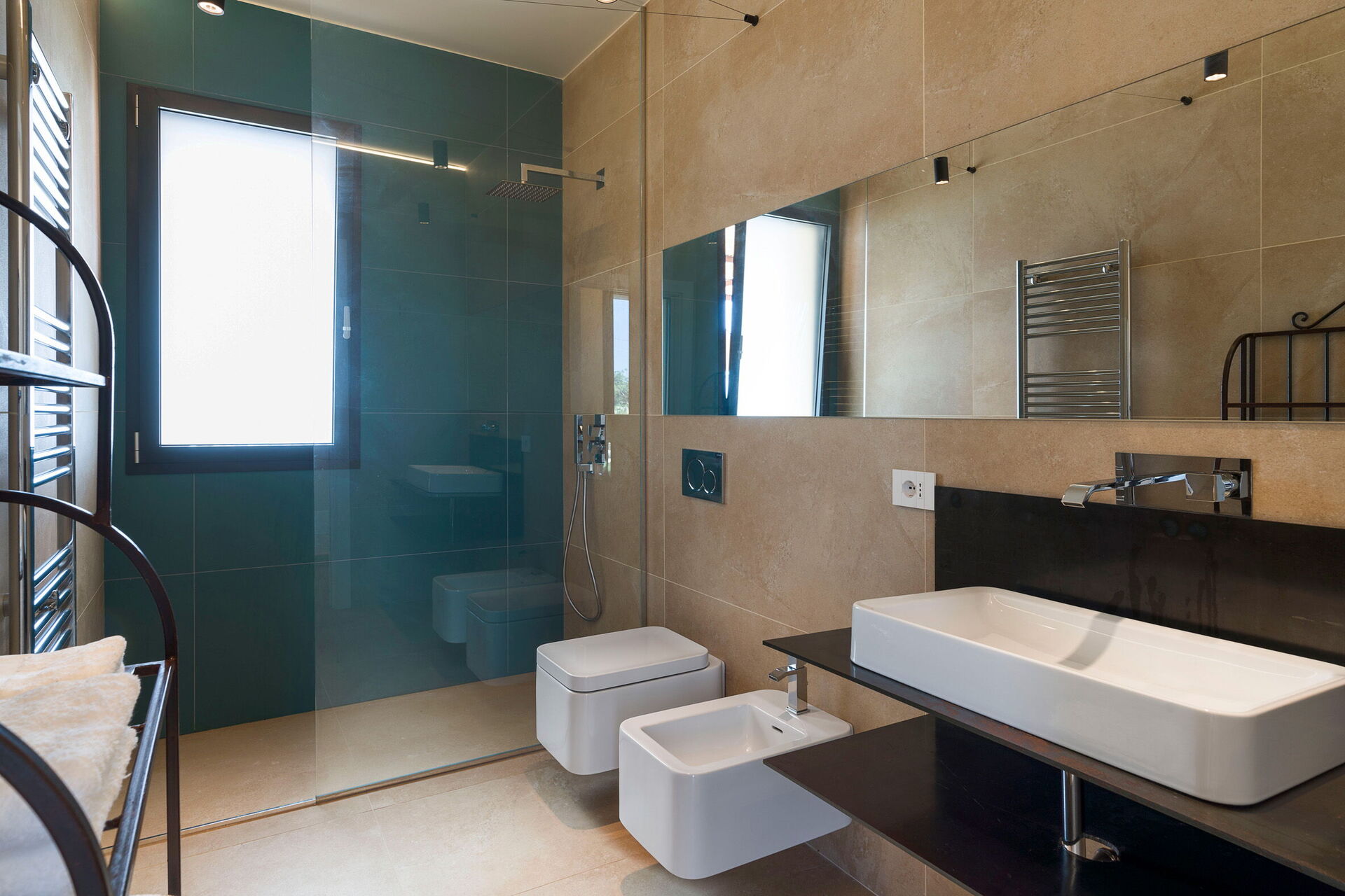 Ground floor: living room with panoramic views (TV) with dining room, kitchen (cooktop, oven, freezer, refrigerator, dishwasher, coffee maker, toaster), bedroom with 2 single beds (air conditioning), bathroom with shower, 2 double bedrooms (air conditioning) each with a private bathroom with shower.