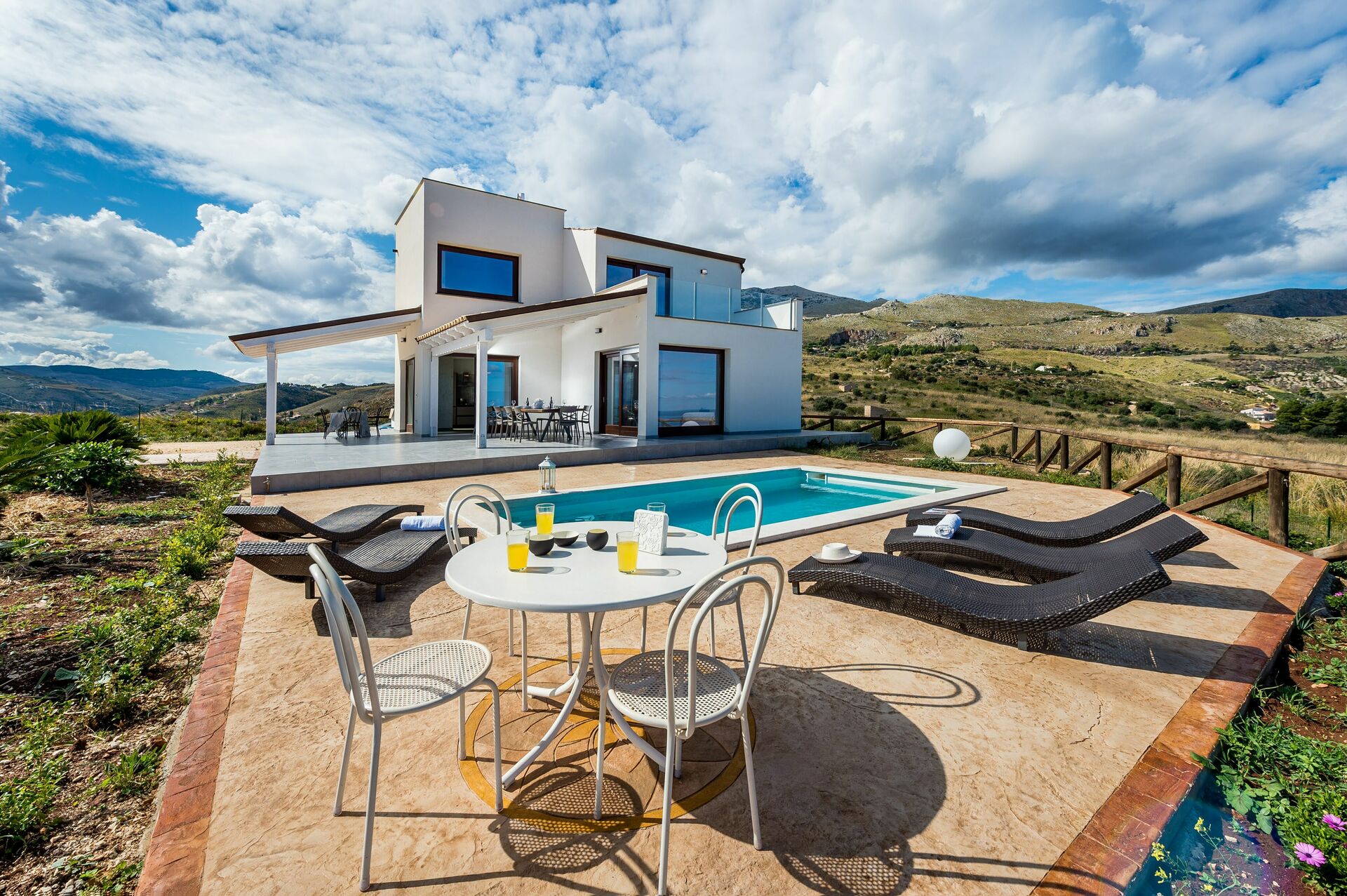 Modern villa for rent with private swimming pool and 4 bedrooms located in Sicily just 6 km away from the gorgeous village of Scopello, known all over the world for its ancient "tonnara" (a traditional way to catch tunas).