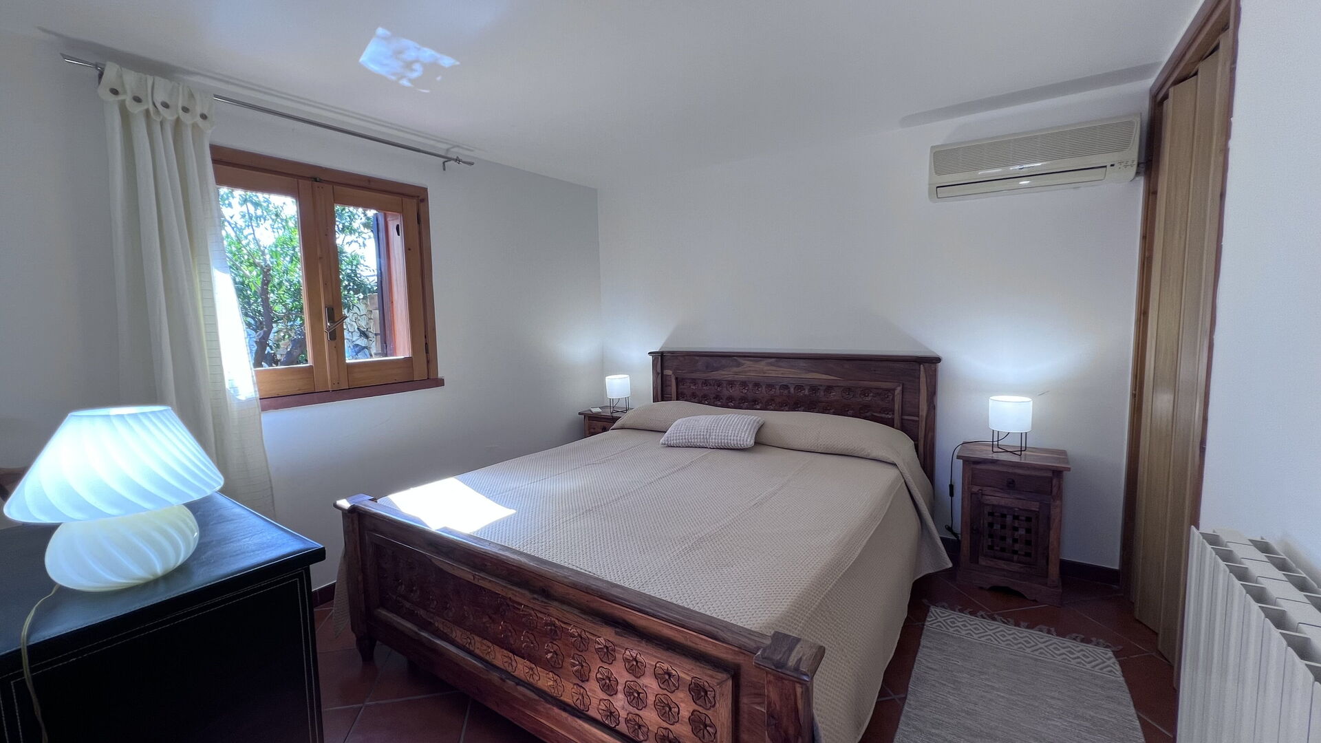 Ground floor: large living room (TV, air conditioning) with kitchen corner (refrigerator, oven) and single sofa bed, double bedroom, bedroom with single bed (without window), bathroom with shower.