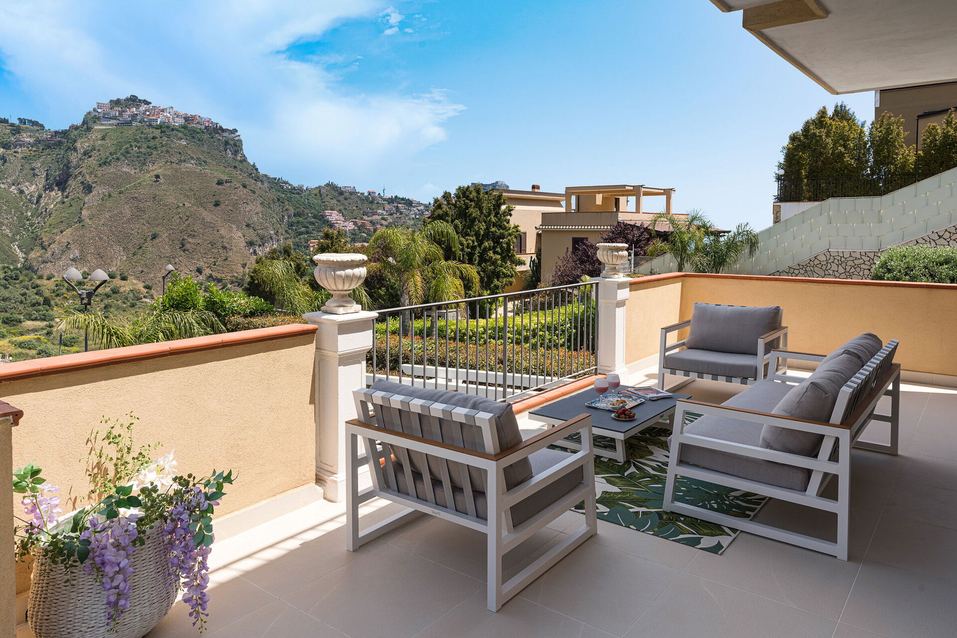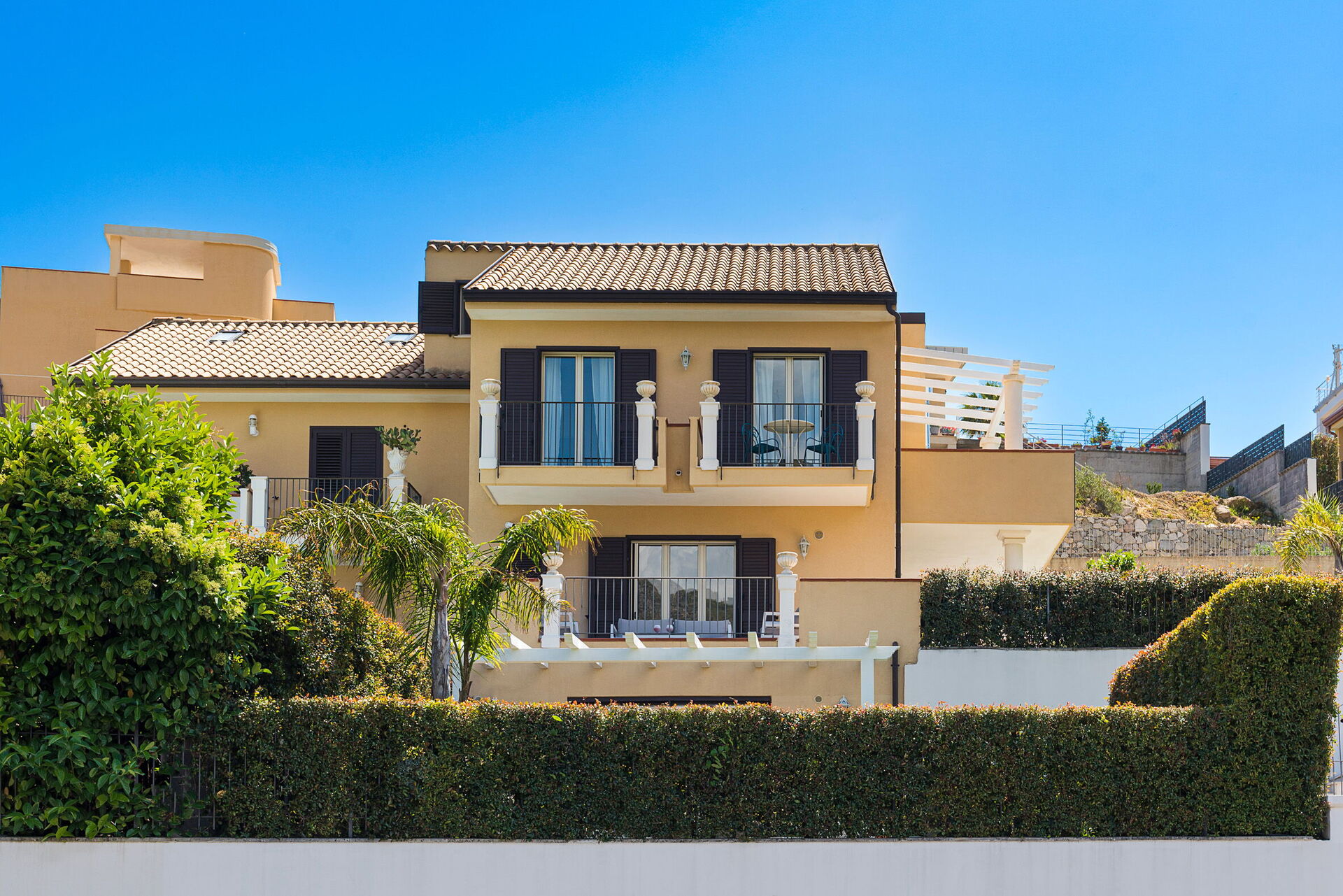 This marvelous modern villa sits in a calm residential area on a hill, with splendid sweeping views of Taormina and Castelmola.