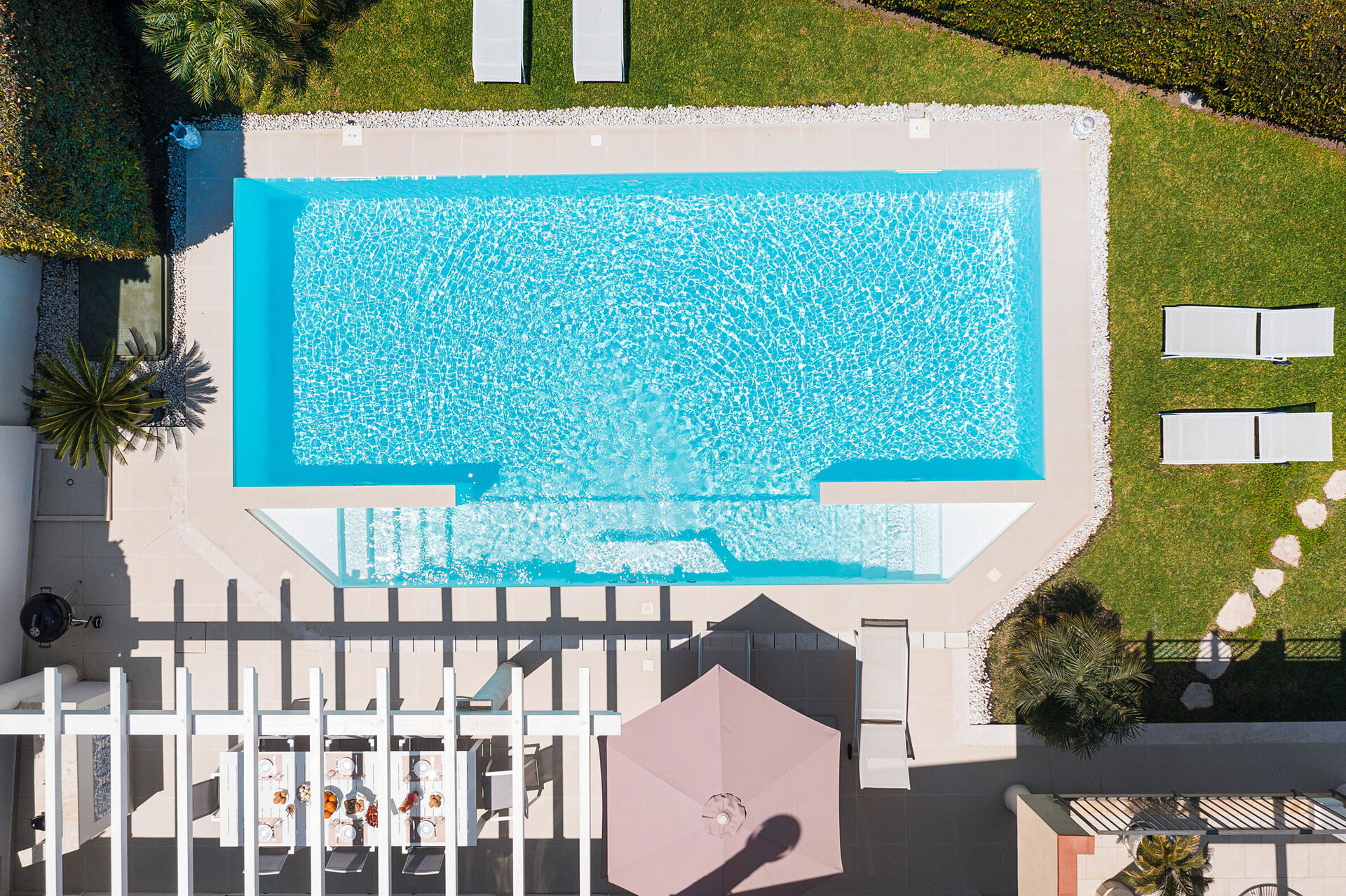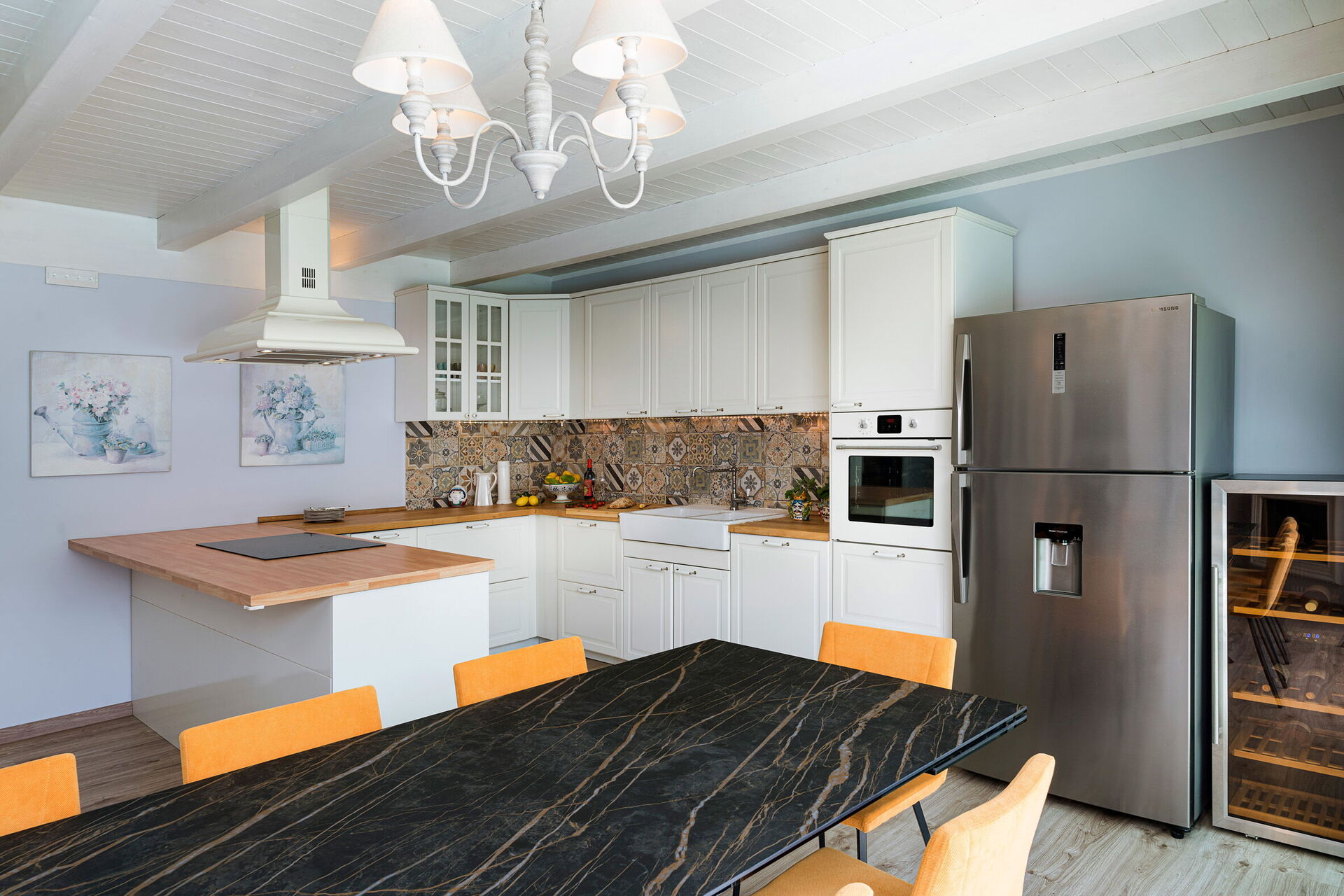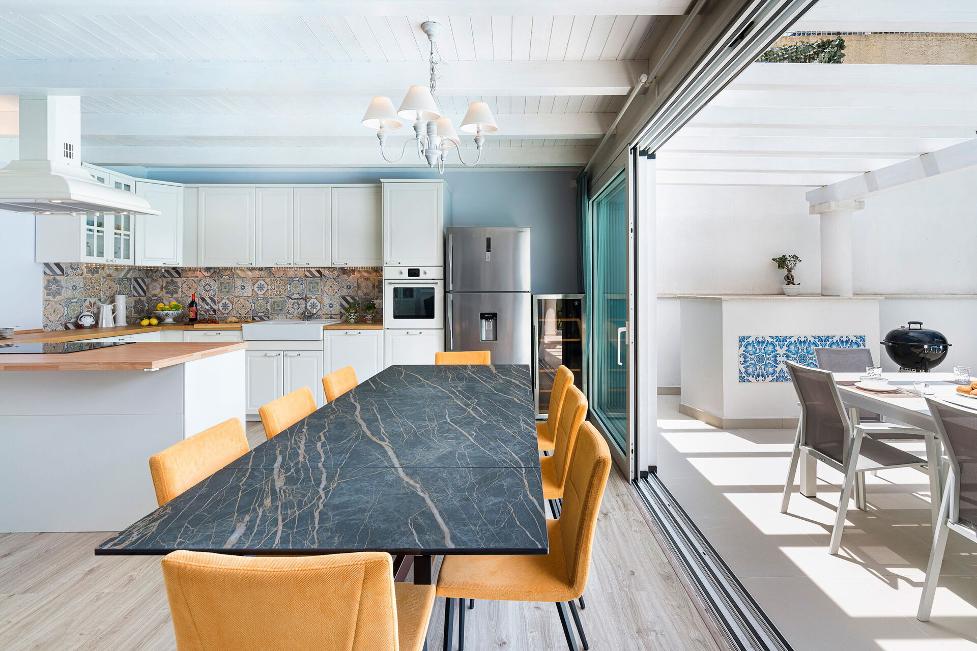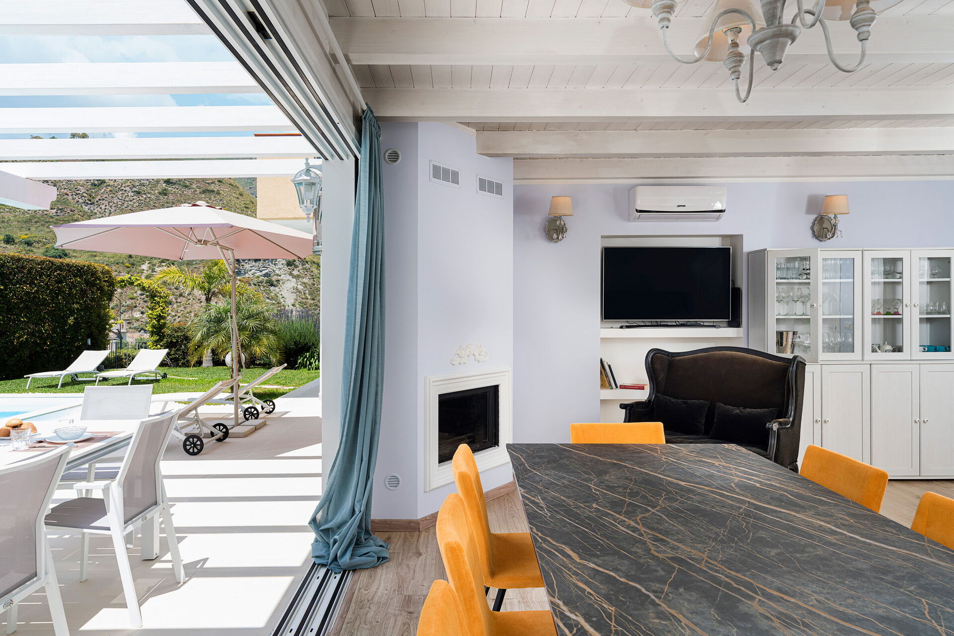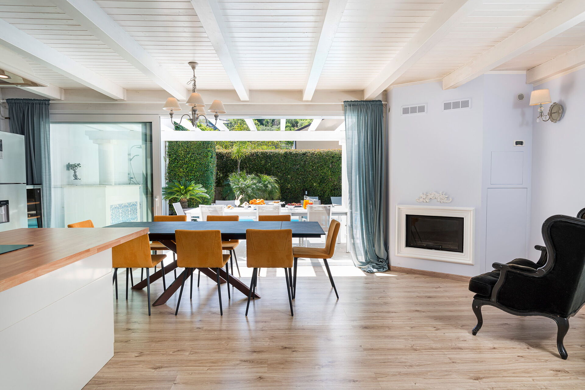 From the property entrance gate, steps lead to the villa’s ground floor. On this level there is also a well-tended garden that offers a saltwater pool with massaging water jets; and various corners furnished with table, chairs and a barbecue area for relaxing outside.
