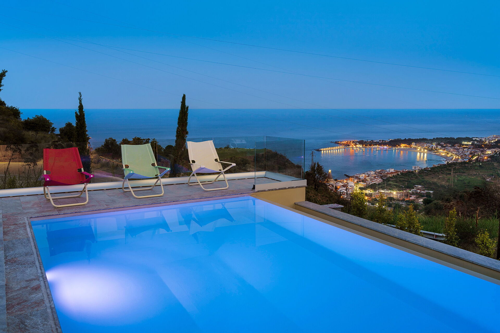 This exclusive vacation villa in Sicily sits in a scenic spot with breathtaking views of the sea and Taormina bay, from both the pool and spacious terraces.