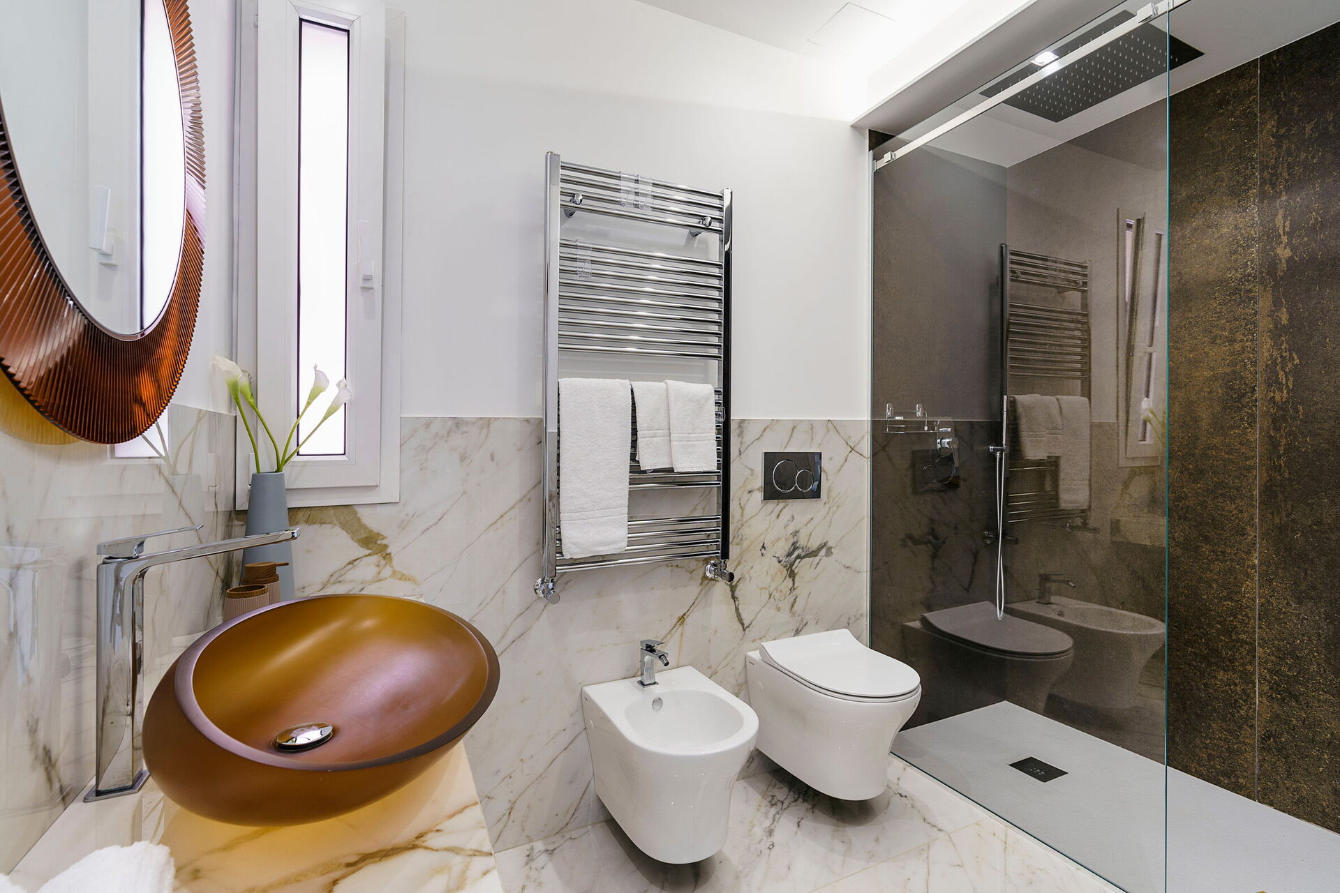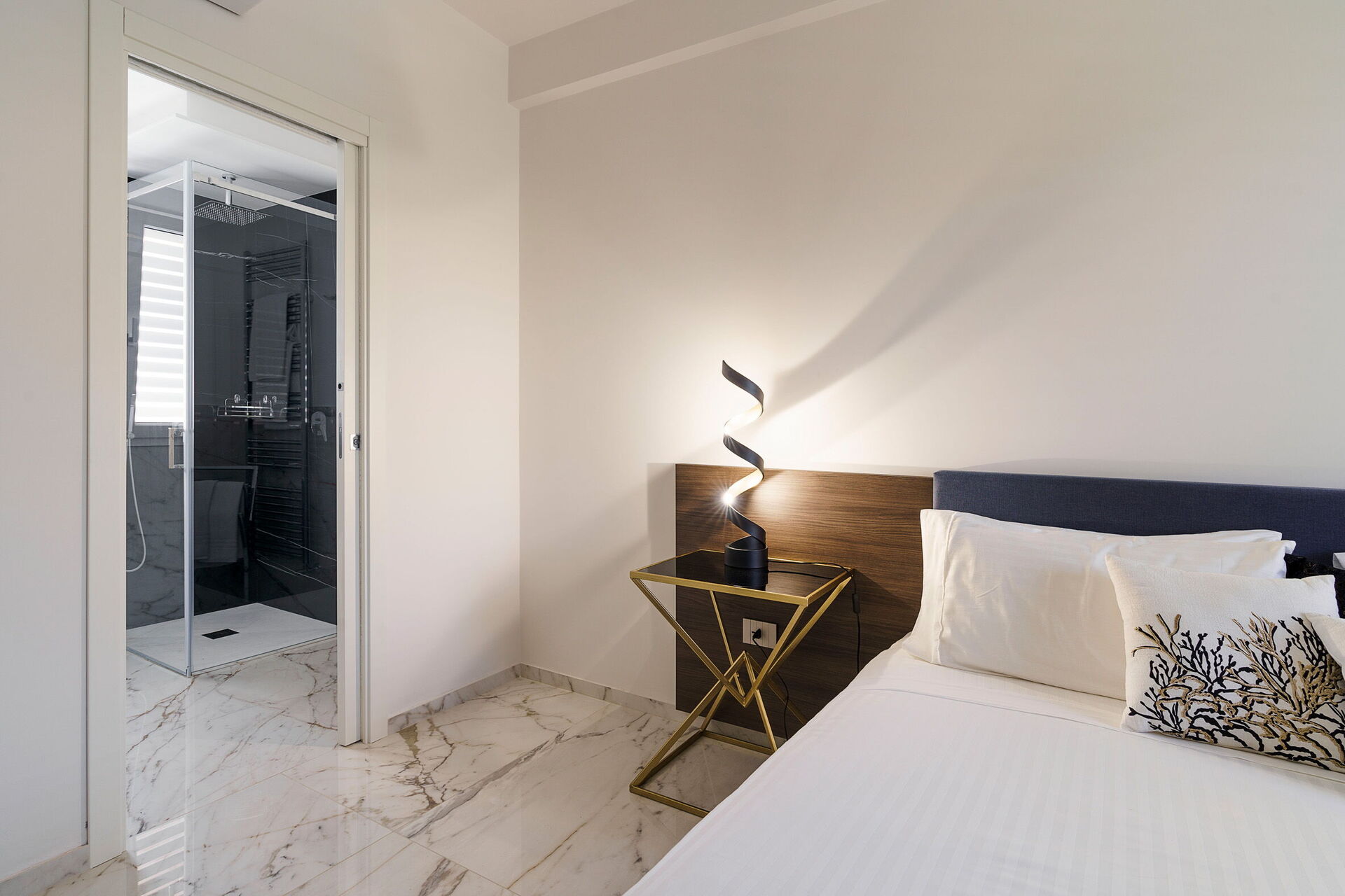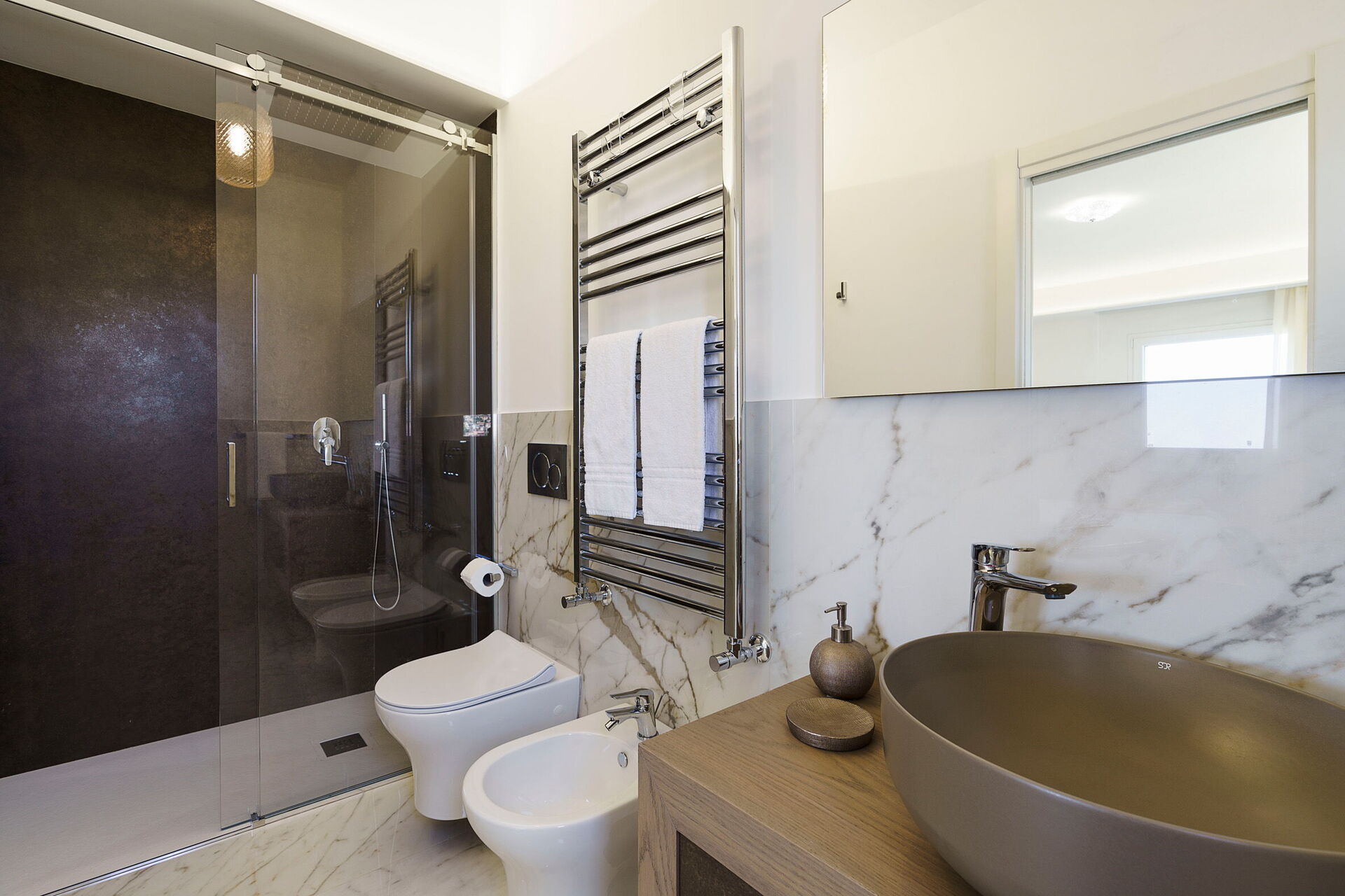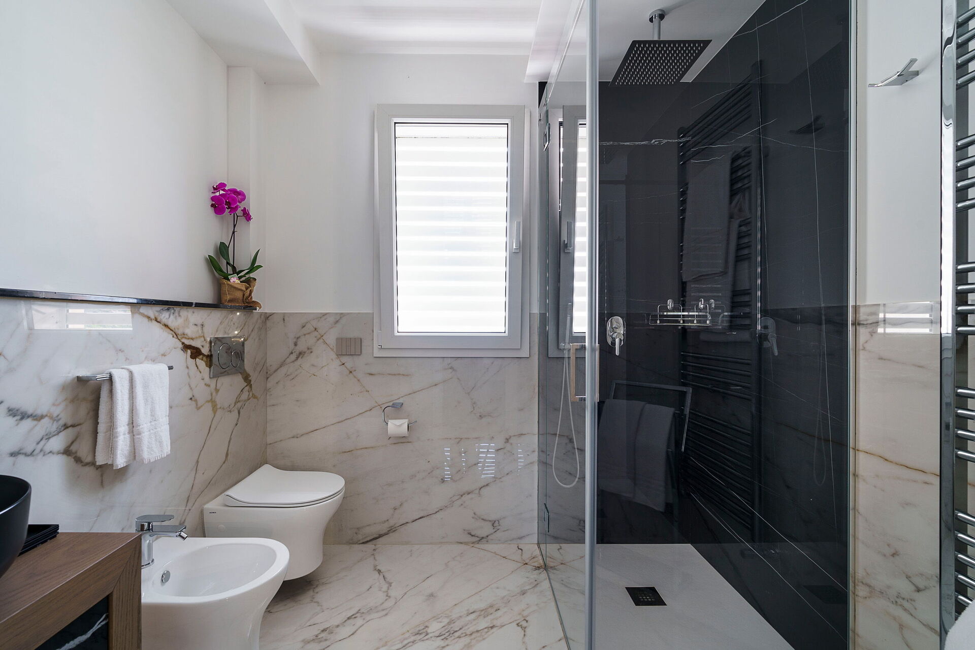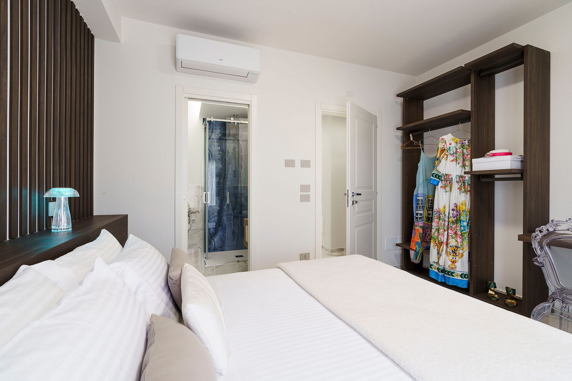 First floor: living room (air conditioning, smart TV) with dining area, kitchen (cooktop, oven, refrigerator, freezer, dishwasher, toaster, espresso coffee maker, American coffee maker), wc, laundry room, double bedroom (air conditioning, king-size bed) with private bathroom with shower, double bedroom (air conditioning) with private bathroom with shower.