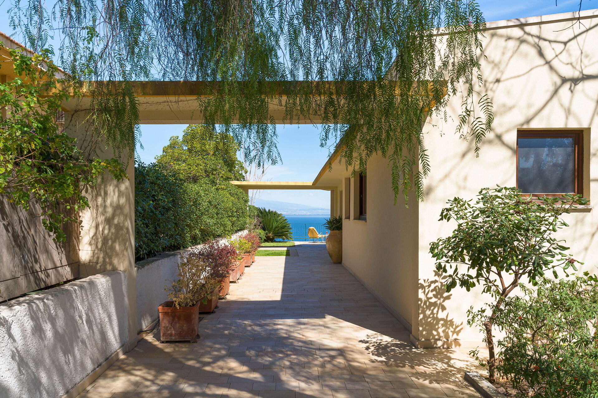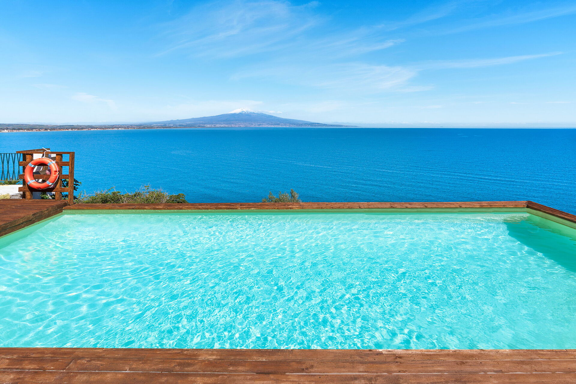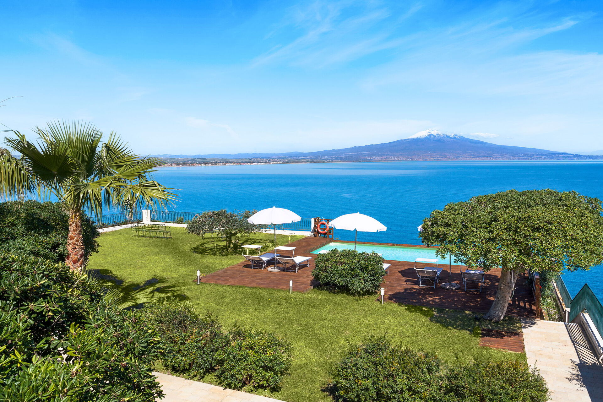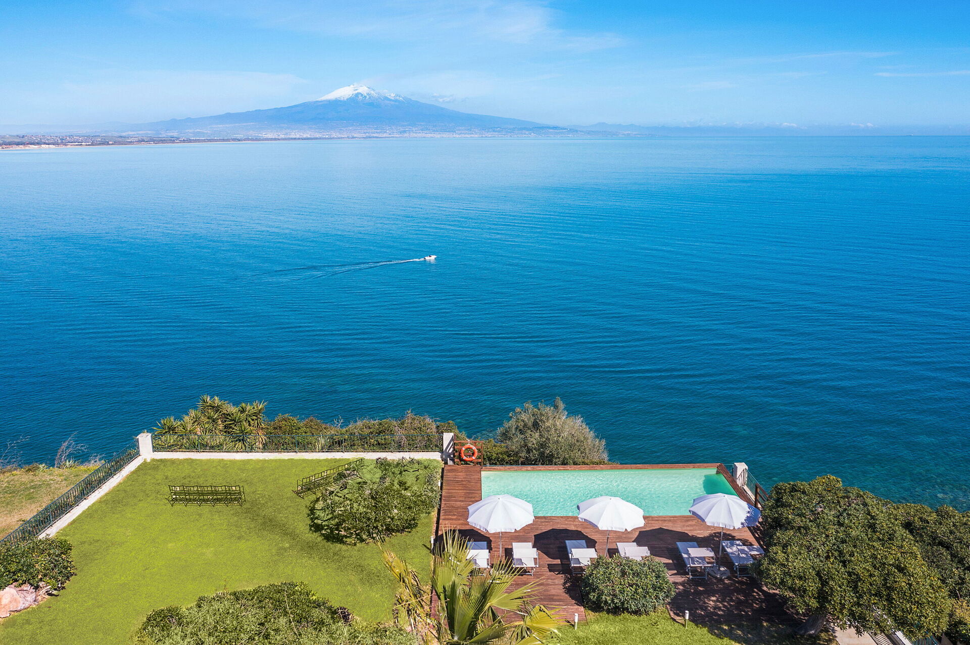 Perched on a cliff above the sea, the property sits in absolute tranquility and offers spectacular views of the sea and Etna.