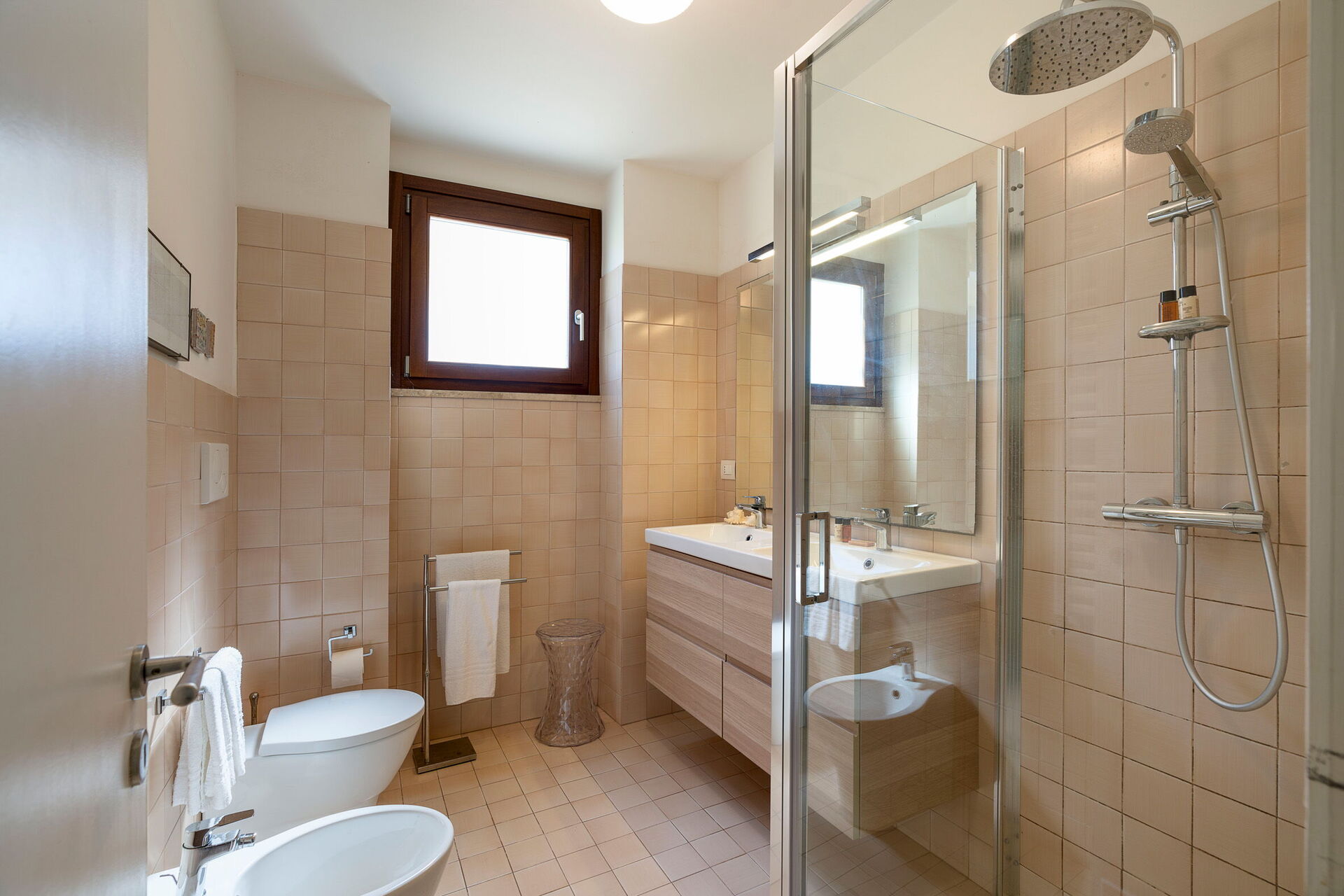 Ground floor : living room (Smart TV) with dining area, kitchen (oven, refrigerator, freezer, dishwasher, microwave, coffee maker), 2 bathrooms with shower, 2 double bedrooms each with a private bathroom with shower, double bedroom (bed can be converted to 2 single beds).