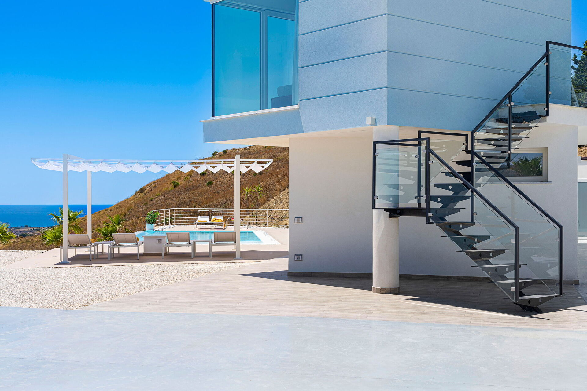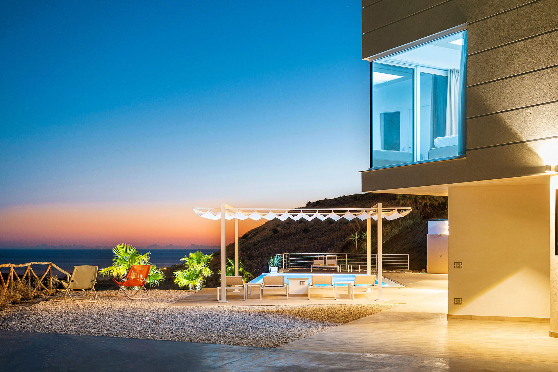 If you are looking for an exclusive vacation villa in Sicily, Villa Domizia is for you. Modern and refined, it has 4 bedrooms to accommodate up to 8 people. The light and panoramic views are this marvelous villa’s best features: both inside and outside there are spectacular views of the sea and the surrounding countryside. Outside, you can relax in the large saltwater pool with a whirlpool zone.