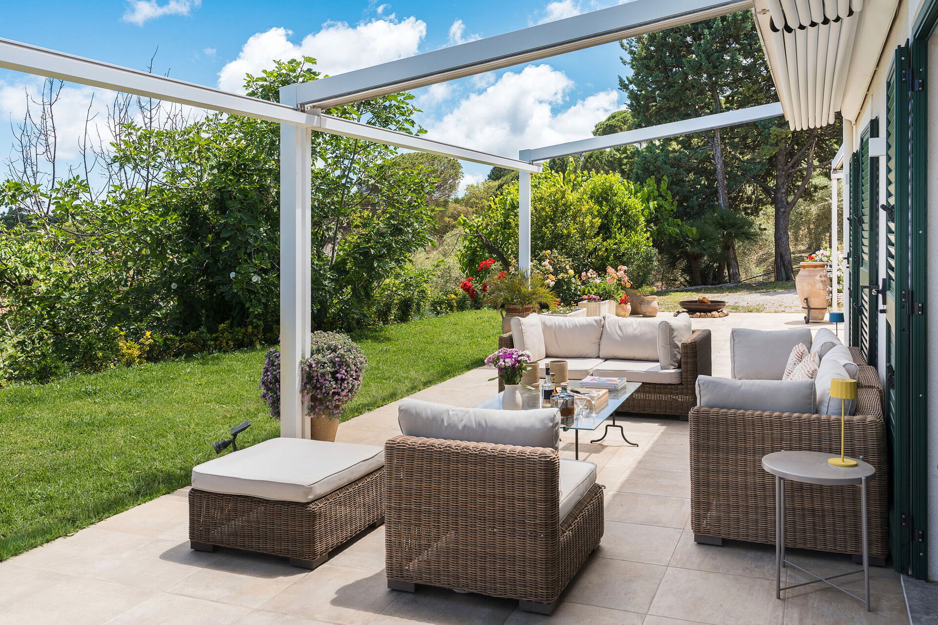 - veranda with pergola equipped with table and chairs for outdoor dining
