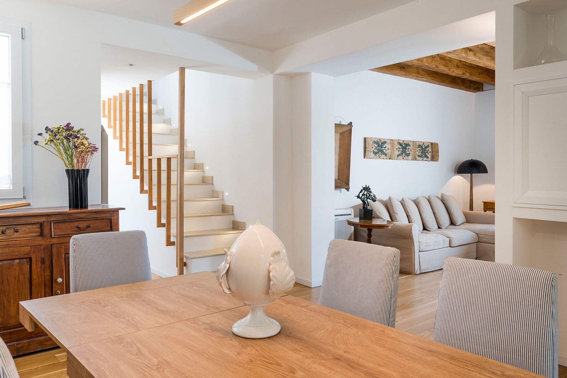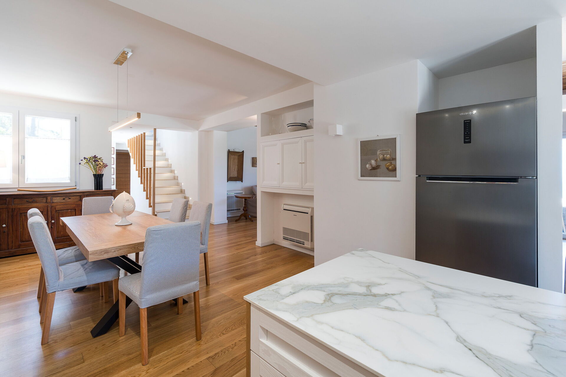 Ground floor: living room (fireplace) with kitchen (oven, fridge, freezer, dishwasher, hob, microwave, toaster, espresso coffee machine) and dining area, laundry room, double bedroom (bed size: 160x200 cm), bathroom with shower, bedroom with French bed, wc.