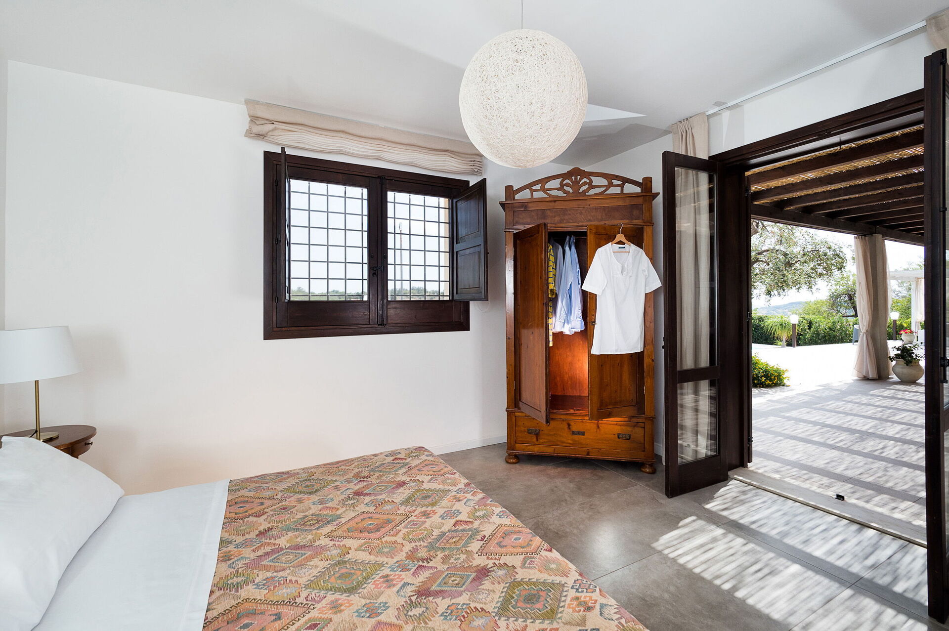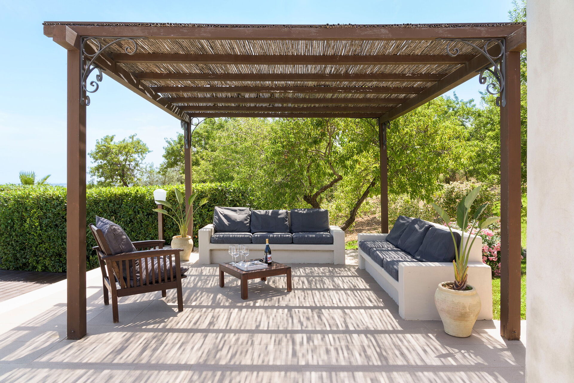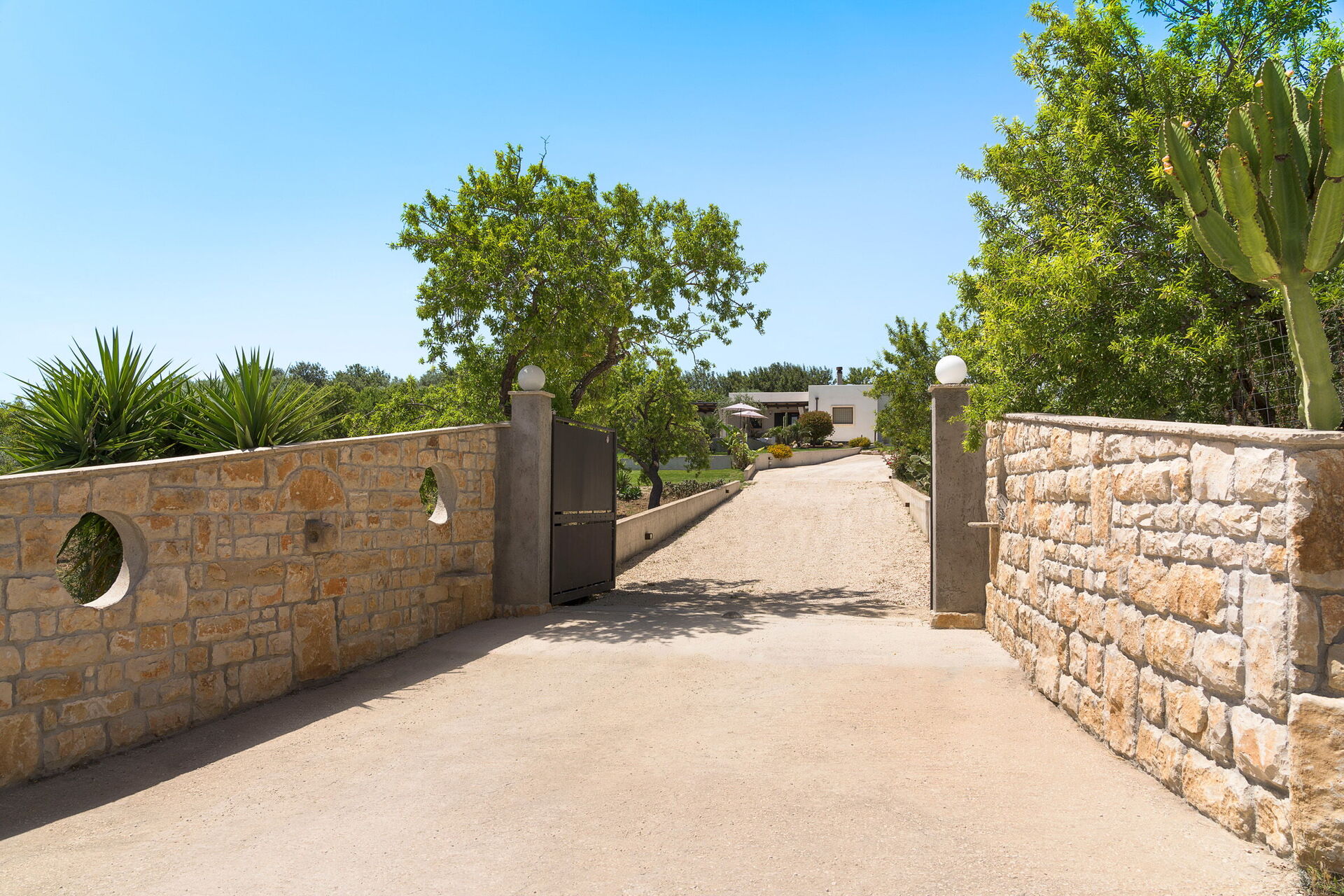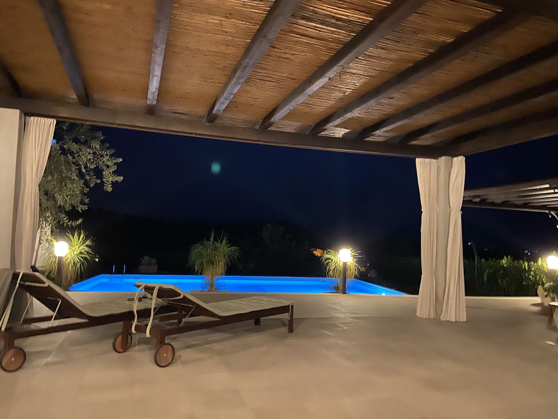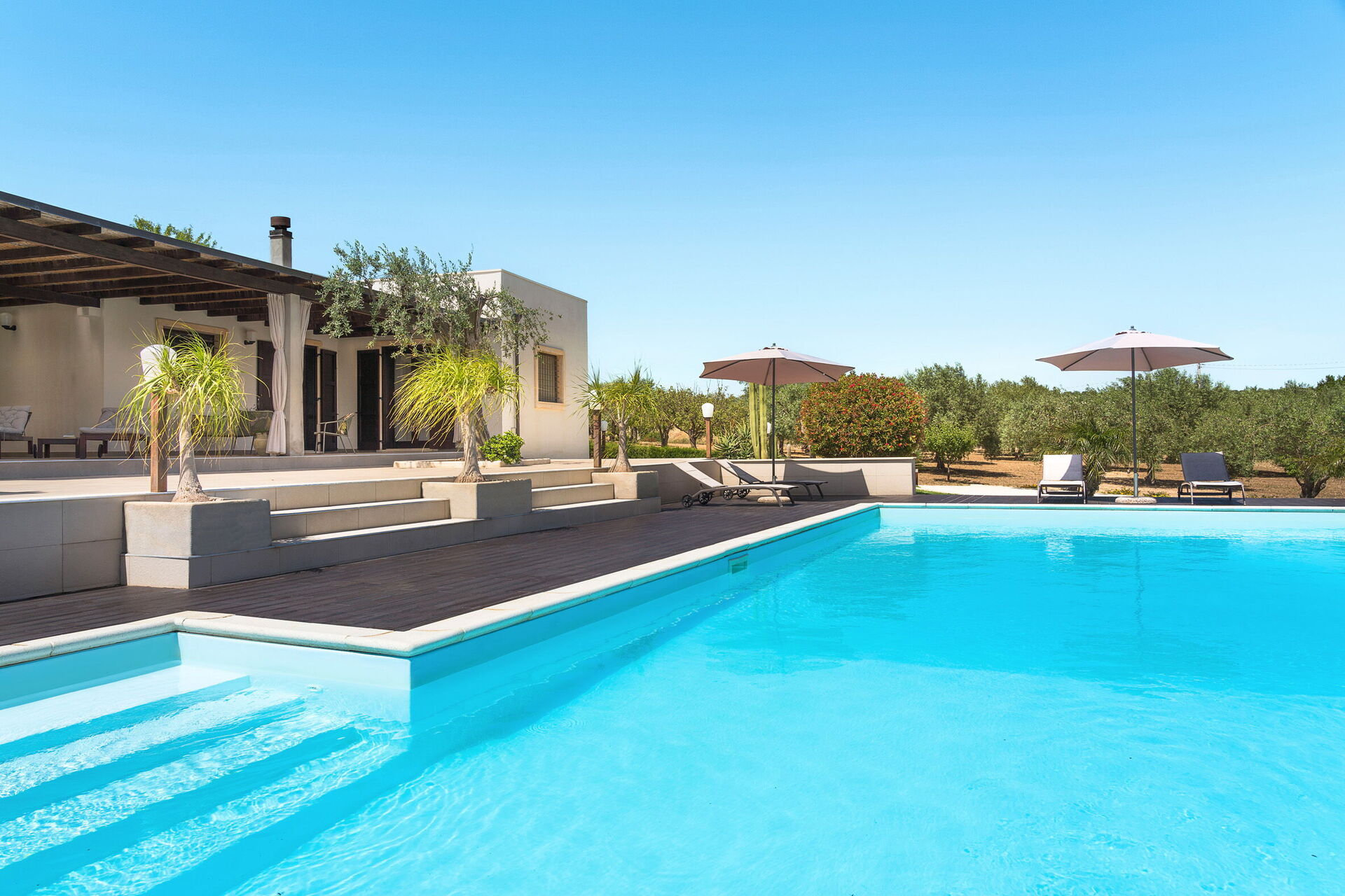 Surrounded by a large natural park of olive and almond trees, the holiday villa rental enjoys enchanting views across the rural landscape, especially from the large terrace, partly covered and equipped for al fresco dining, from the sun terrace and the salt water swimming pool (without chlorine).