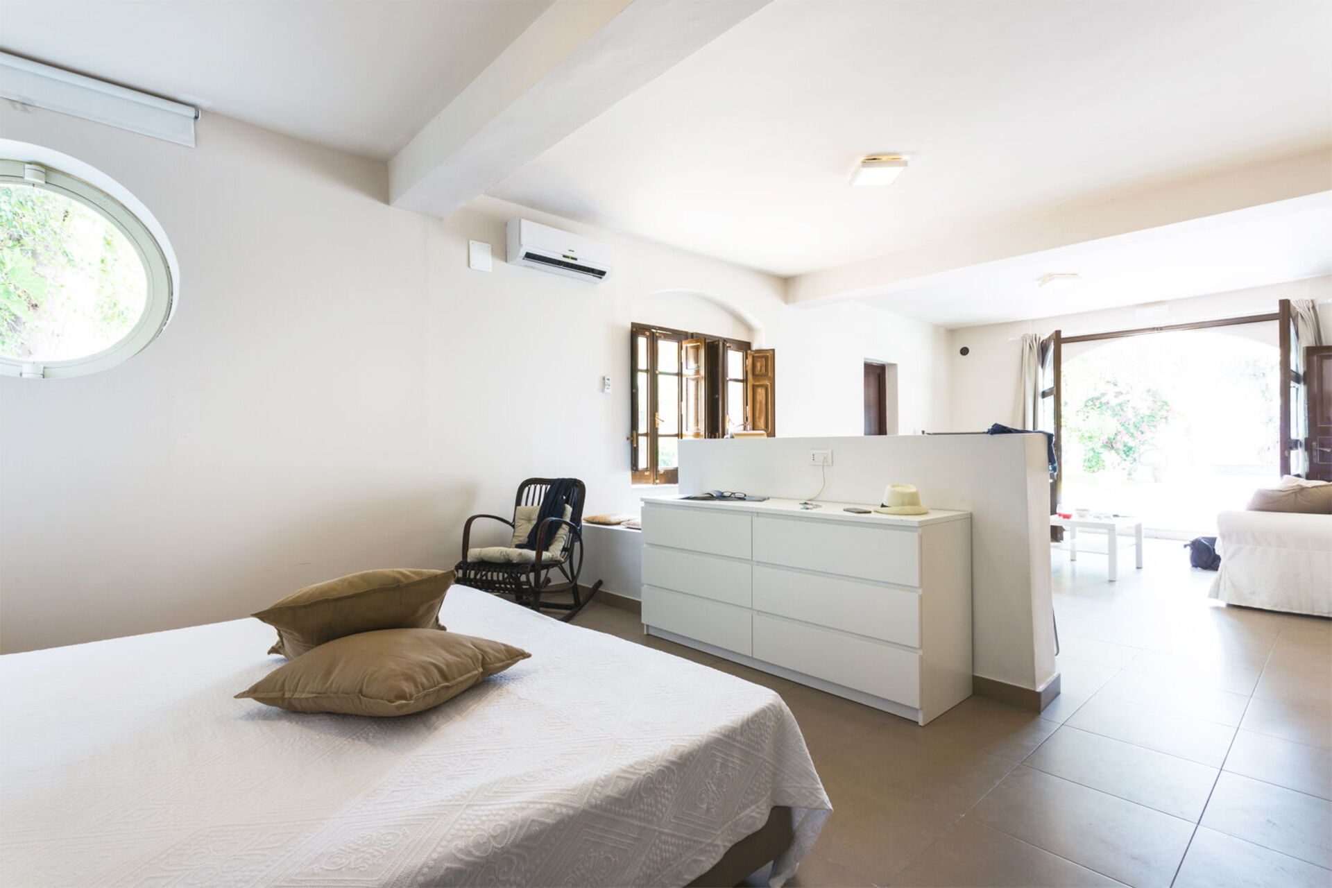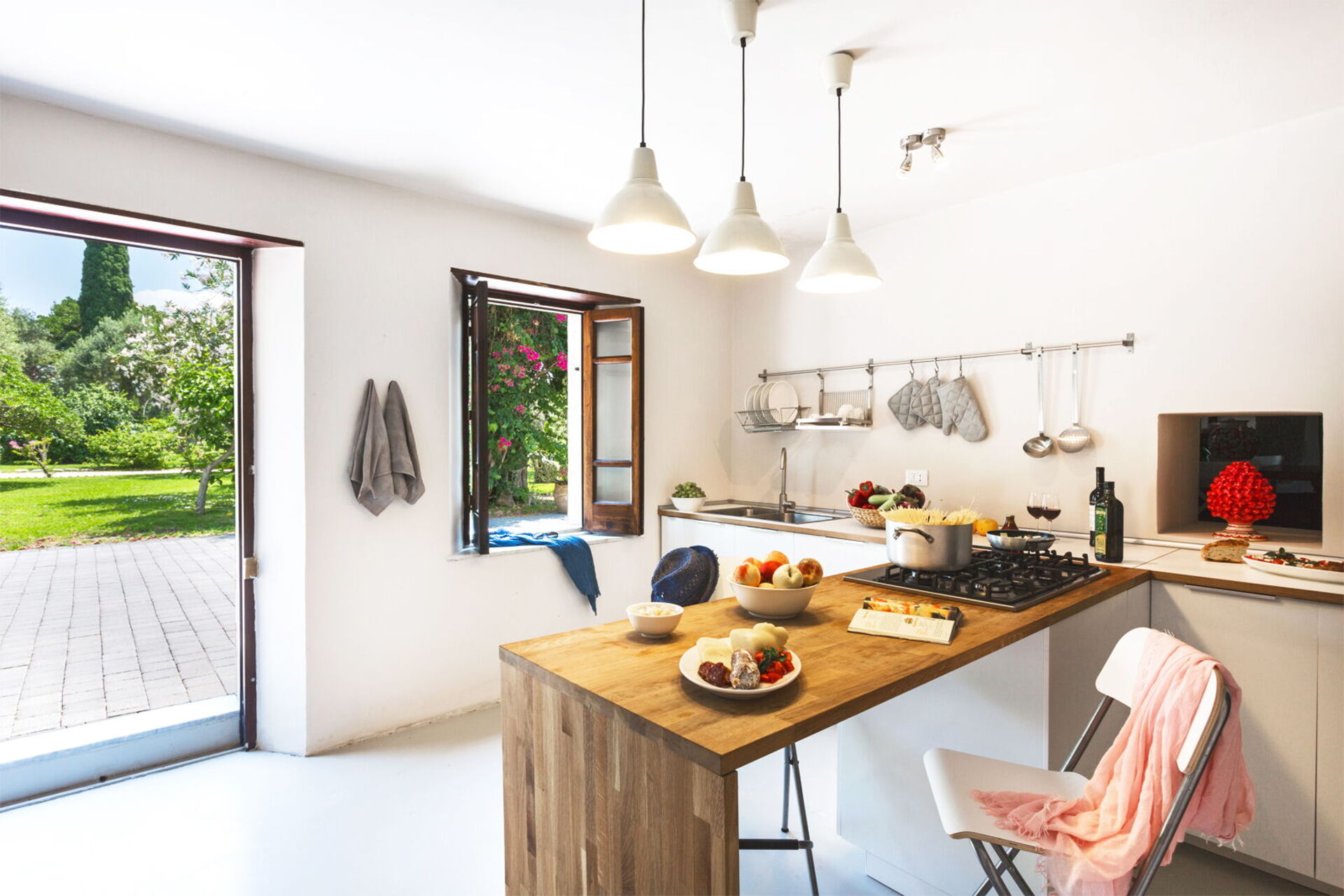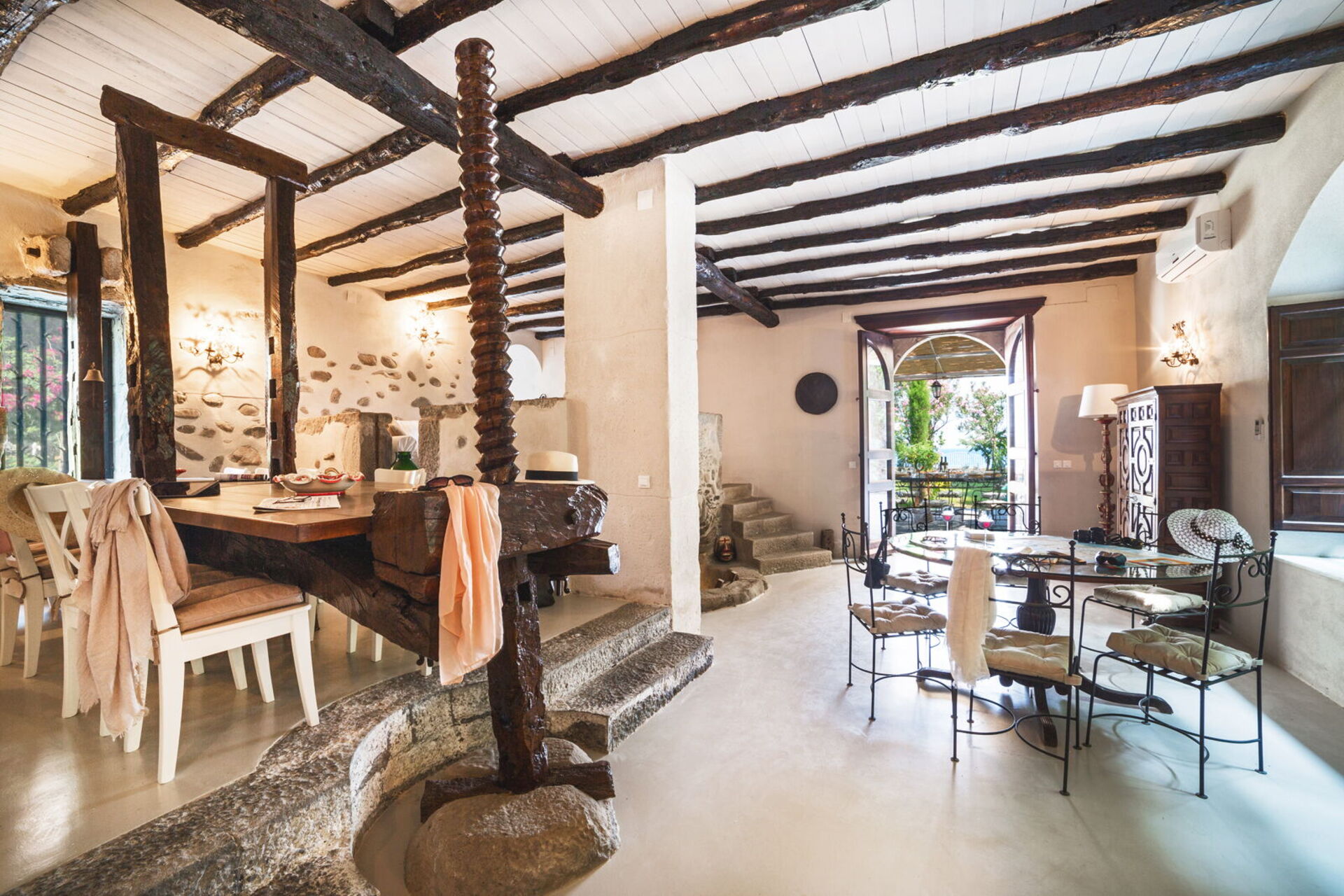 It is nestled in an extensive garden lush with palm trees and centuries-old olive trees. The tastefully furnished interiors have preserved some truly unique elements, like the press which holds up the dining table: a clear link to the villa’s agricultural past.
