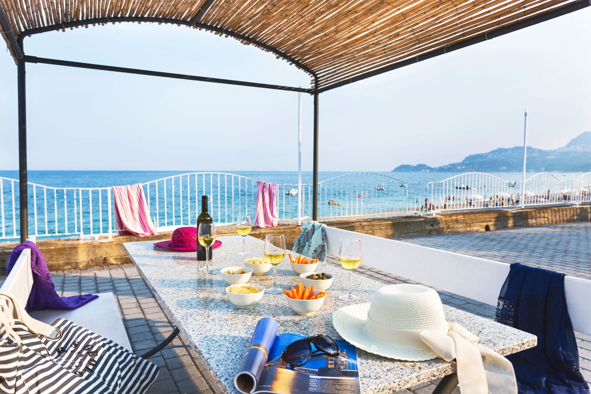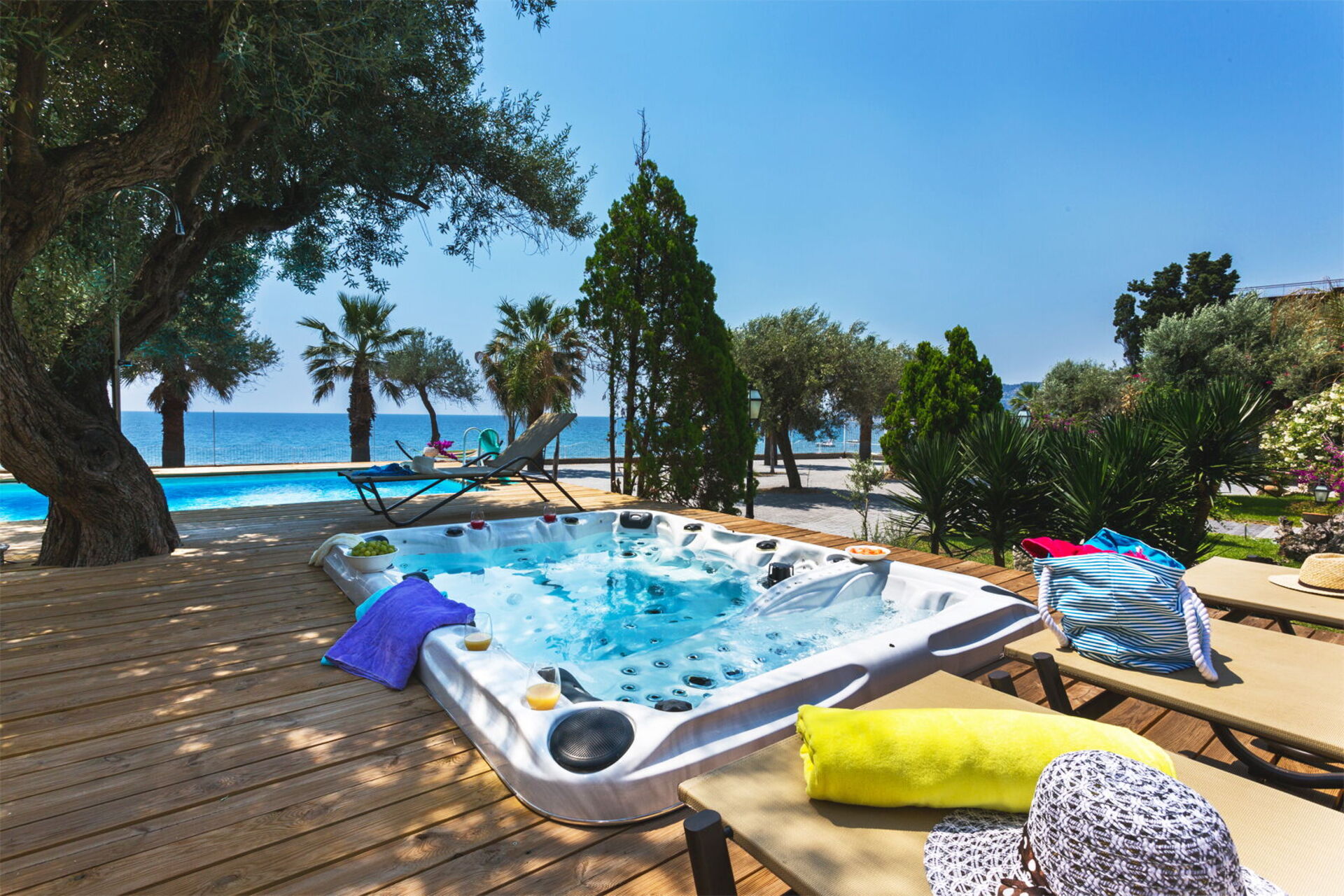 At guests' disposal there is also an outdoor hot tub seat framed by the sea horizon in the background.