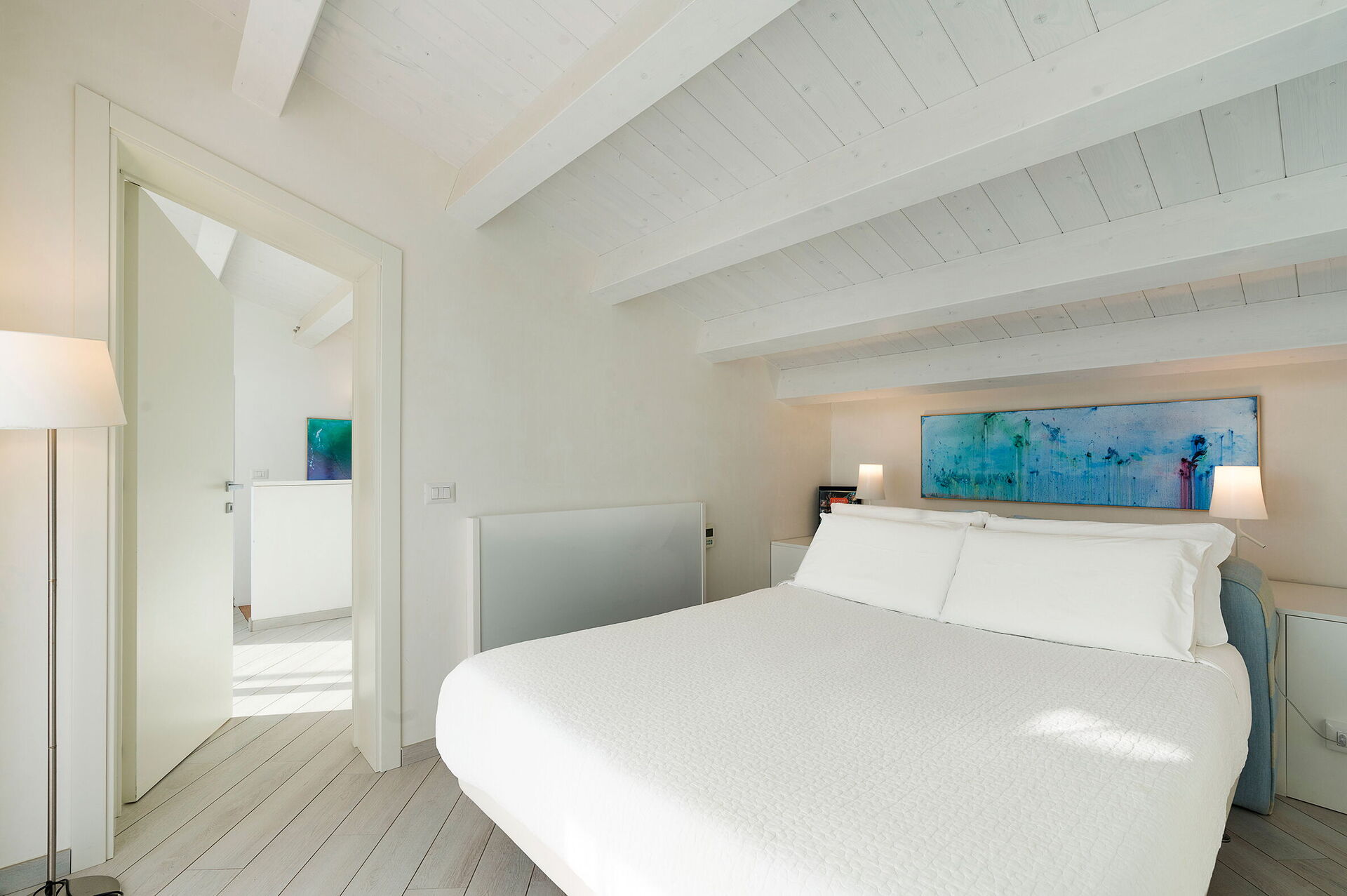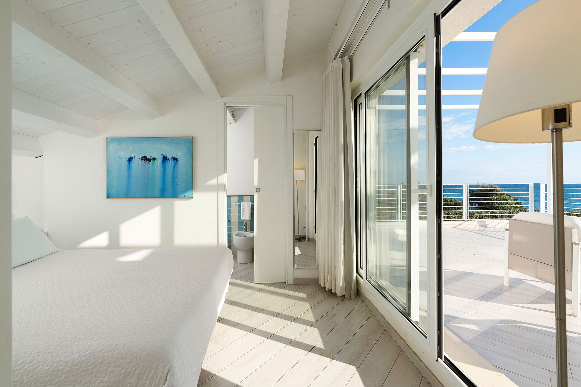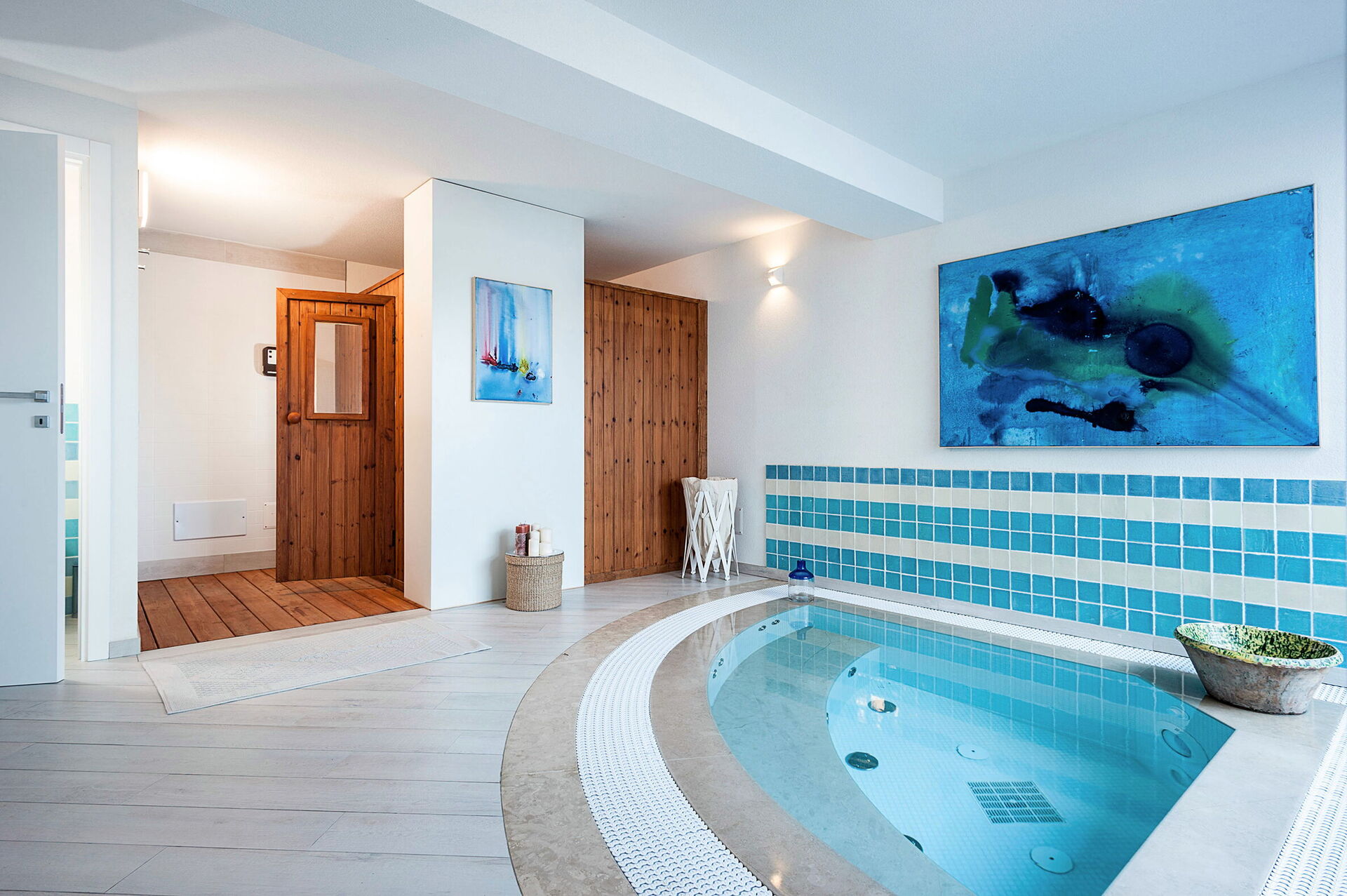 This luxury, contemporary villa boasts large, panoramic terraces and a wellness room with sauna and Jacuzzi.