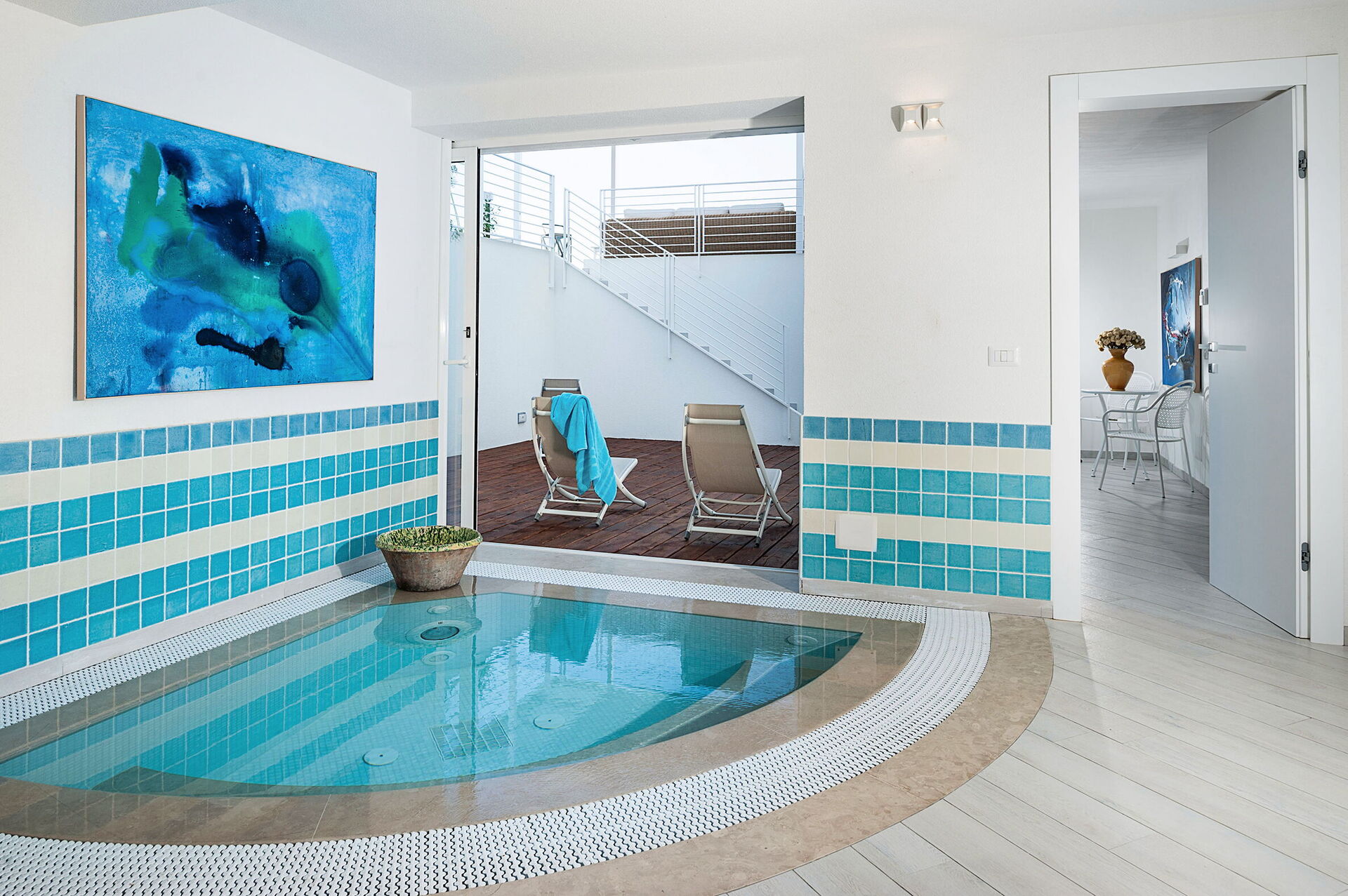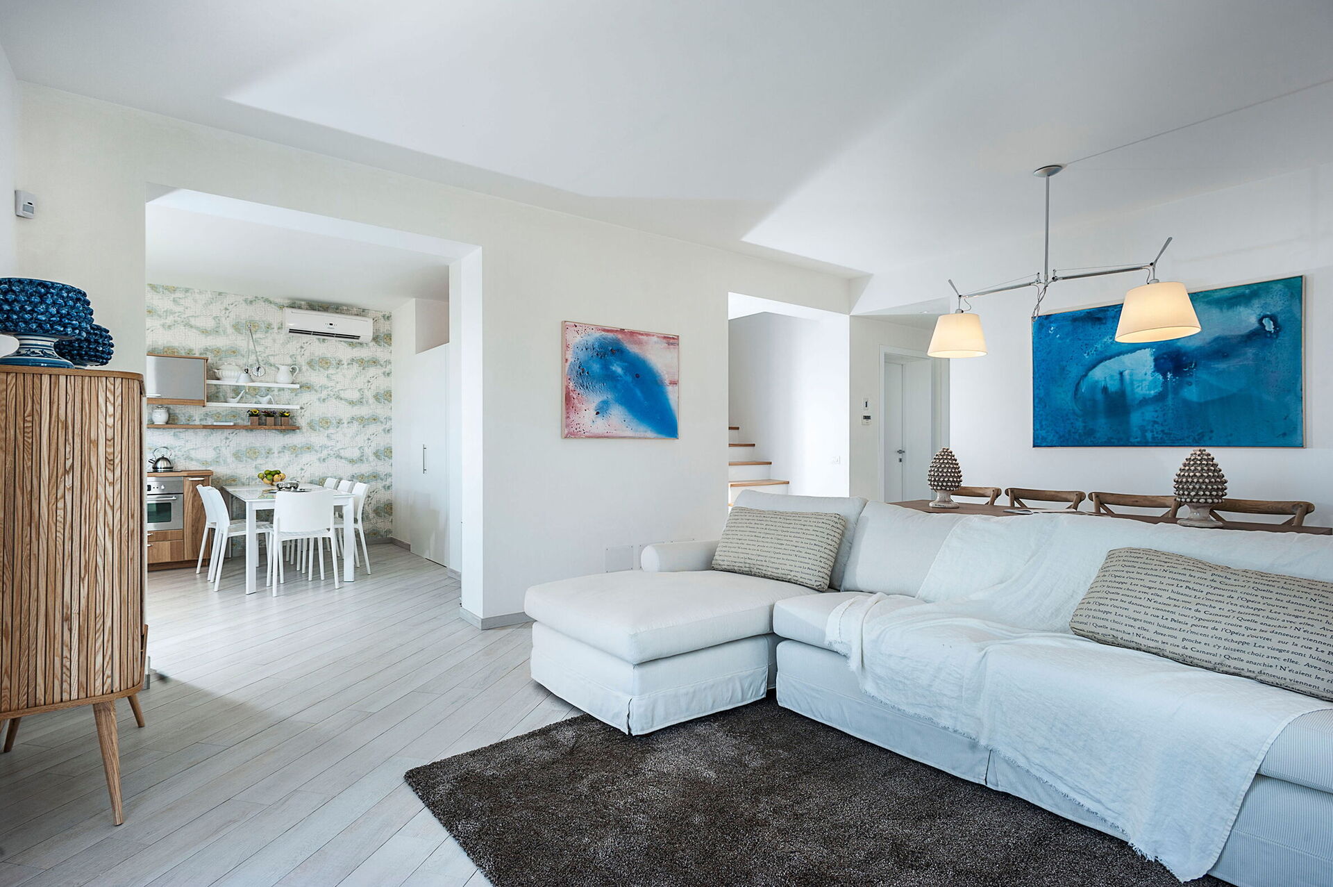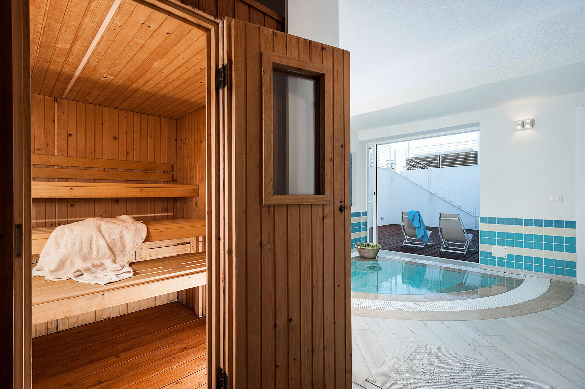 This luxury, contemporary villa boasts large, panoramic terraces and a wellness room with sauna and Jacuzzi.